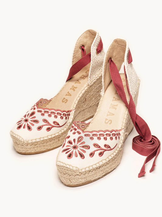 Nossas alpargatas com fitas são super confortáveis! Alpargatas artesanais costuradas à mão em La Rioja por nossos mestres artesãos. Alpargatas sustentáveis, feitas com materiais reciclados, naturais, orgânicos e uma seleção dos melhores couros certificados pelo "Leather Working Group". Alpargatas com fitas confortáveis graças à palmilha acolchoada que cobre toda a planta do pé. Alpargatas confortáveis com salto anabela de 10 centímetros que você usará o dia todo. Suas alpargatas com fitas podem ser amarradas de diferentes maneiras. Alpargatas com um toque rural chique, atemporais, essenciais no guarda-roupa, com um toque de cor e originalidade.