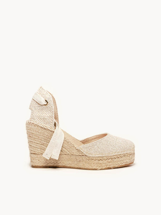 Sandália Anabela Alta Cala Linho Metal Prata