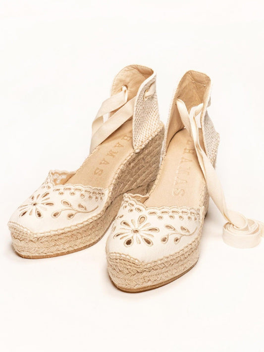 Sandália Anabela Média Romero Tecido Bordado Cru