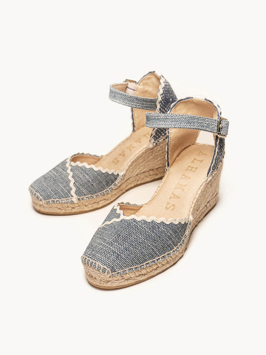 Sandália Anabela Média Jara Linho Mesclado Azul Jeans