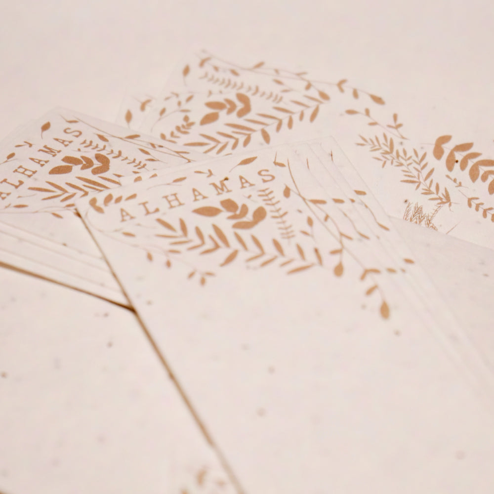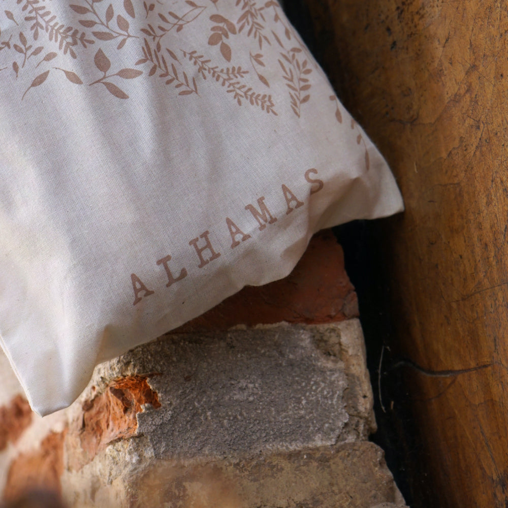 Hemos decidido emplear una única pieza de cartón más pequeña y que se adapte mejor a nuestro producto, evitando así el exceso de material. La caja está hecha de cartón 100% reciclado, sin ningún tipo de adhesivo y las tintas que la decoran son tintas a base de agua. La decoramos para tí y que así puedas darle una segunda vida, guardando tus Alhamas o tus objetos personales con un toque rural chic.