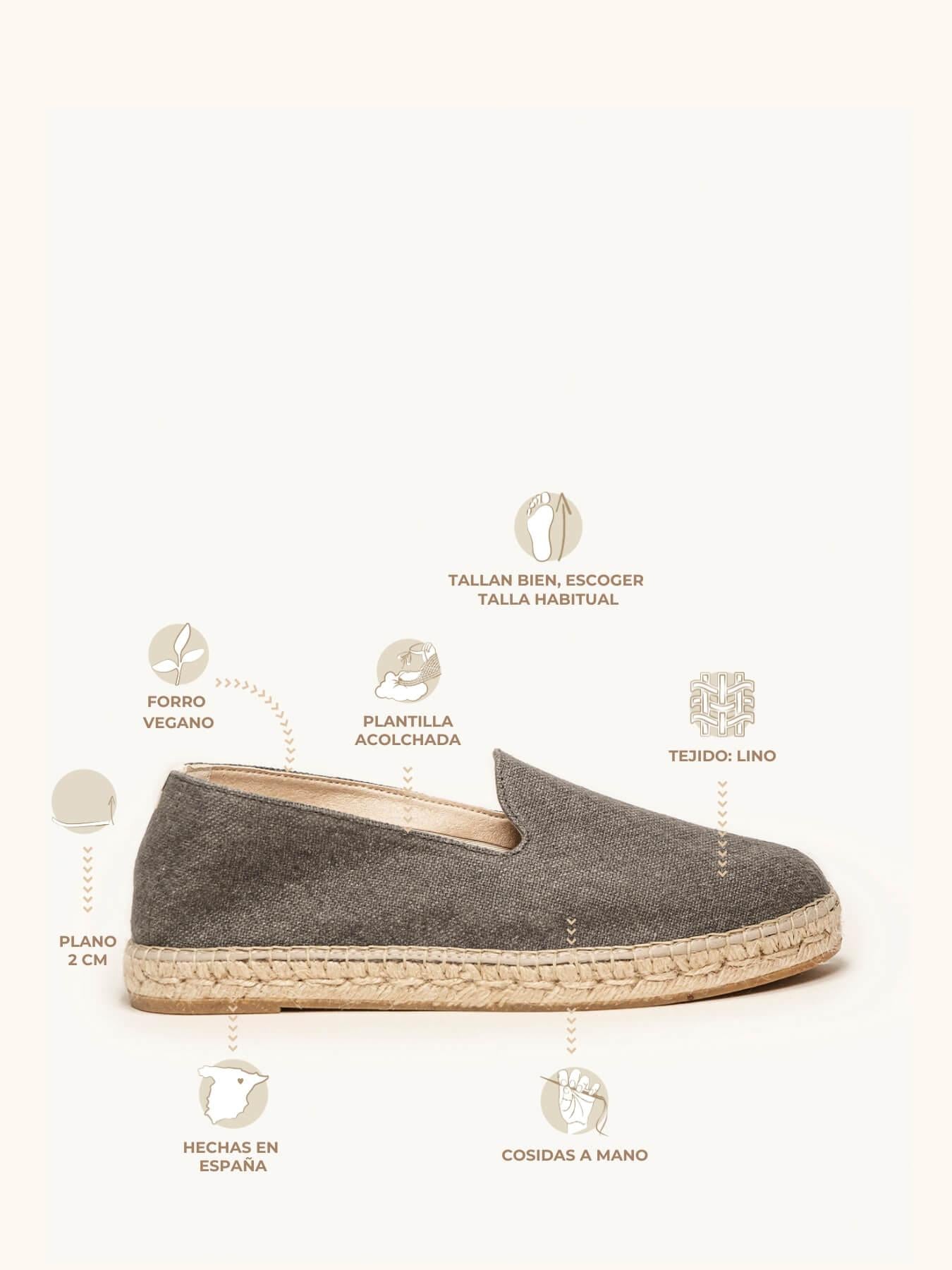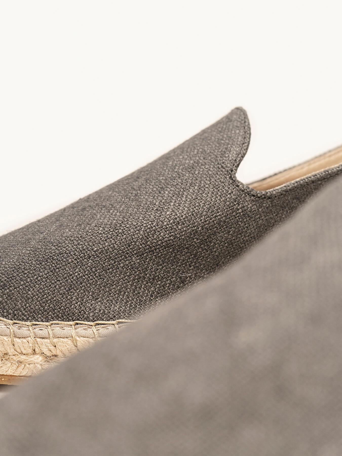- Anabela de trança de juta natural com sola de borracha reciclada misturada com fibras naturais.