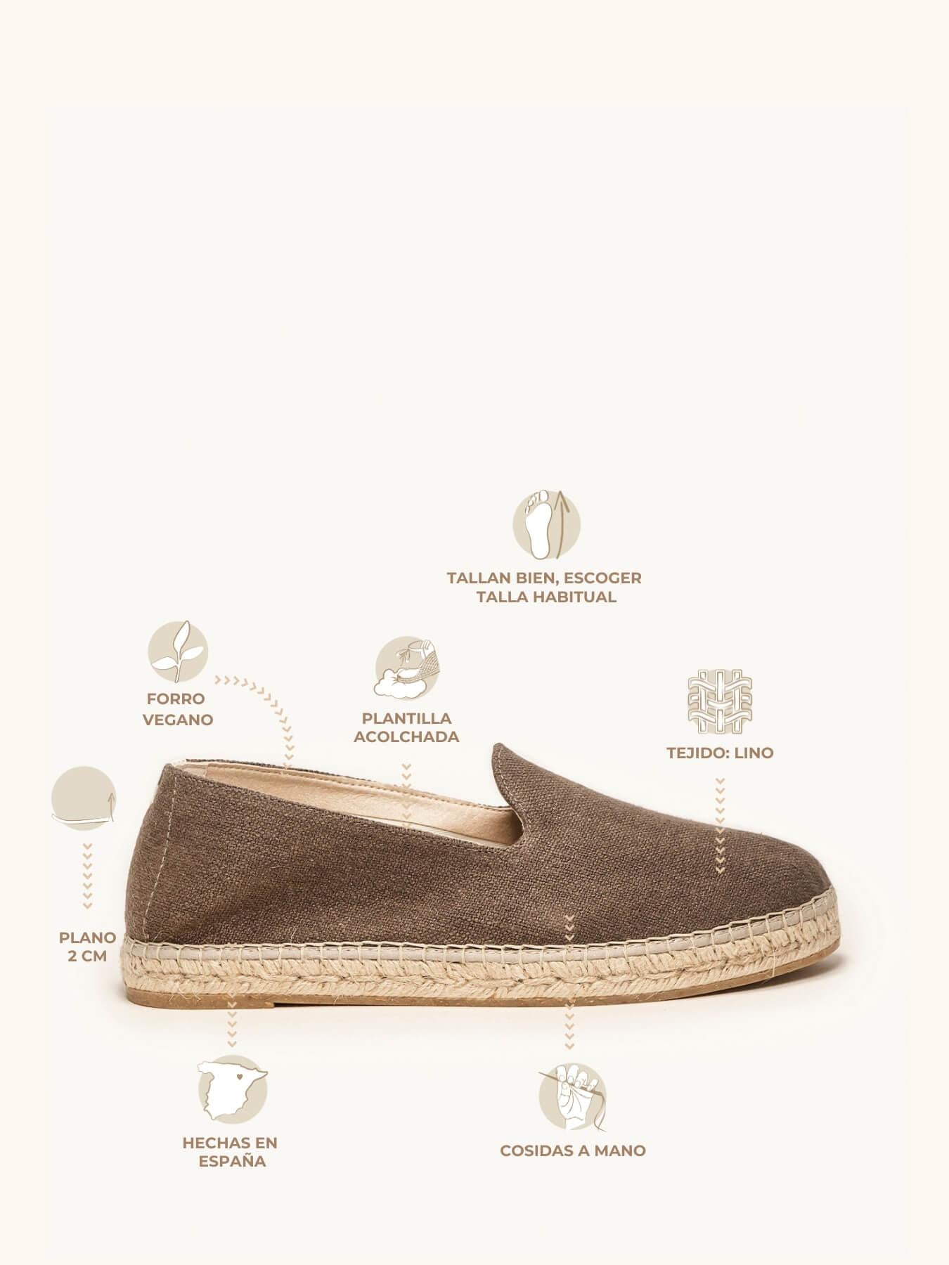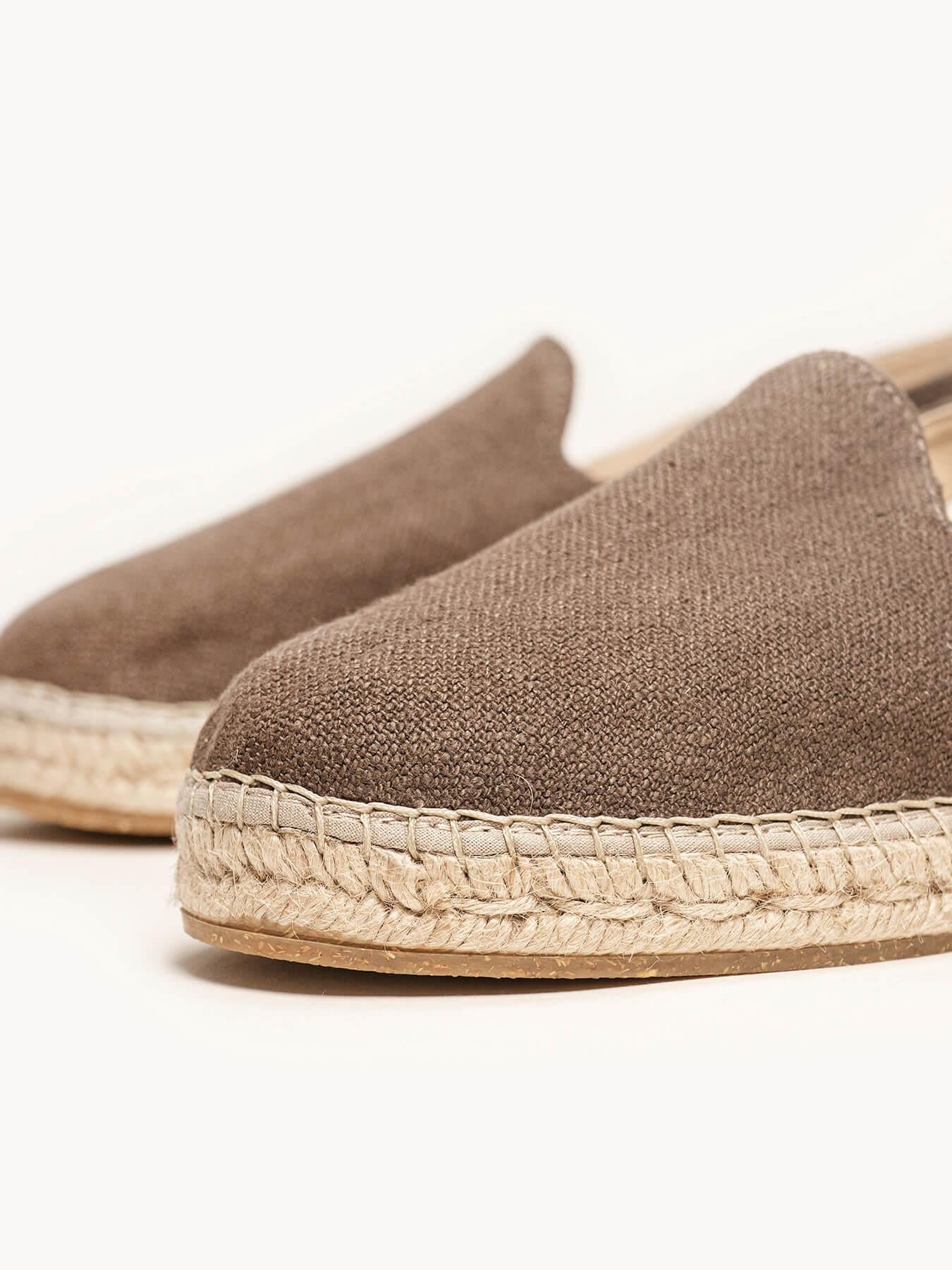 - Anabela de trança de juta natural com sola de borracha reciclada misturada com fibras naturais.