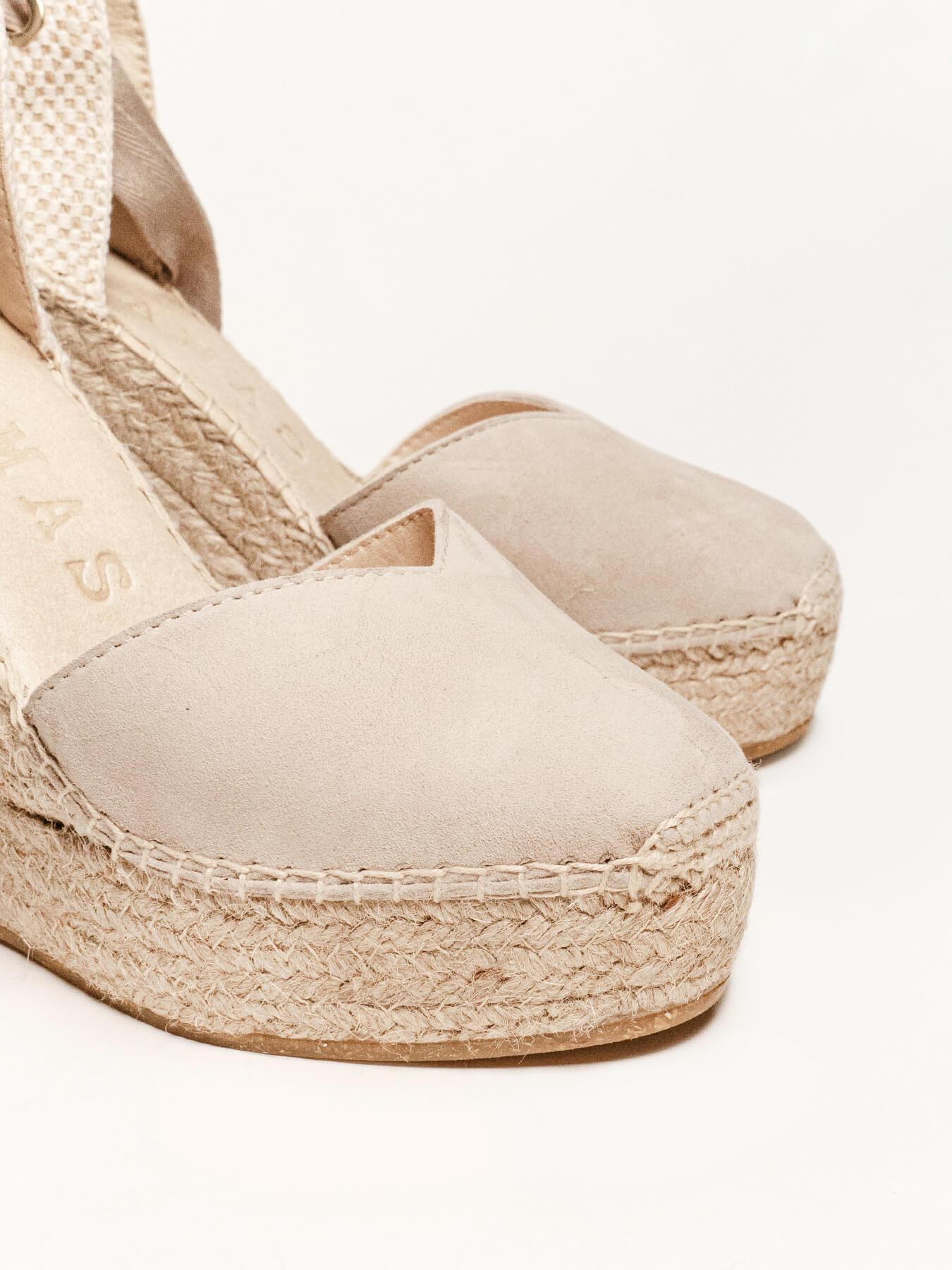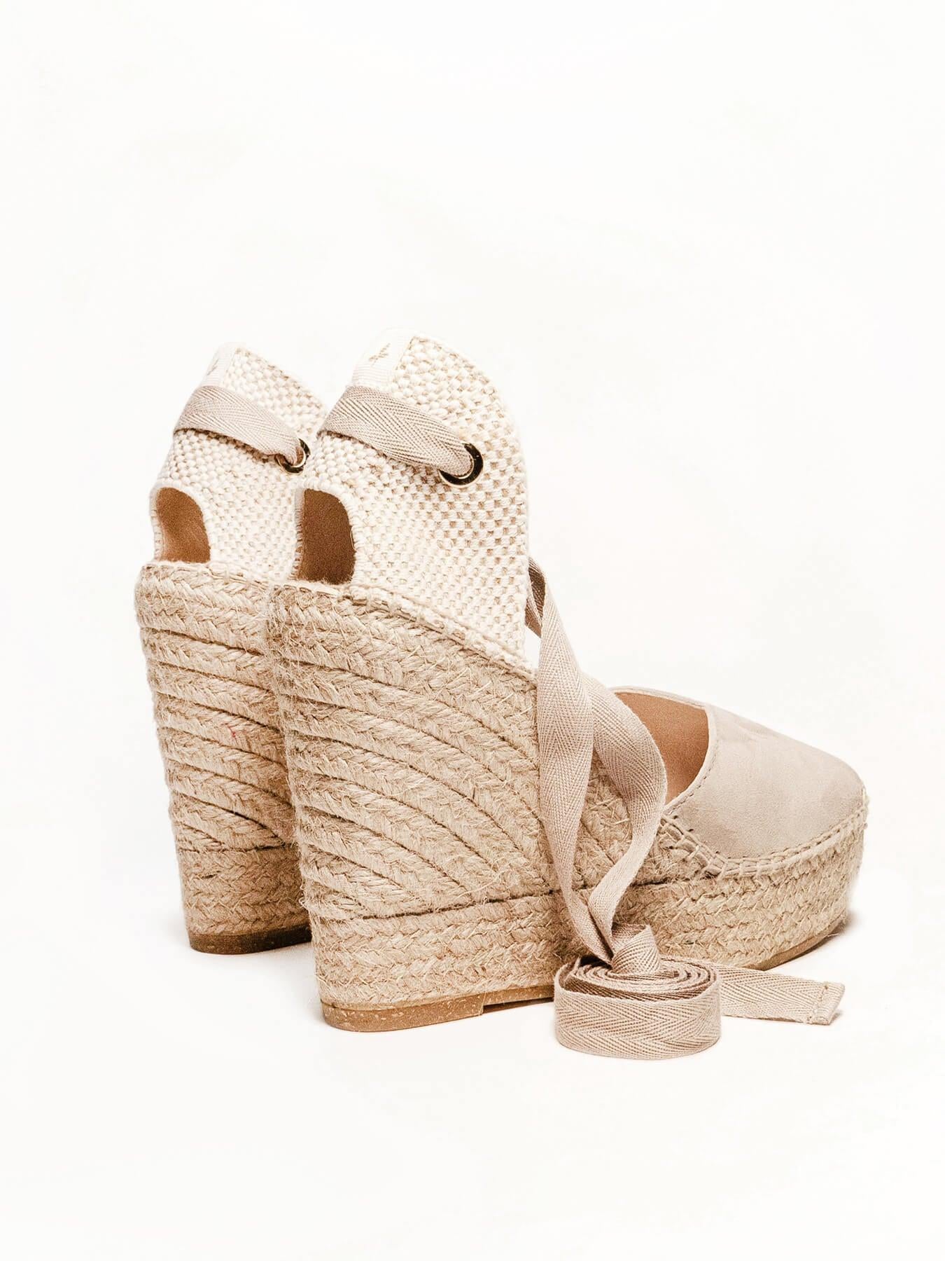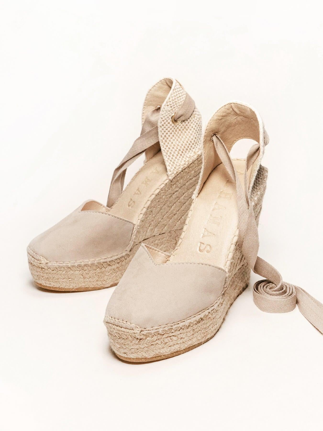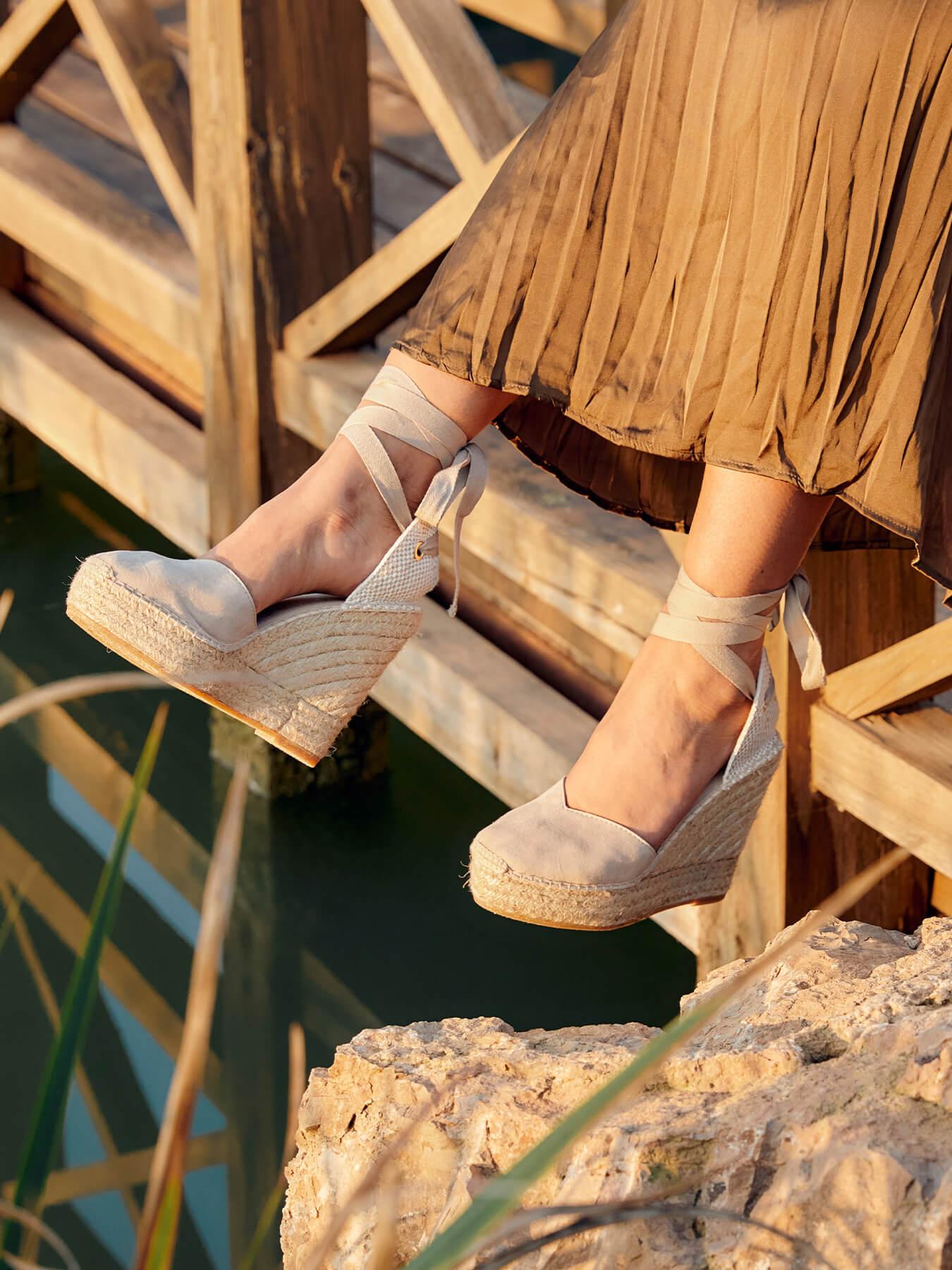 A sandália anabela alta Romero é o nosso modelo mais icônico. Uma sandália valenciana com decote em coração e fitas que você poderá usar em looks especiais e também no dia a dia. Você pode dar um toque especial porque as fitas podem ser trocadas.