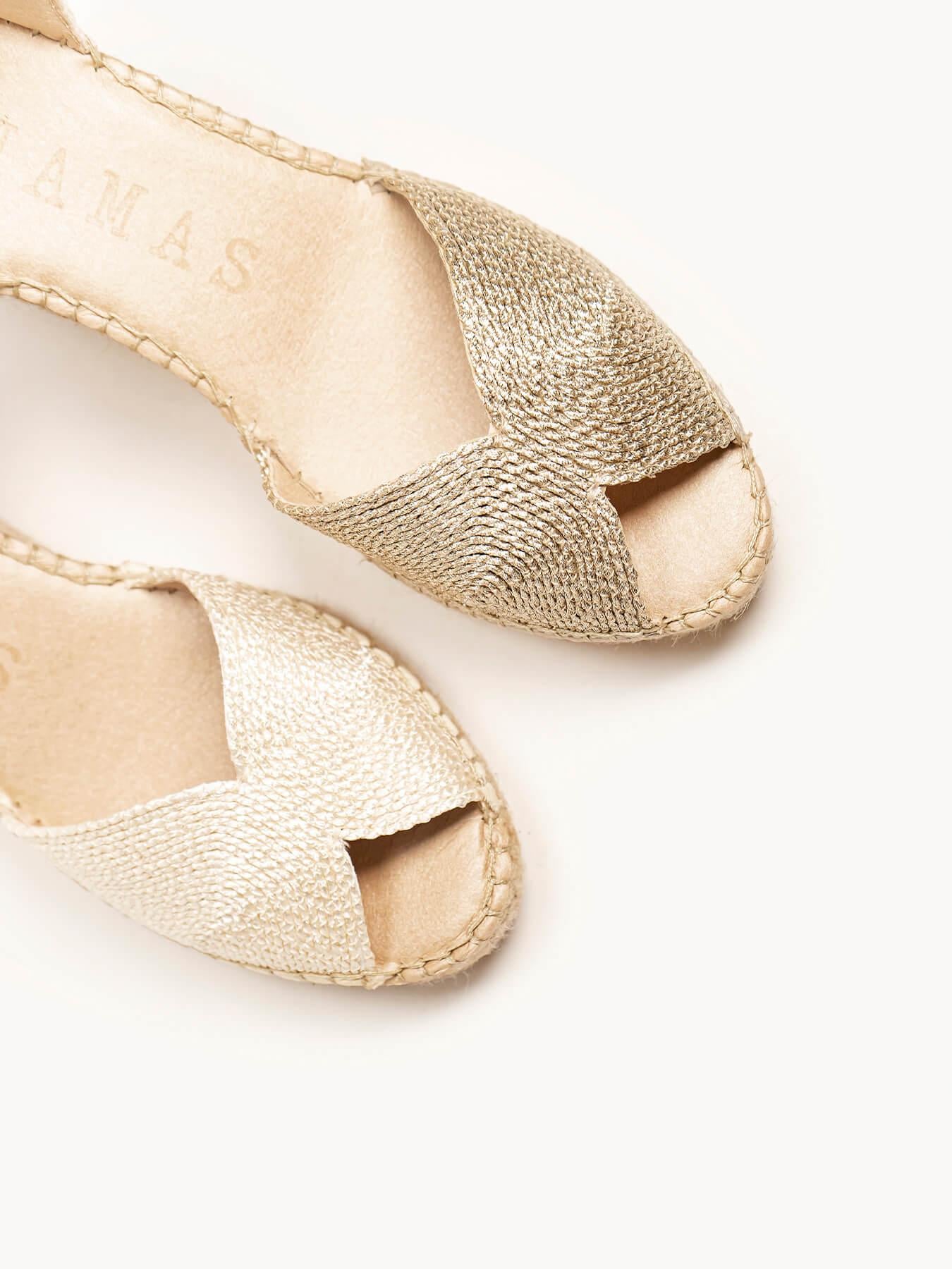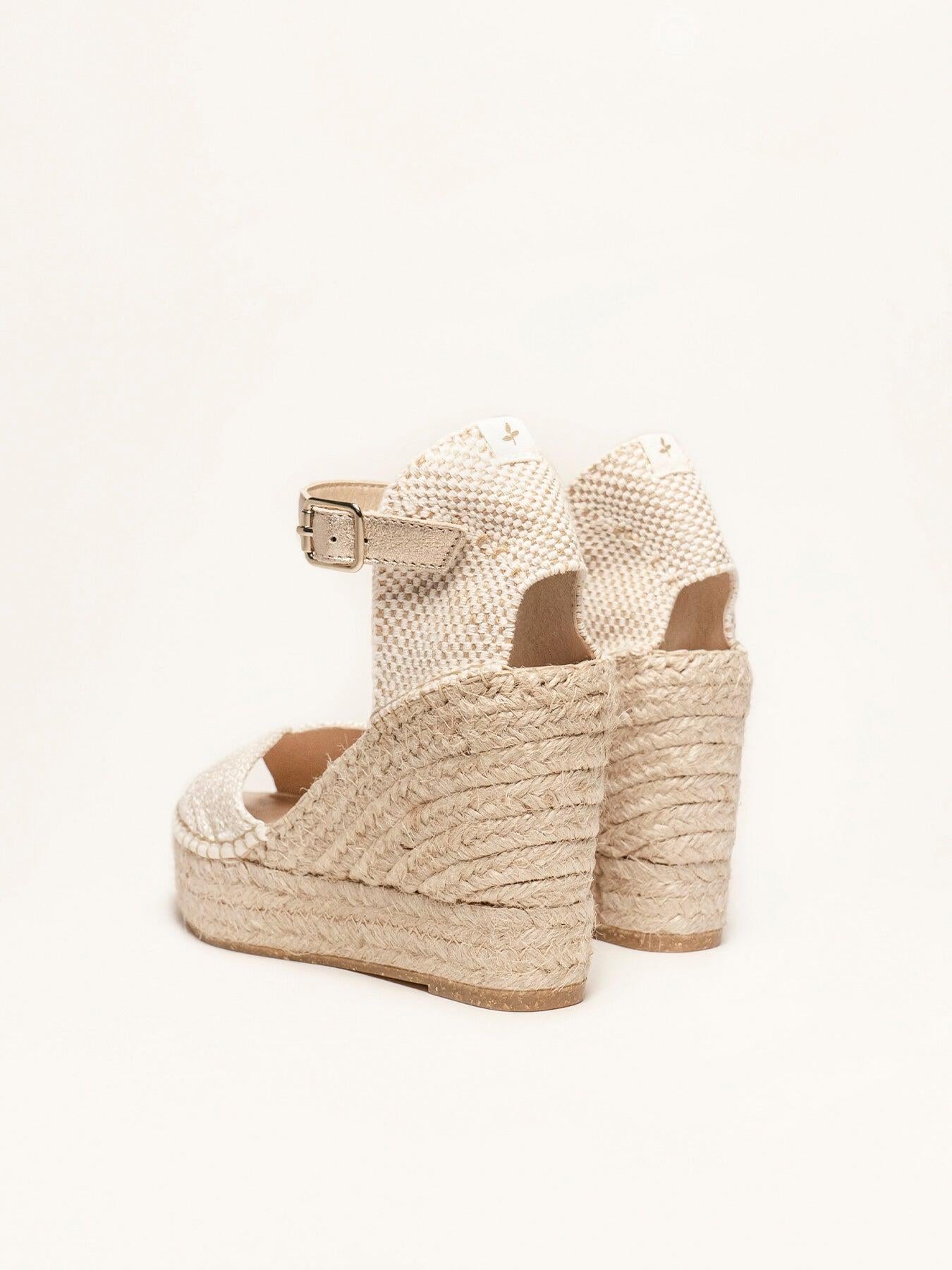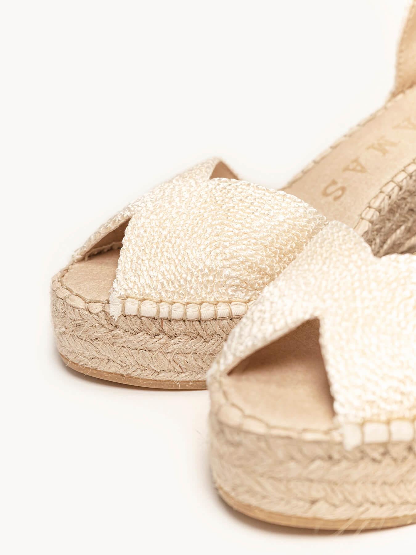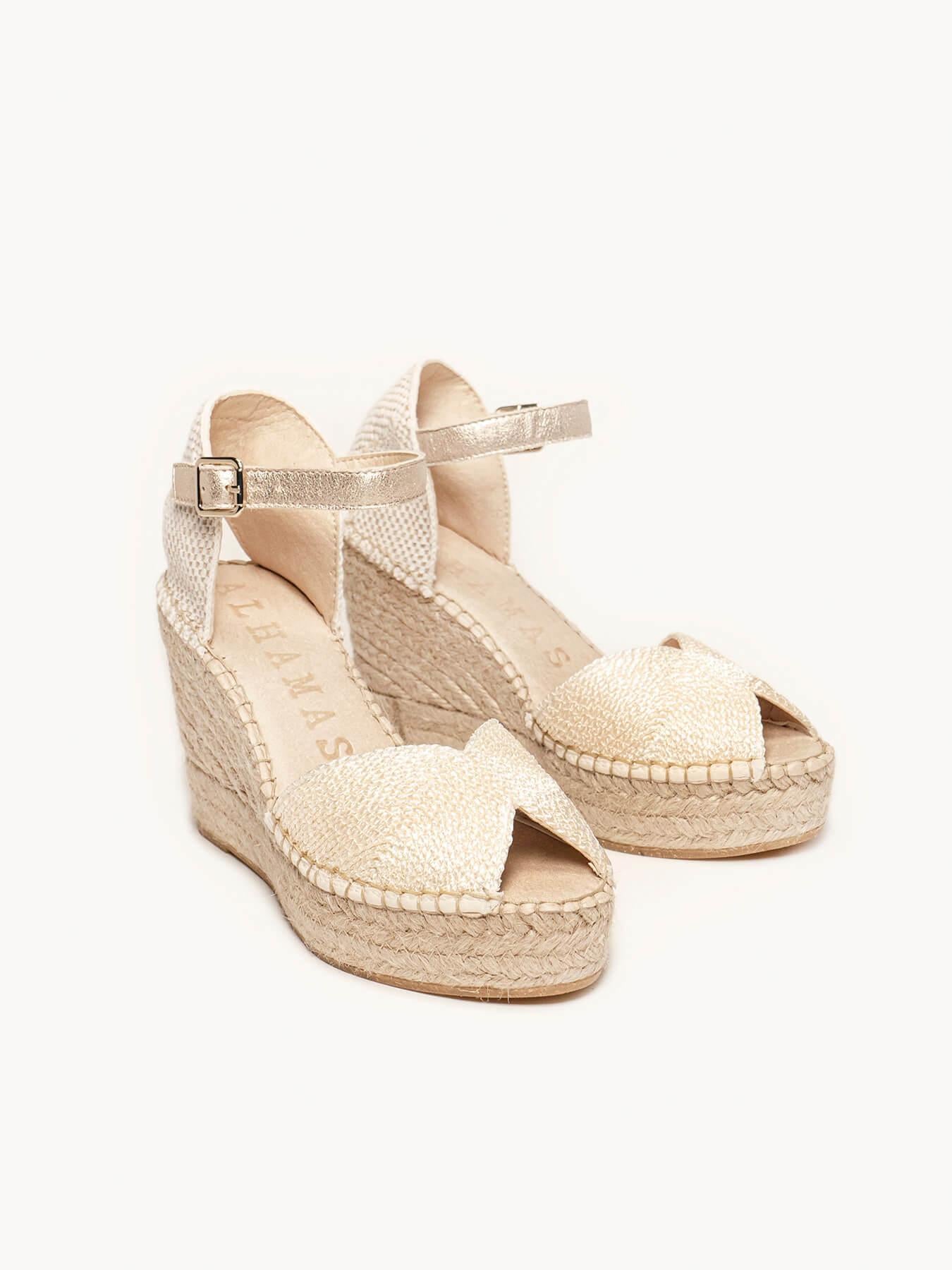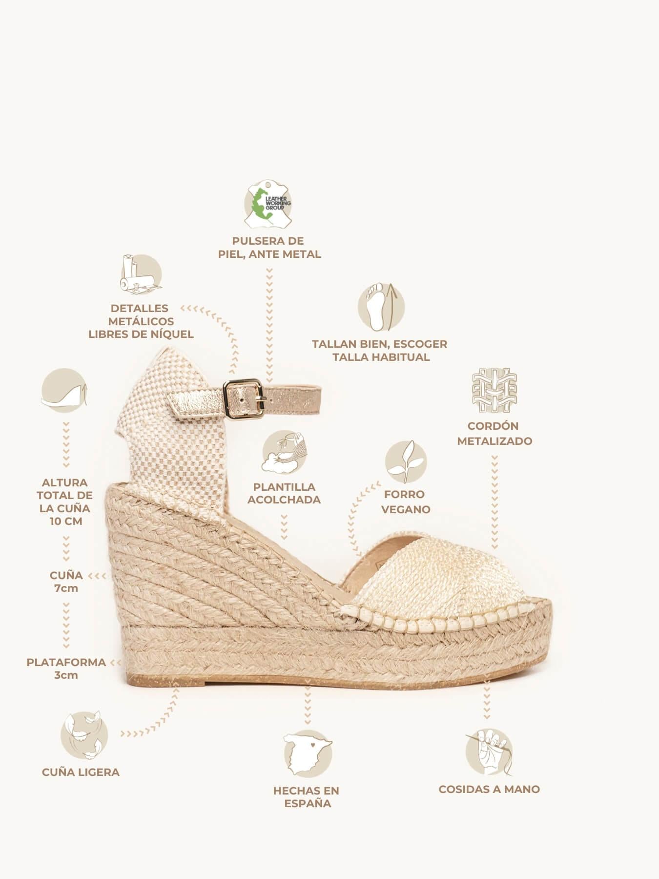 - Anabela trançada de juta natural com sola de borracha reciclada misturada com fibras naturais.