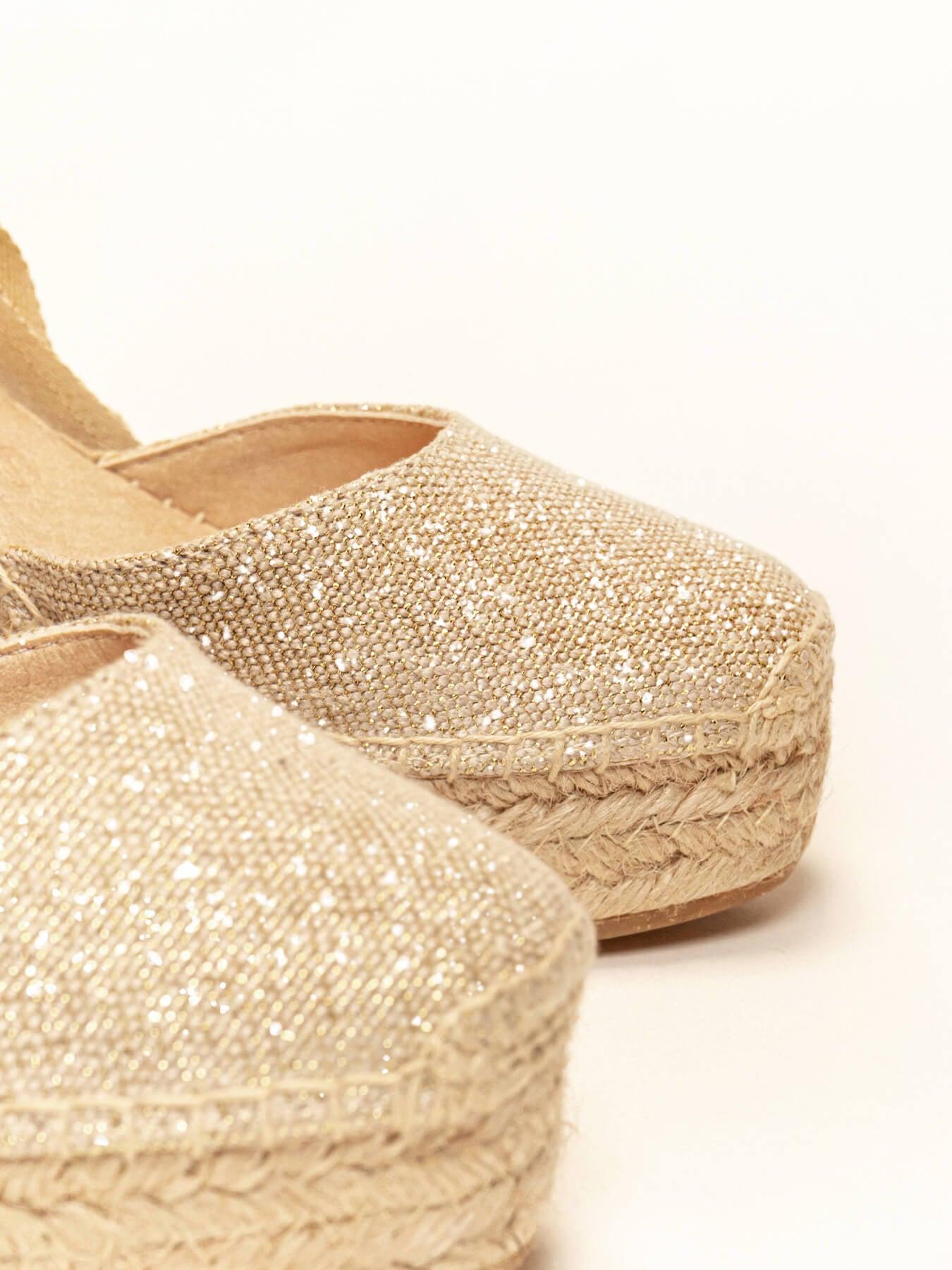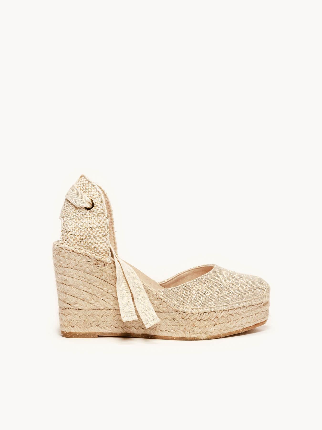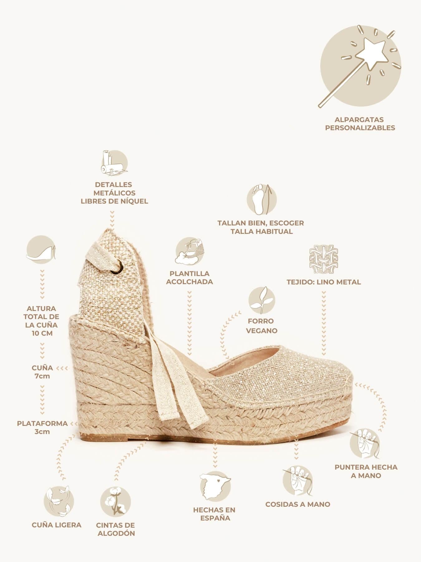 Sandália Anabela Alta Cala Linho Dourado Metalizado
