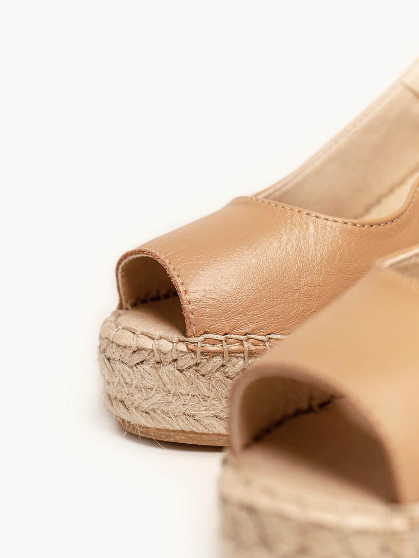 - A Napa da sandália Clavel está certificada pelo Leather Working Group (uma organização que promove práticas ambientais sustentáveis). O forro e a palmilha são de microfibra respirável e antibacteriana. Anabela de trança de juta natural com sola de borracha reciclada misturada com fibras naturais. Elementos metálicos livres de níquel. Linha de algodão costurada à mão.