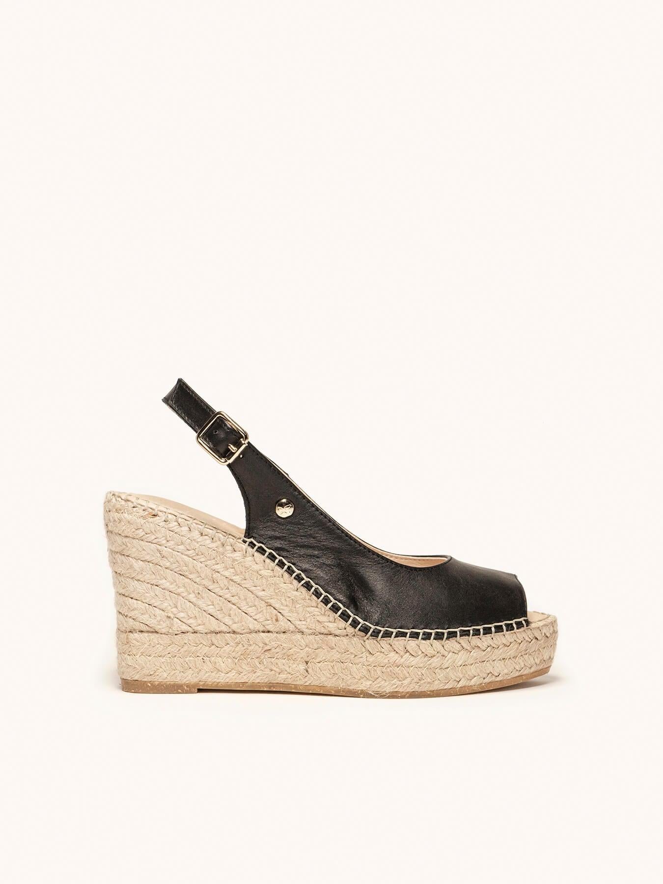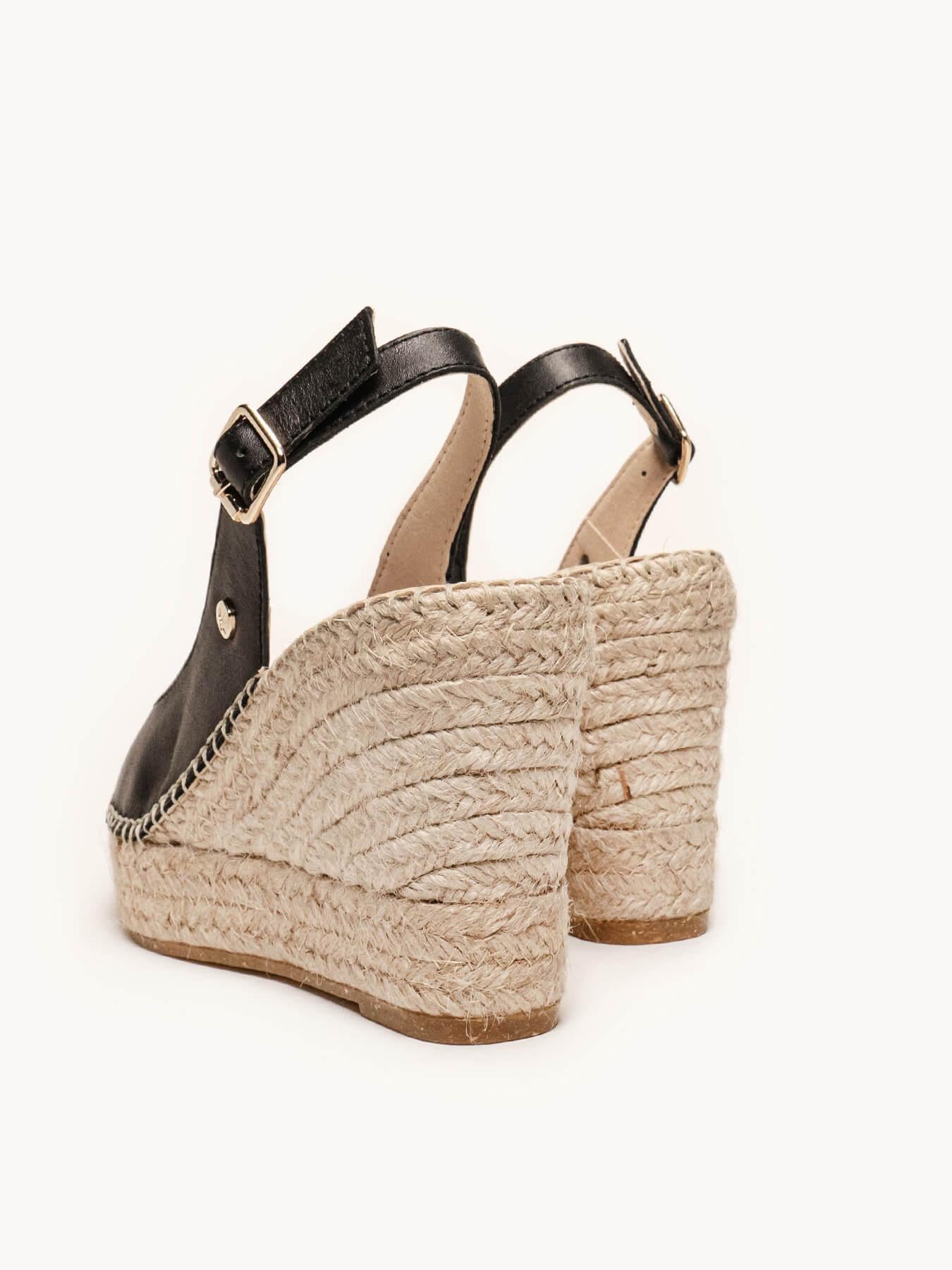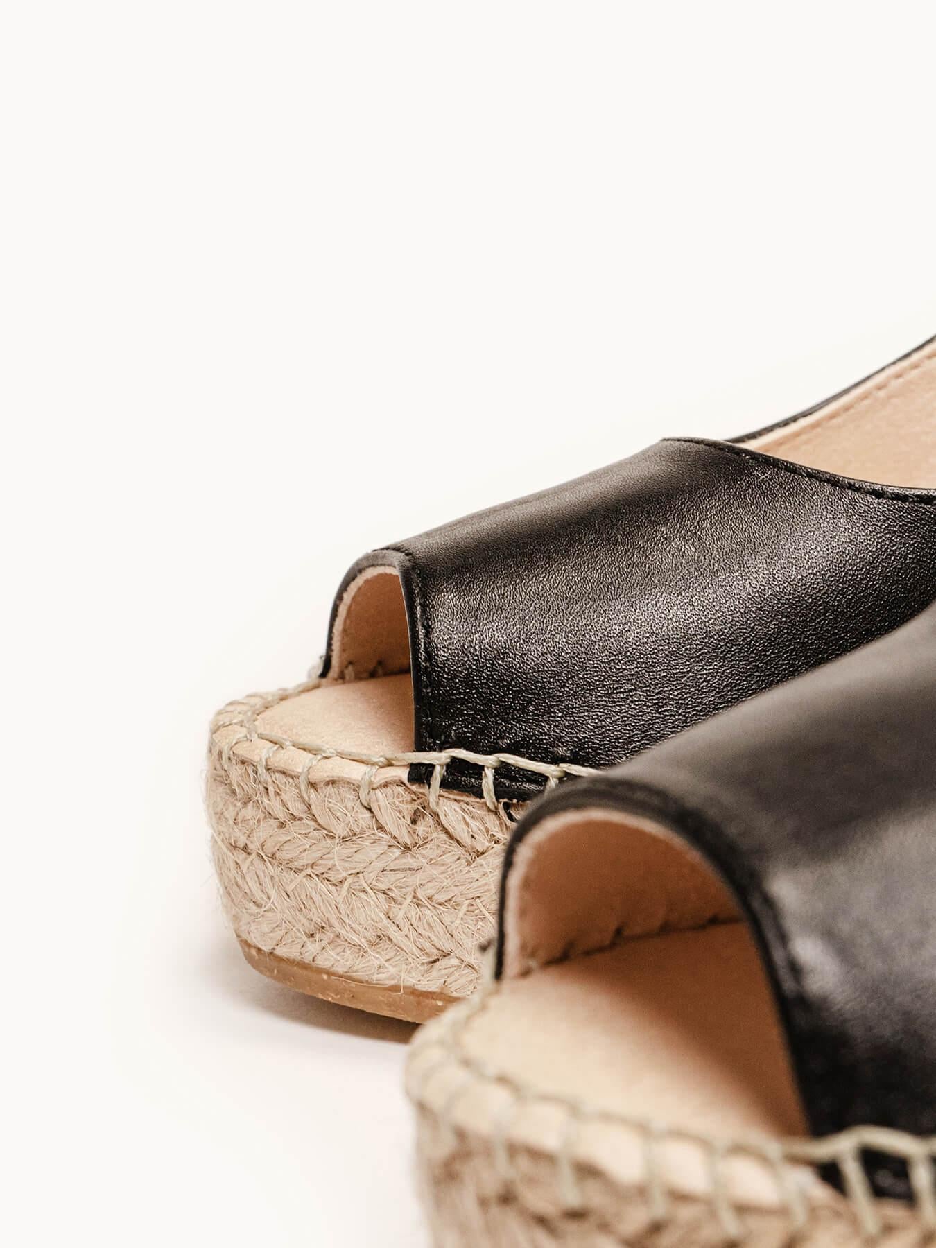 A Napa da alpargata Clavel está certificada pelo Leather Working Group (uma organização que promove práticas ambientais sustentáveis). O forro e a palmilha são de microfibra respirável e antibacteriana. Anabela de trança de juta natural com sola de borracha reciclada misturada com fibras naturais. Elementos metálicos livres de níquel. Linha de algodão costurada à mão.