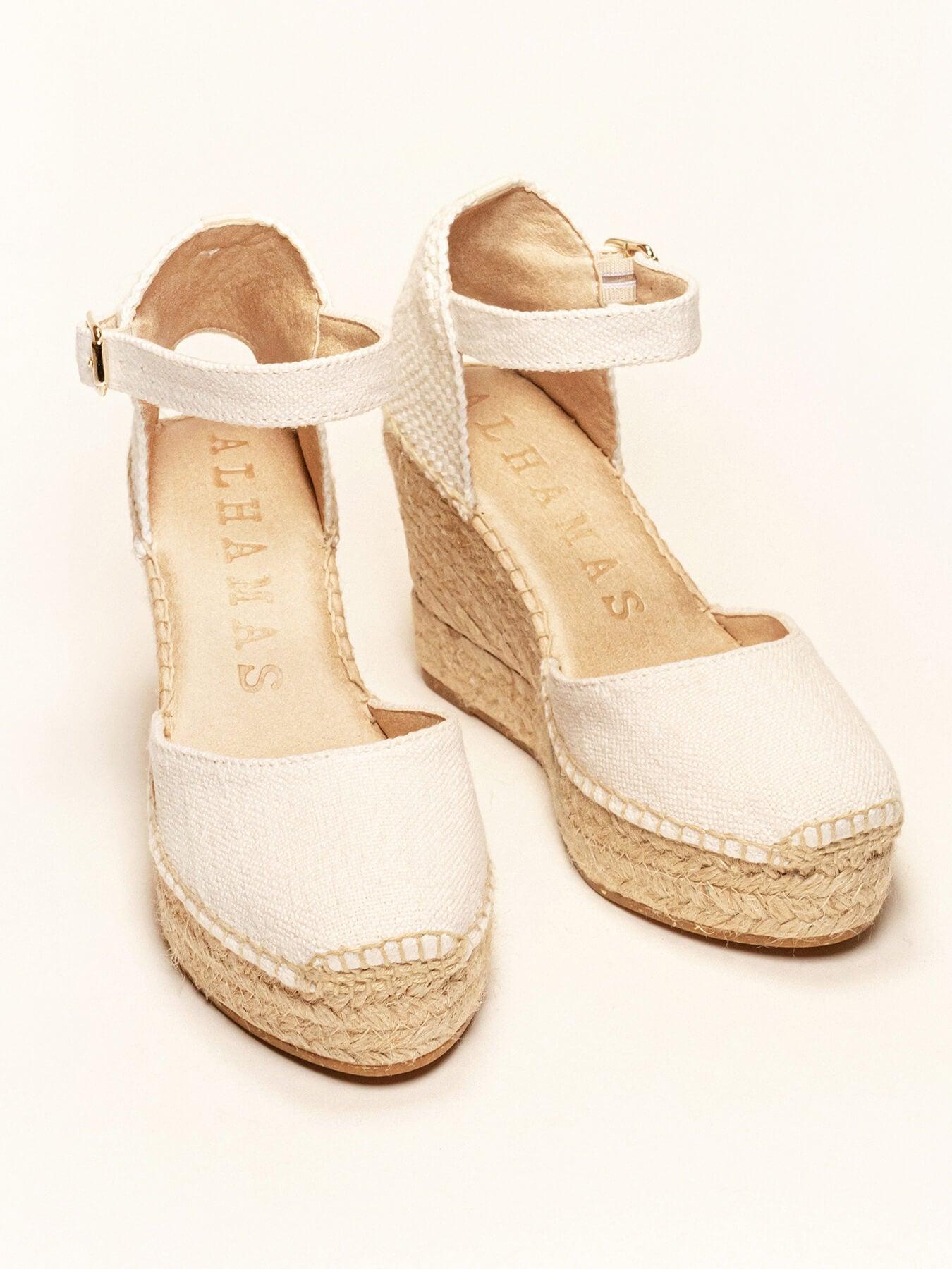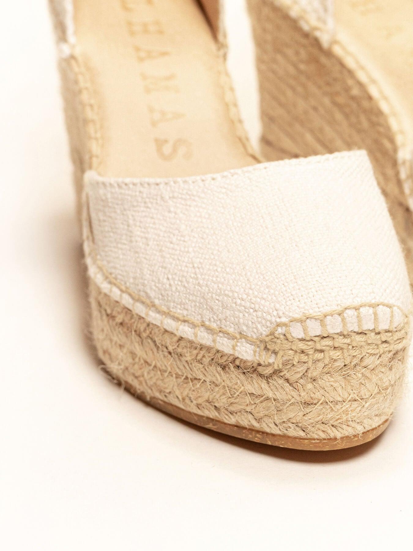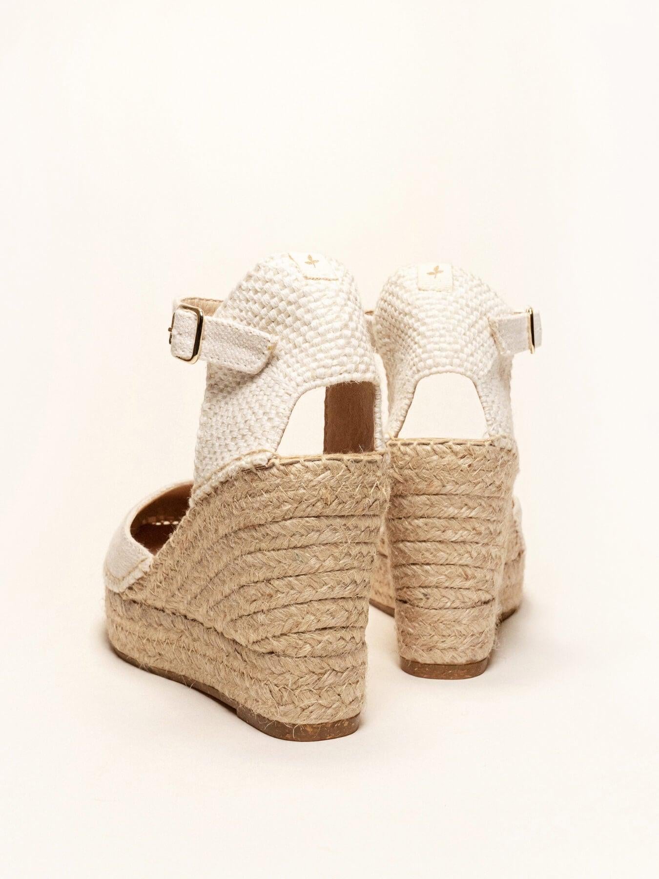 - Anabela trançada de juta natural com sola de borracha reciclada misturada com fibras naturais.