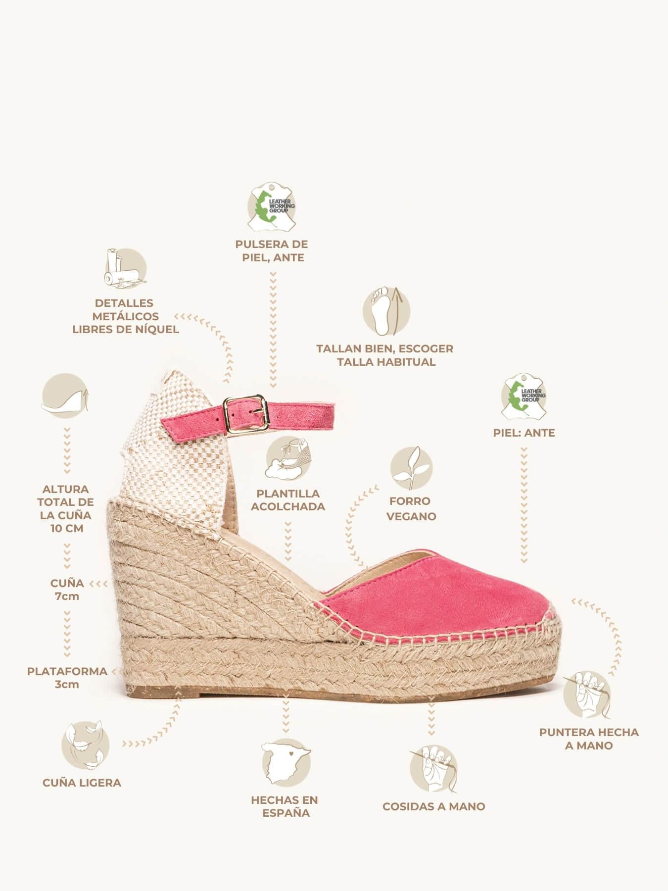 - Anabela trançada de juta natural com sola de borracha reciclada, misturada com fibras naturais.