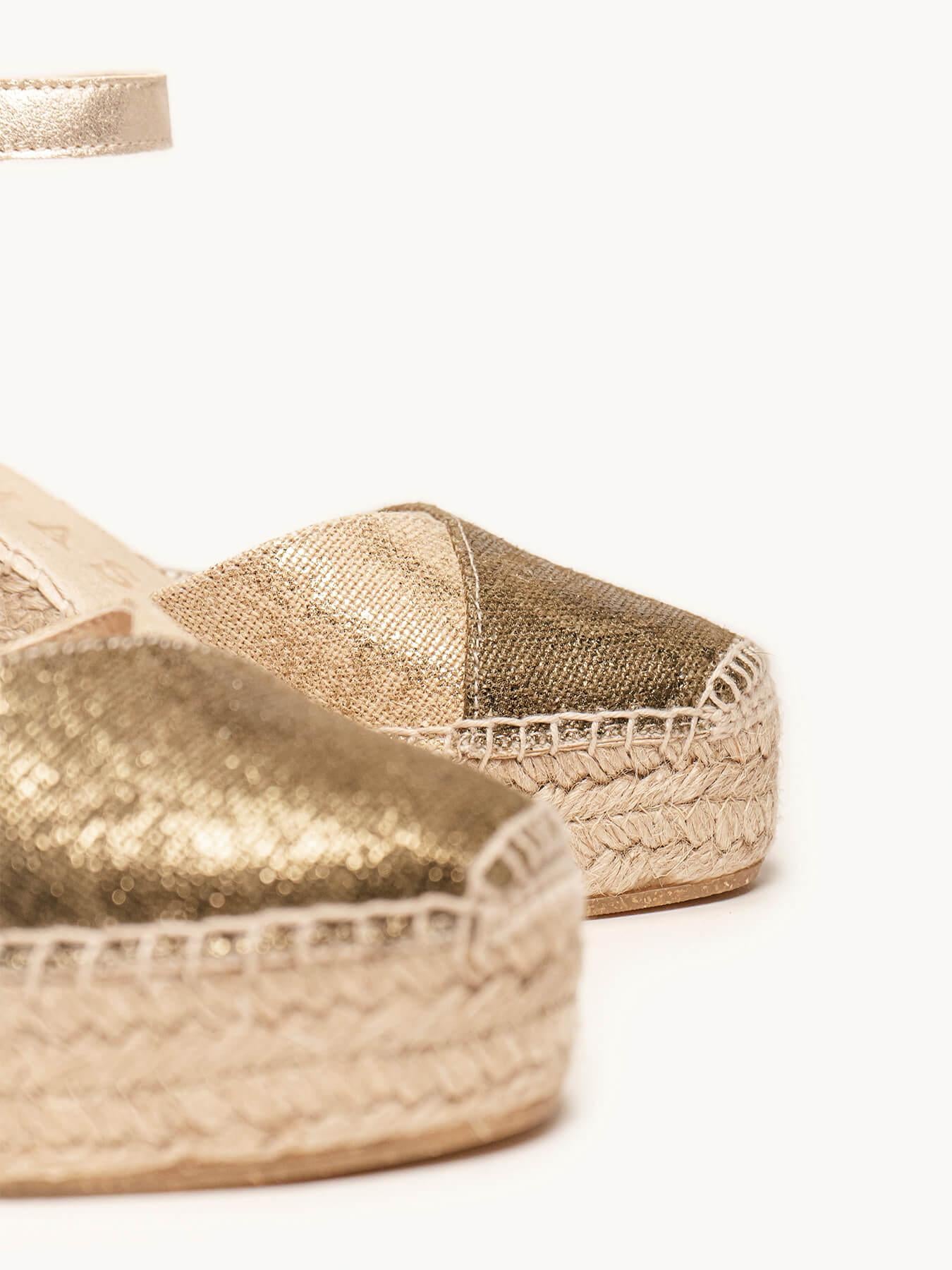 - O linho metalizado do modelo Jara é de juta e algodão, a tira é de camurça metalizada certificada pelo Leather Working Group (uma organização que promove práticas ambientais sustentáveis).