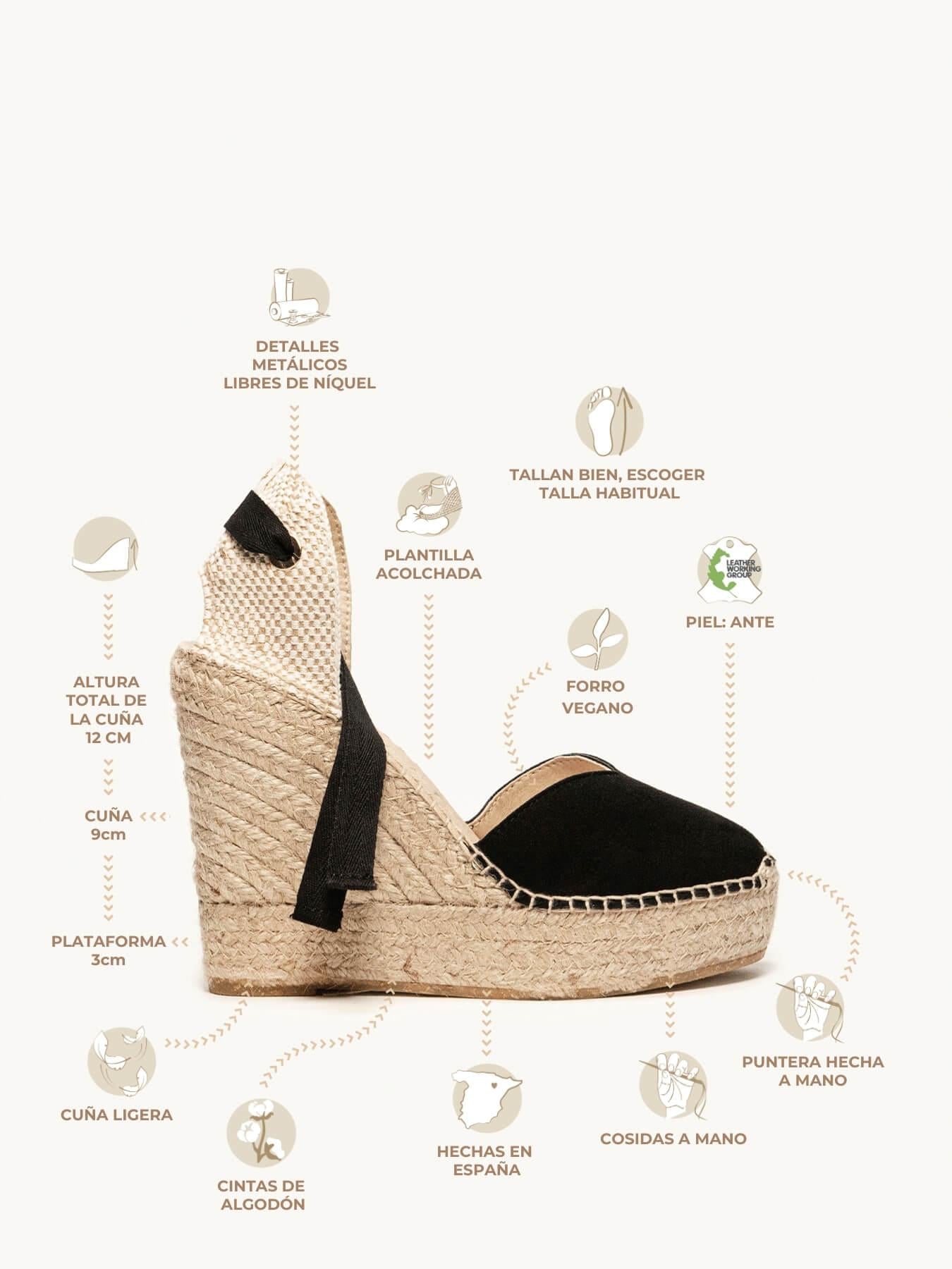 - Anabela trançada de juta natural com sola de borracha reciclada misturada com fibras naturais.
