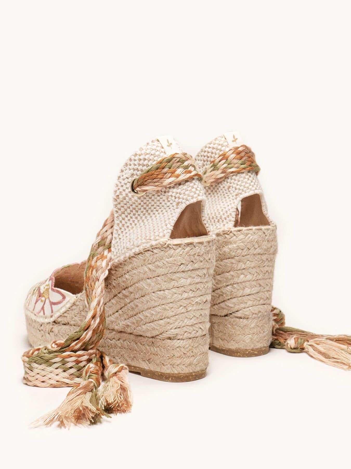 A sandália anabela alta Romero é o nosso modelo mais icônico. Uma sandália valenciana com decote coração e fitas que você poderá usar em seus looks especiais e também no dia a dia. Você pode dar um toque especial porque as fitas podem ser trocadas.