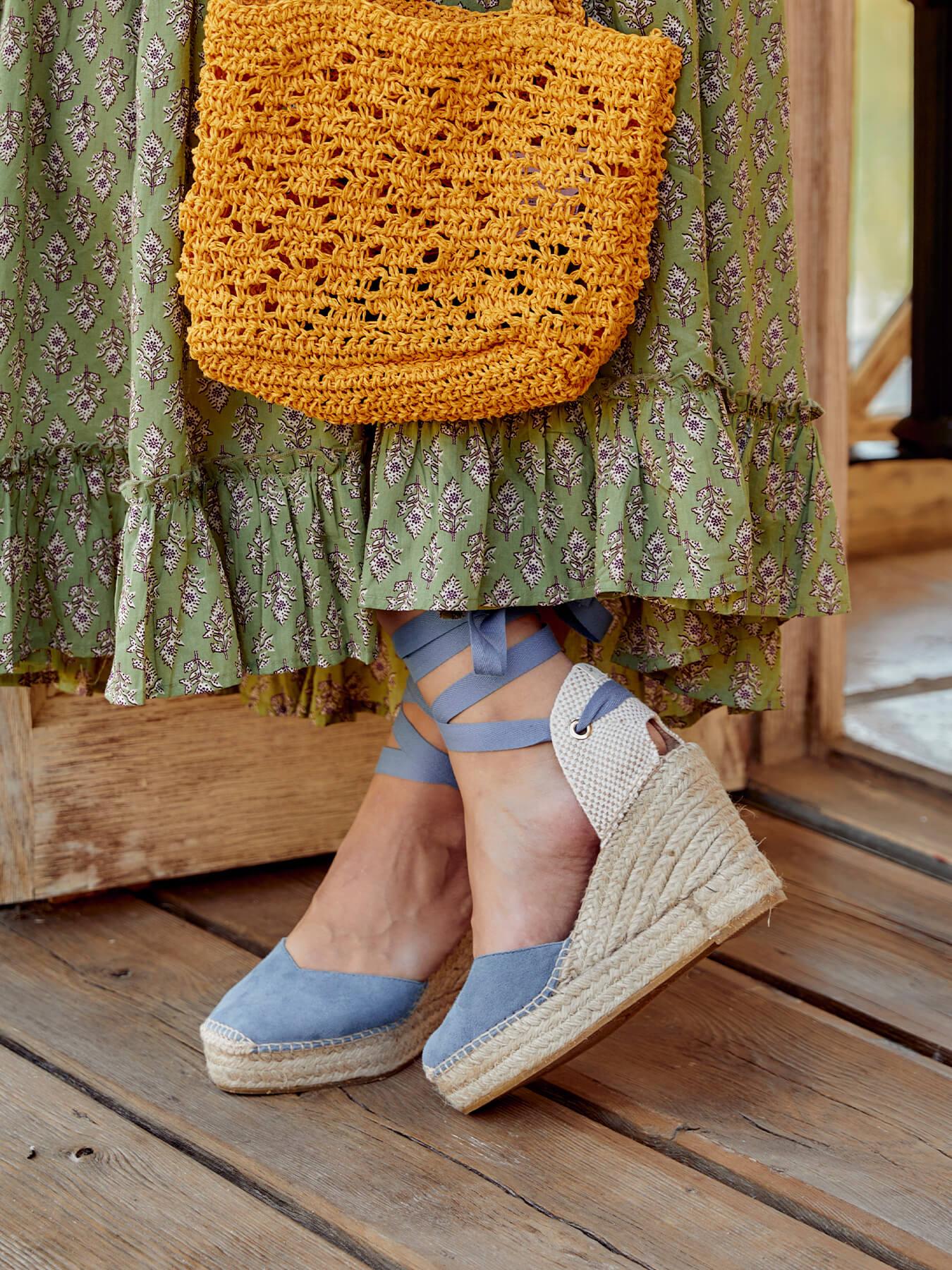 - Anabela de trança de juta natural com sola de borracha reciclada misturada com fibras naturais.