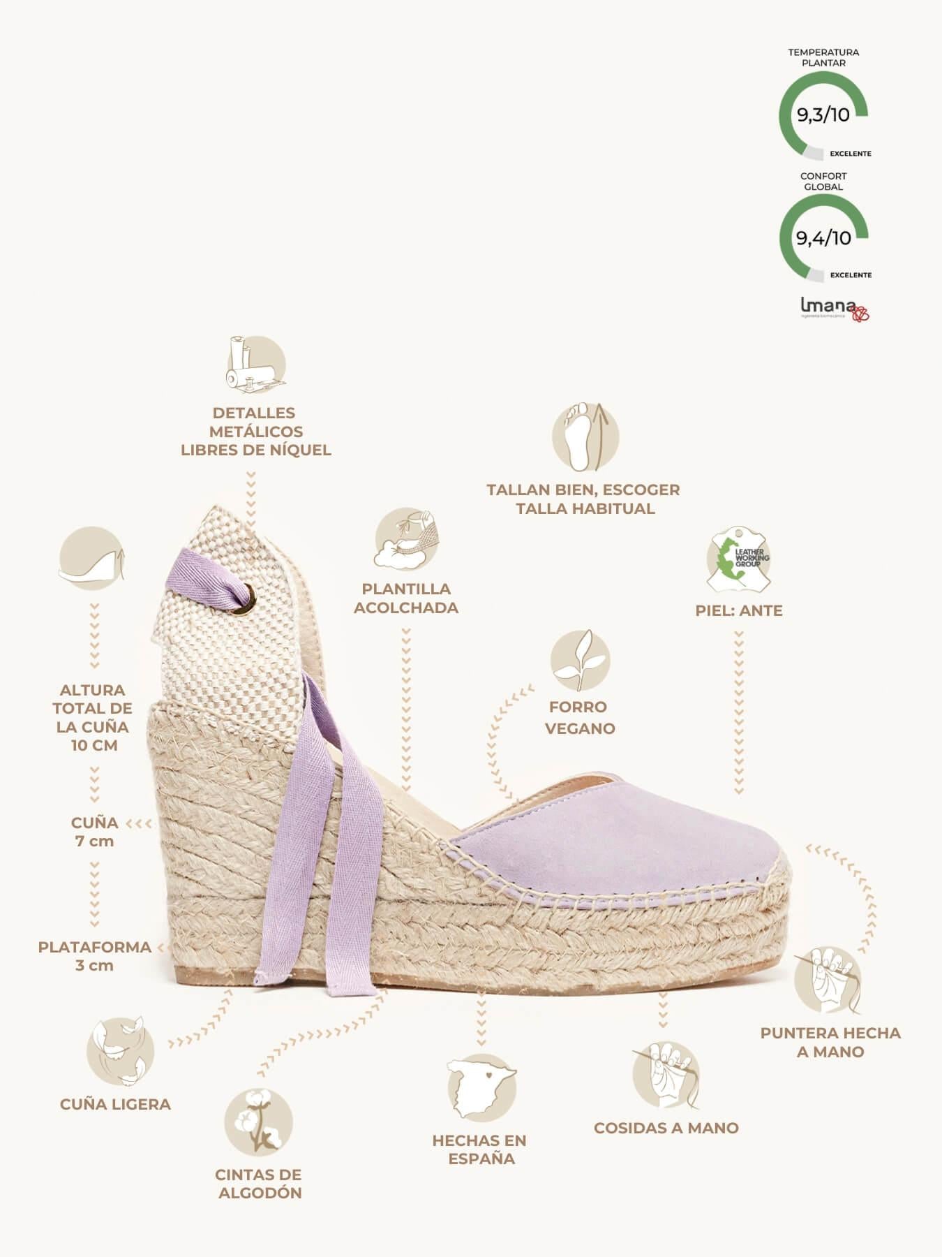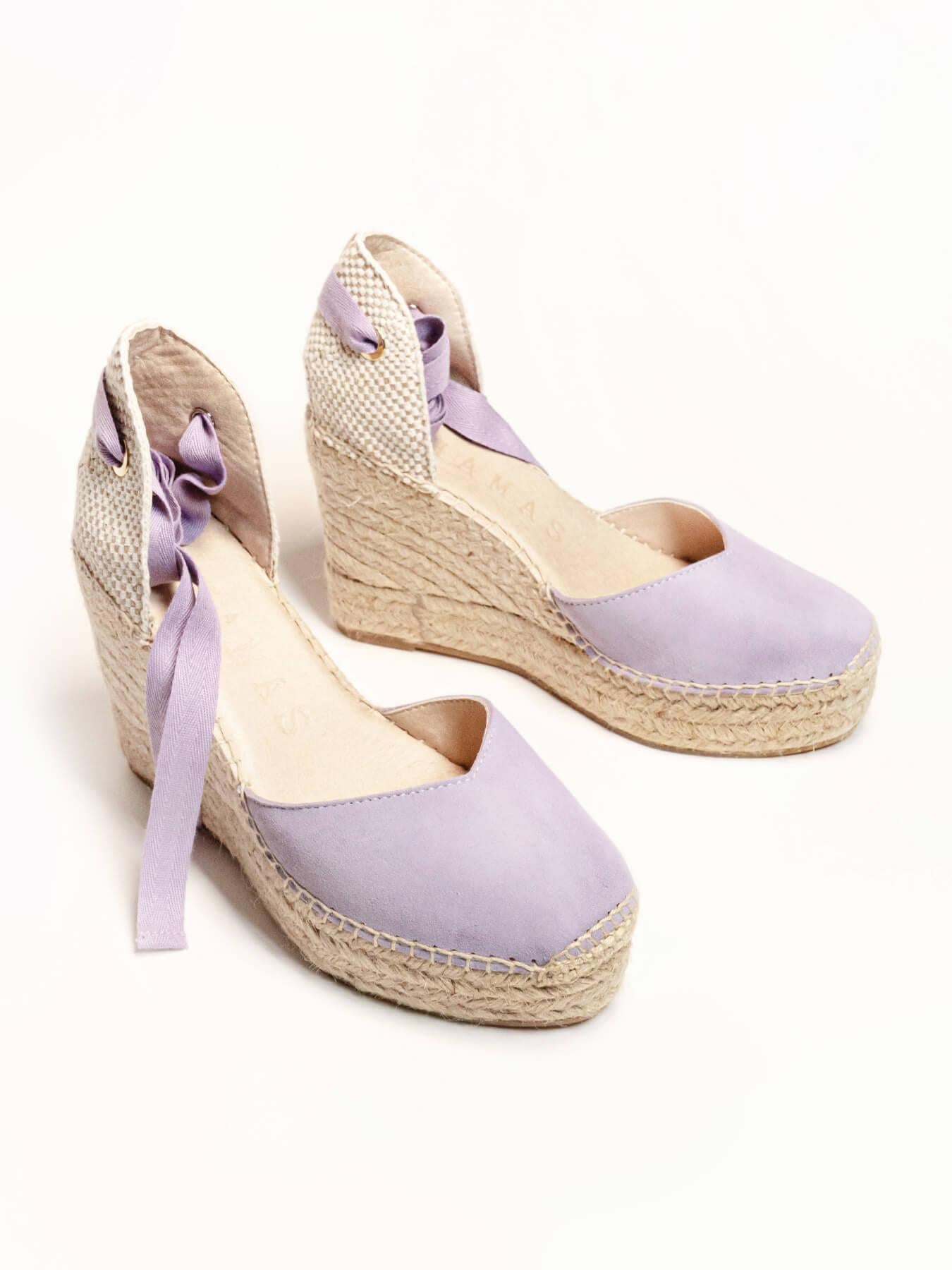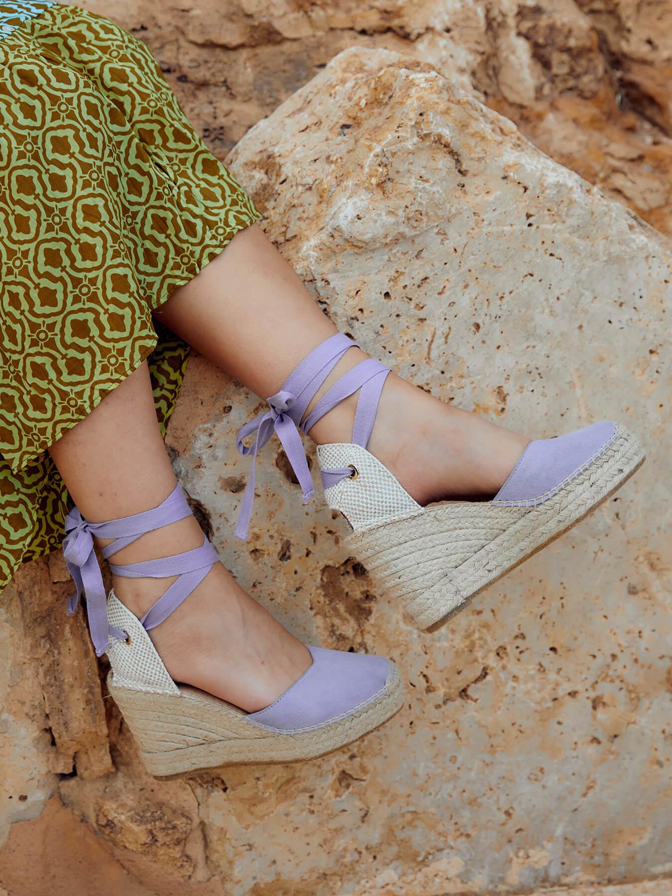 A sandália Romero de anabela alta é o nosso modelo mais icônico. Uma sandália valenciana com decote coração e fitas que você poderá usar tanto em looks especiais quanto no dia a dia. Você poderá dar um toque especial porque as fitas podem ser trocadas.