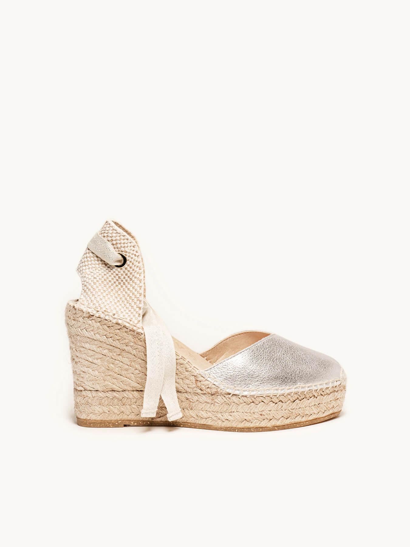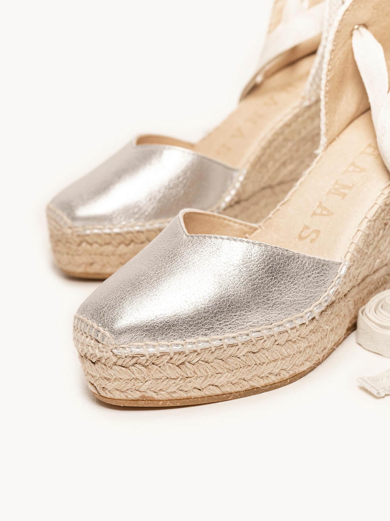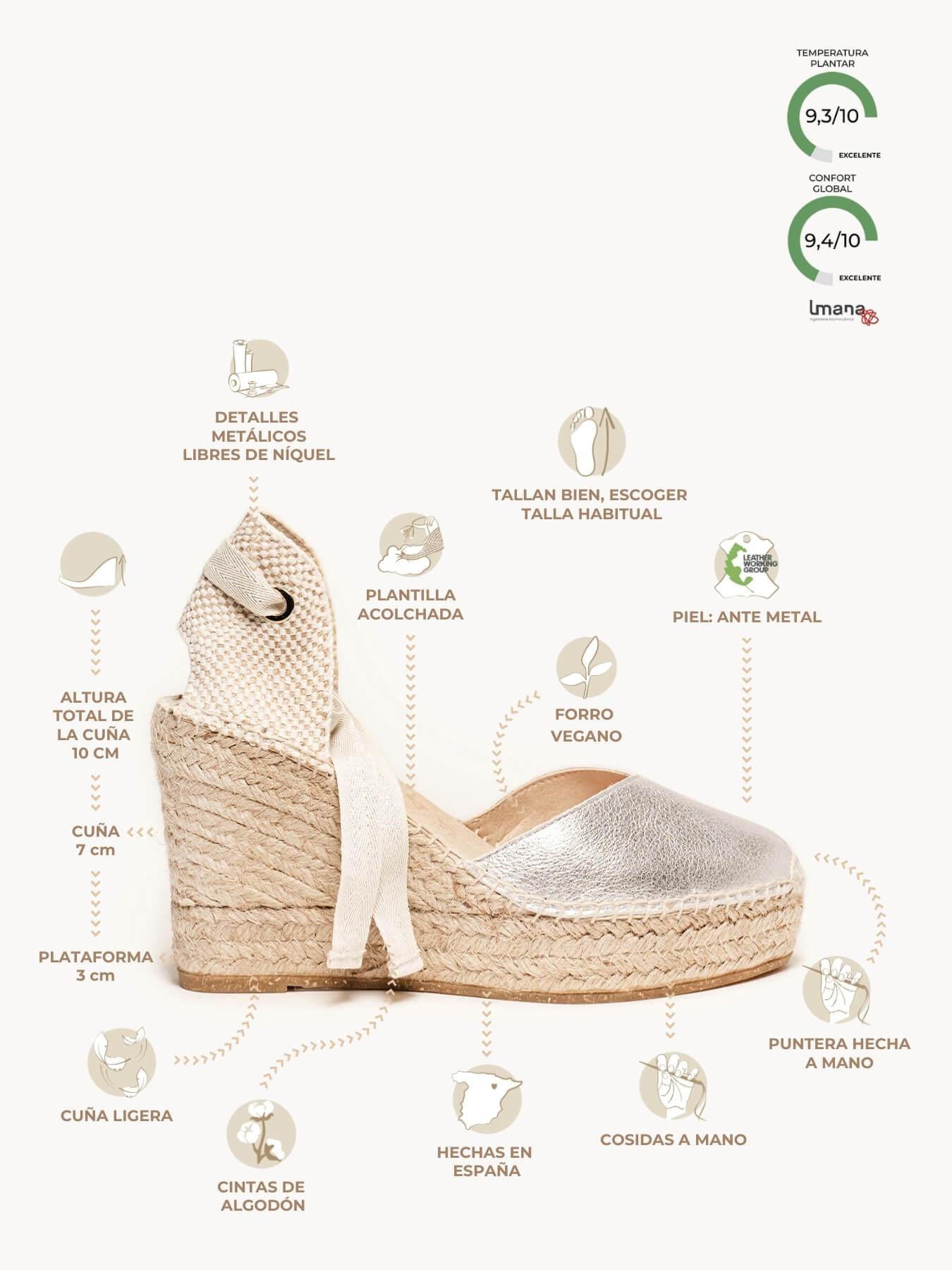- A camurça metalizada da sandália anabela Romero está certificada pelo Leather Working Group (uma organização que promove práticas ambientais sustentáveis)