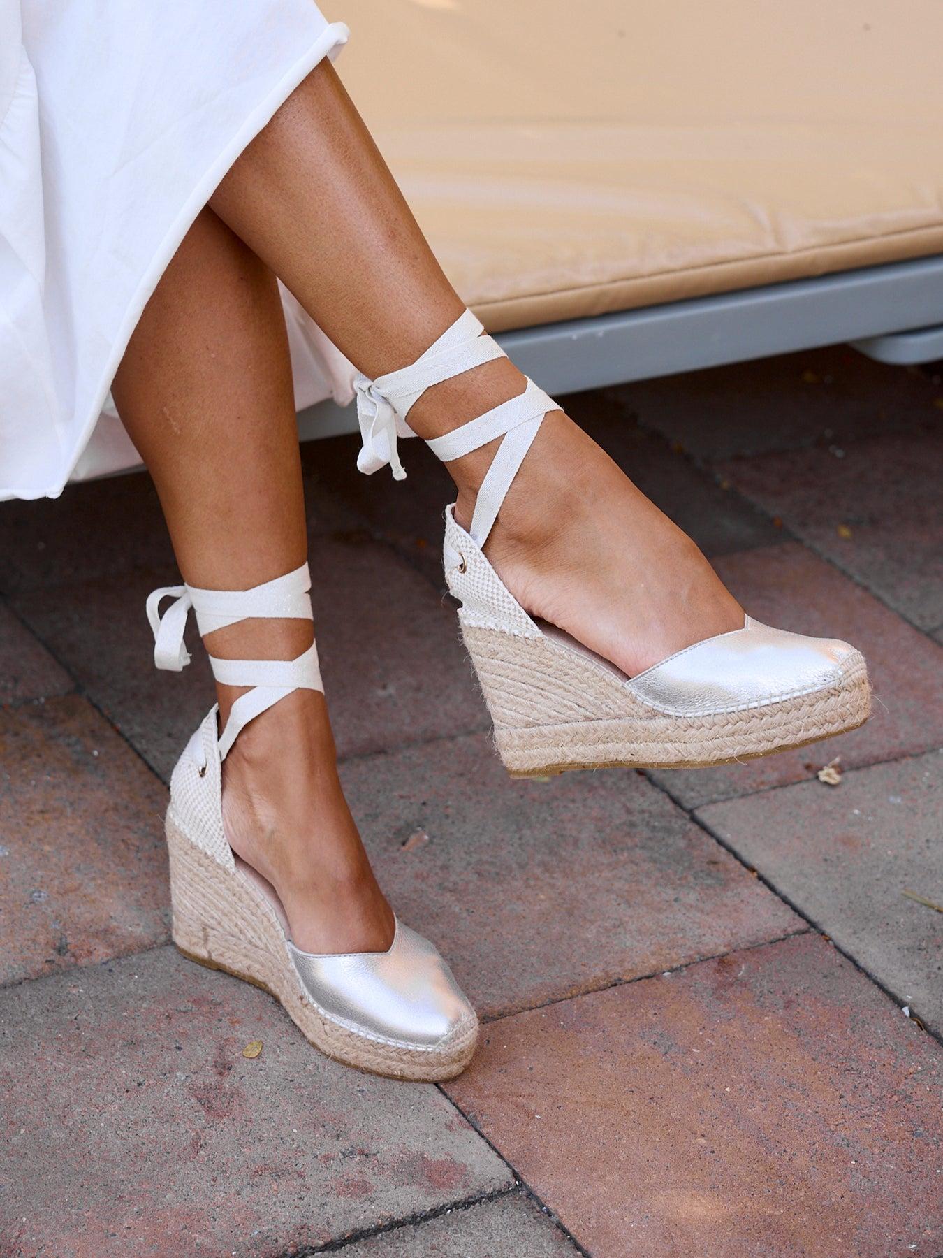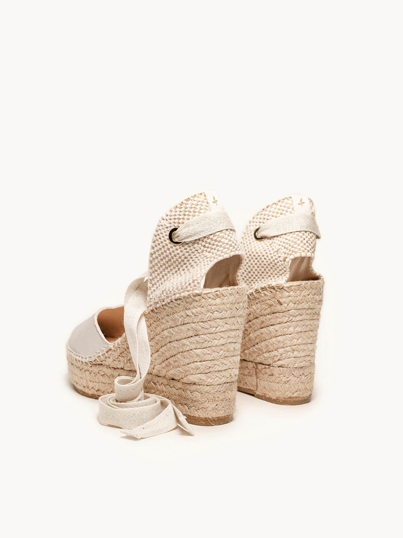 A sandália anabela alta Romero é o nosso modelo mais icônico. Uma sandália valenciana com decote coração e fitas que você poderá usar em looks especiais e também no dia a dia. Você pode dar um toque especial porque as fitas são intercambiáveis.
