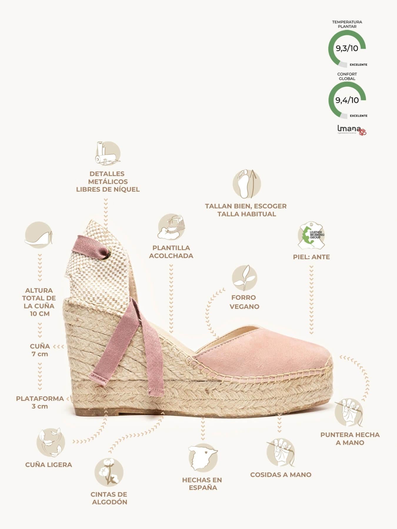 - A camurça da sandália anabela Romero está certificada pelo Leather Working Group (uma organização que promove práticas ambientais sustentáveis)