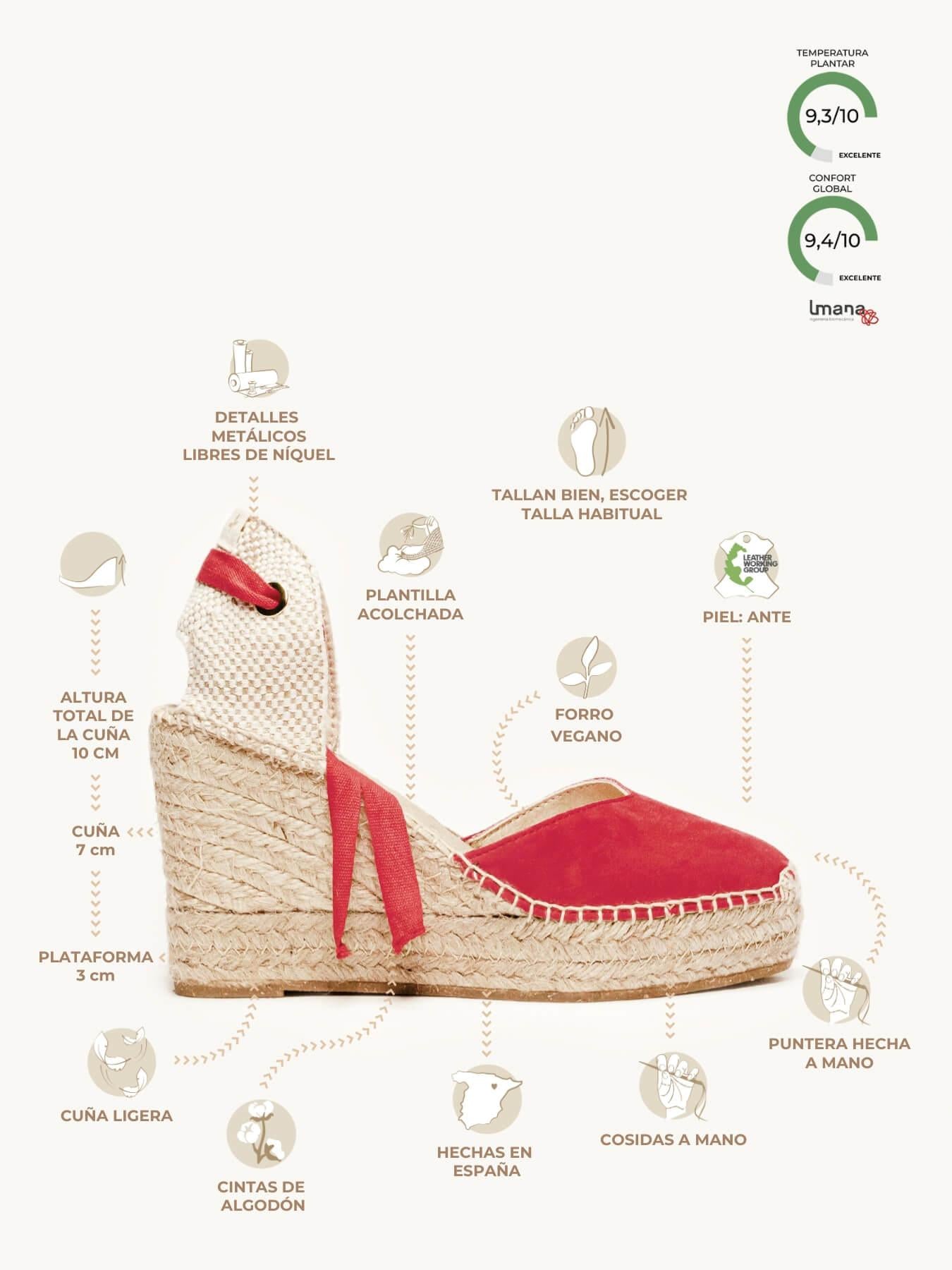 A camurça da sandália anabela Romero está certificada pelo Leather Working Group (uma organização que promove práticas ambientais sustentáveis)