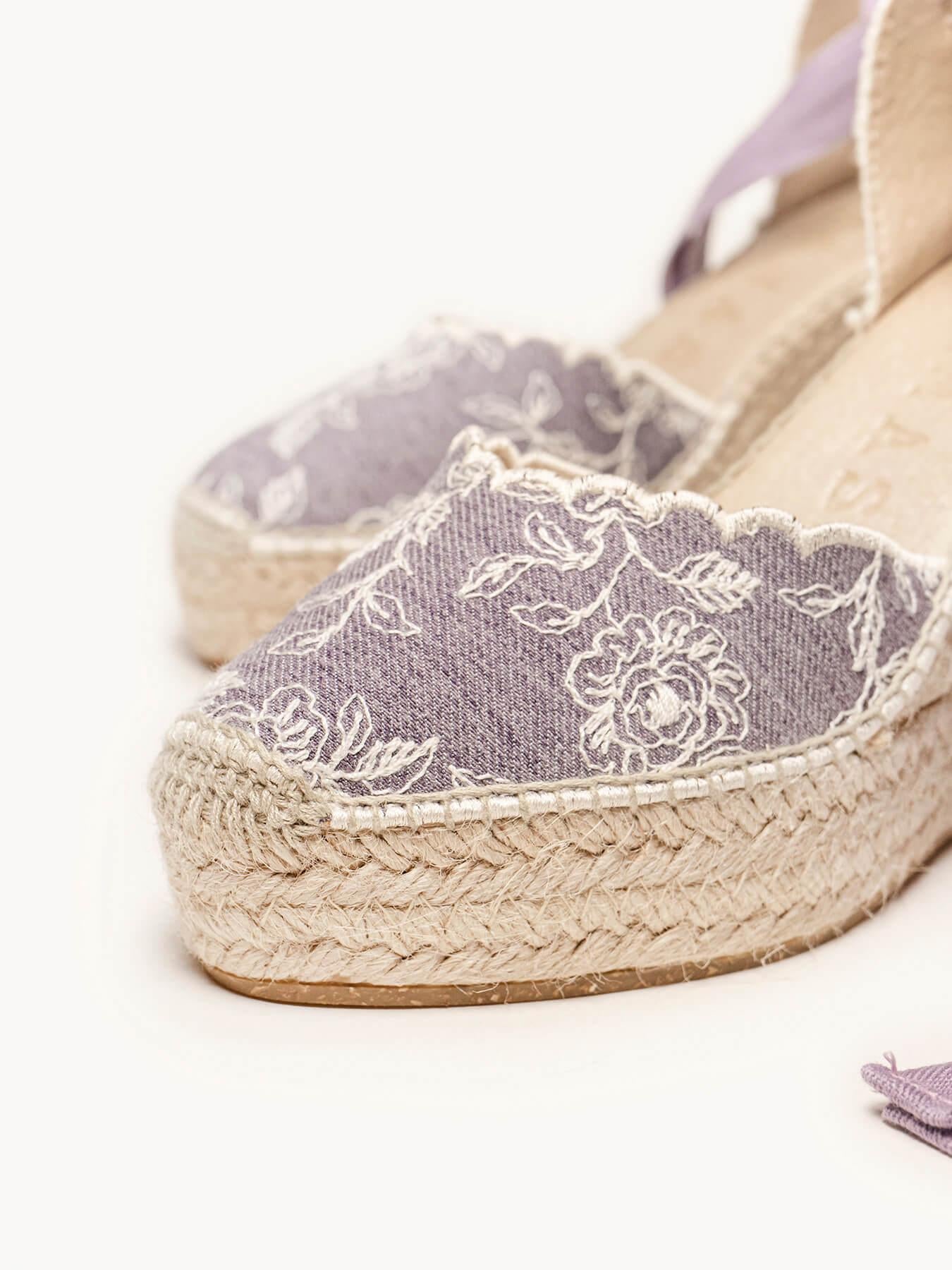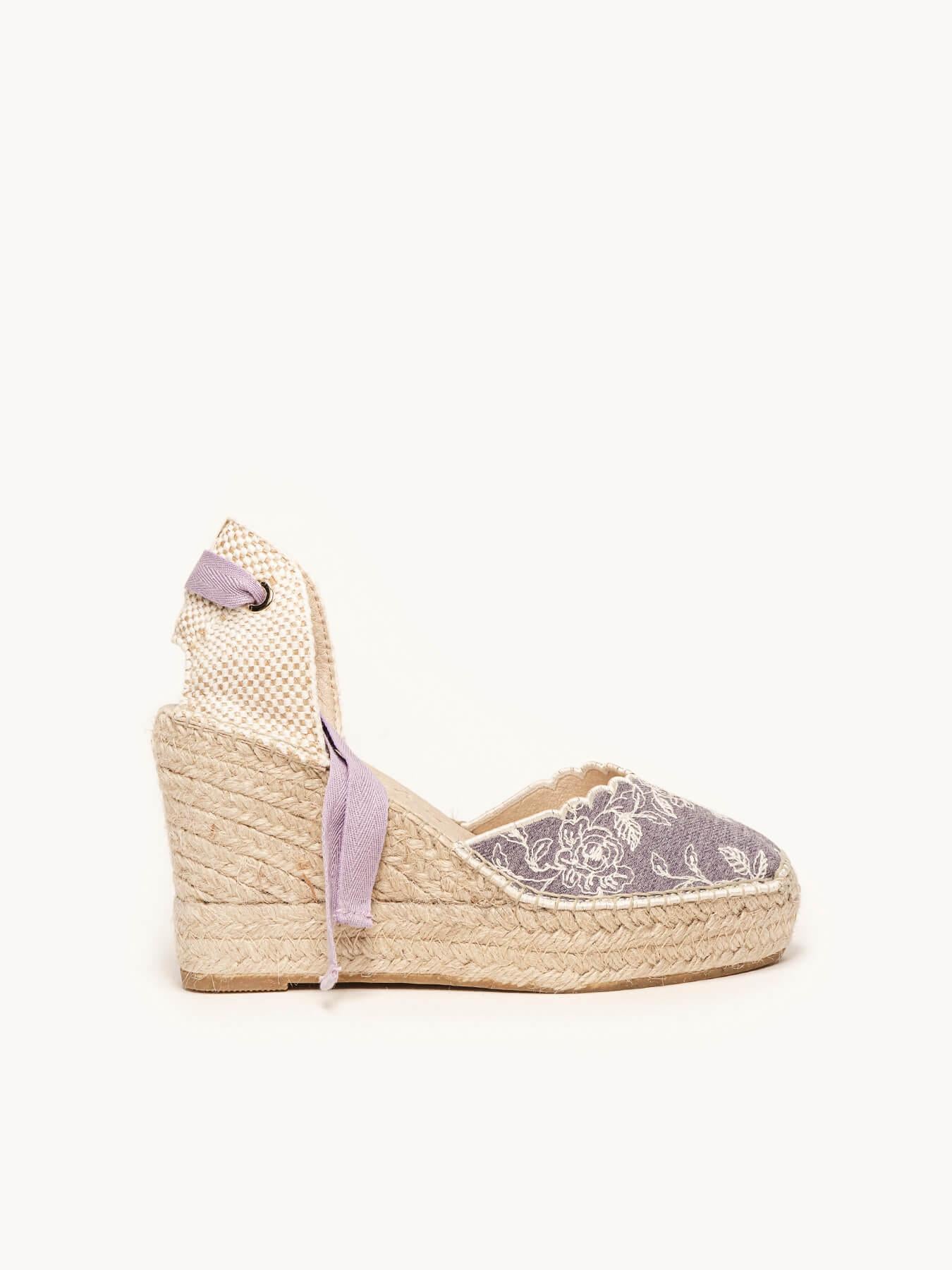 Sandália Anabela Alta Romero Jeans Bordado Lilás