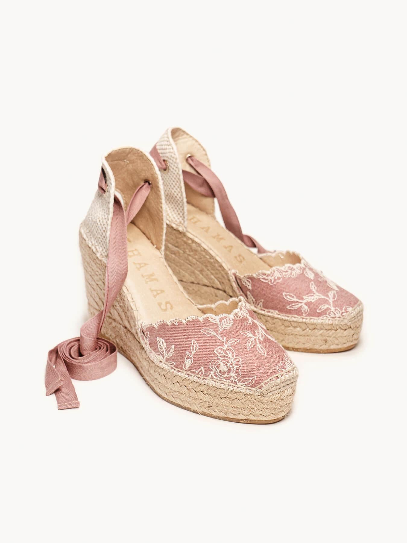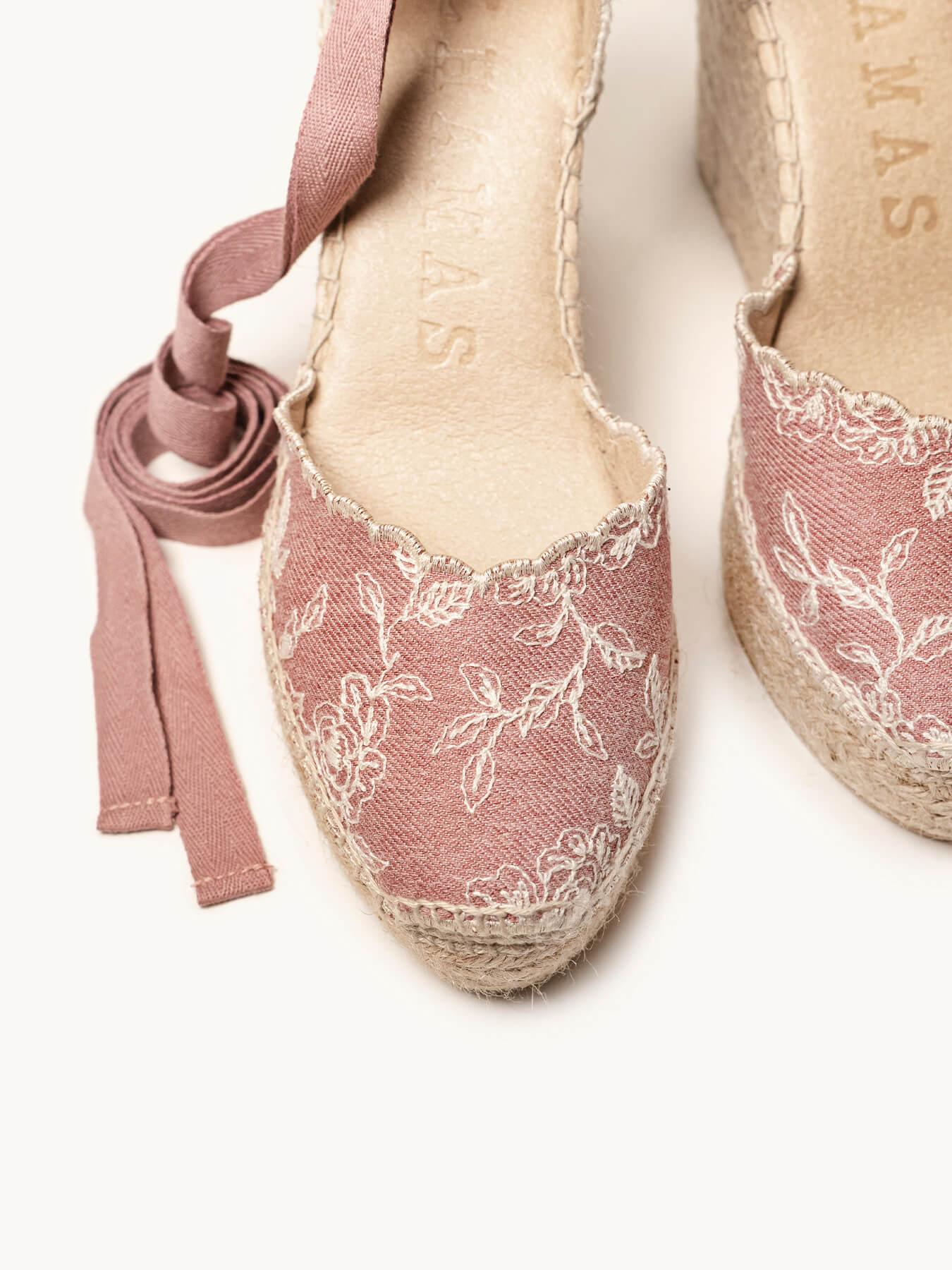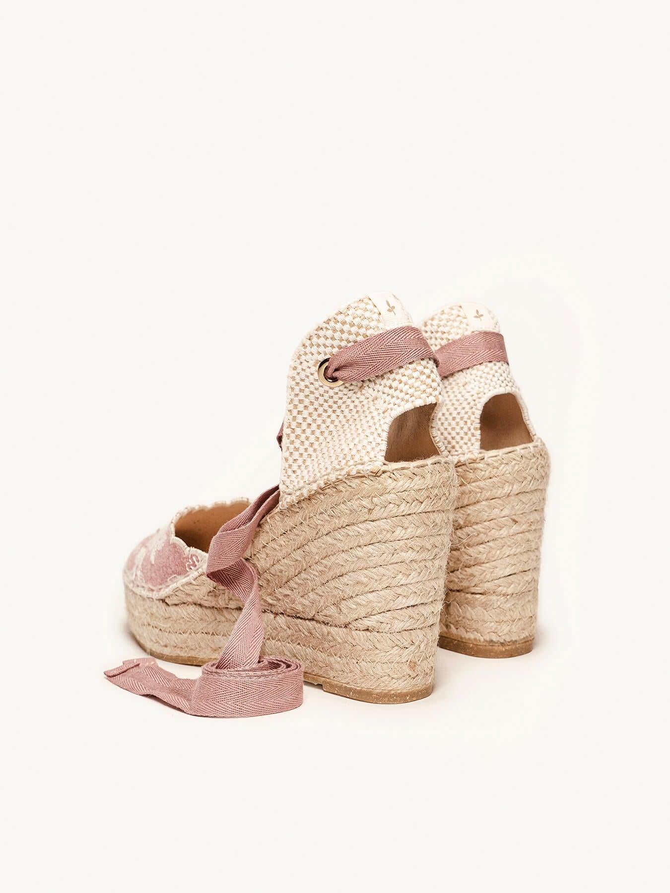 A sandália anabela alta Romero é o nosso modelo mais icônico. Uma sandália valenciana com decote coração e fitas que você poderá usar com seus looks especiais e também no dia a dia. Você pode dar um toque especial porque as fitas podem ser trocadas.