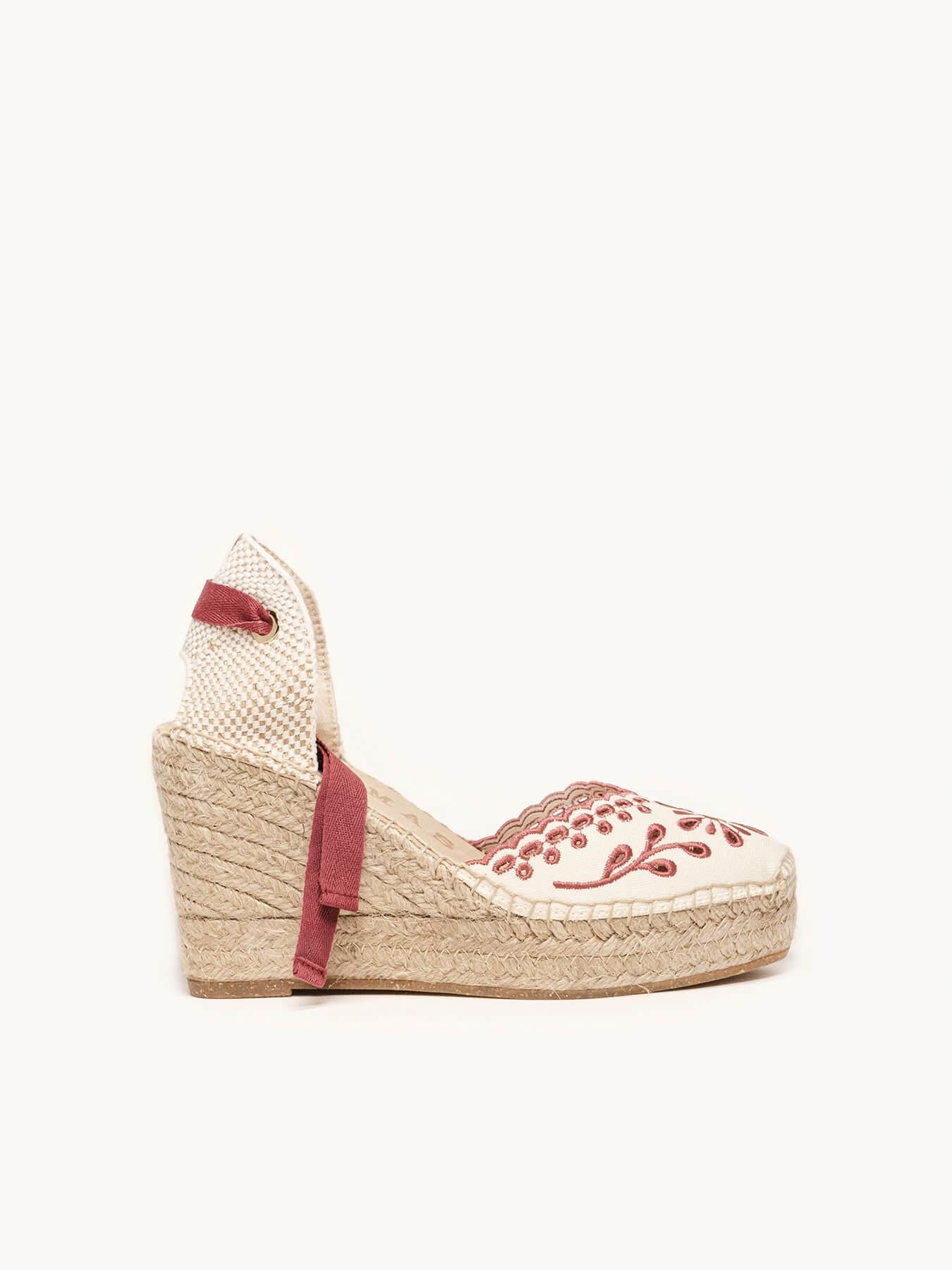 Sandália Anabela Alta Romero Lona Bordada Bordô