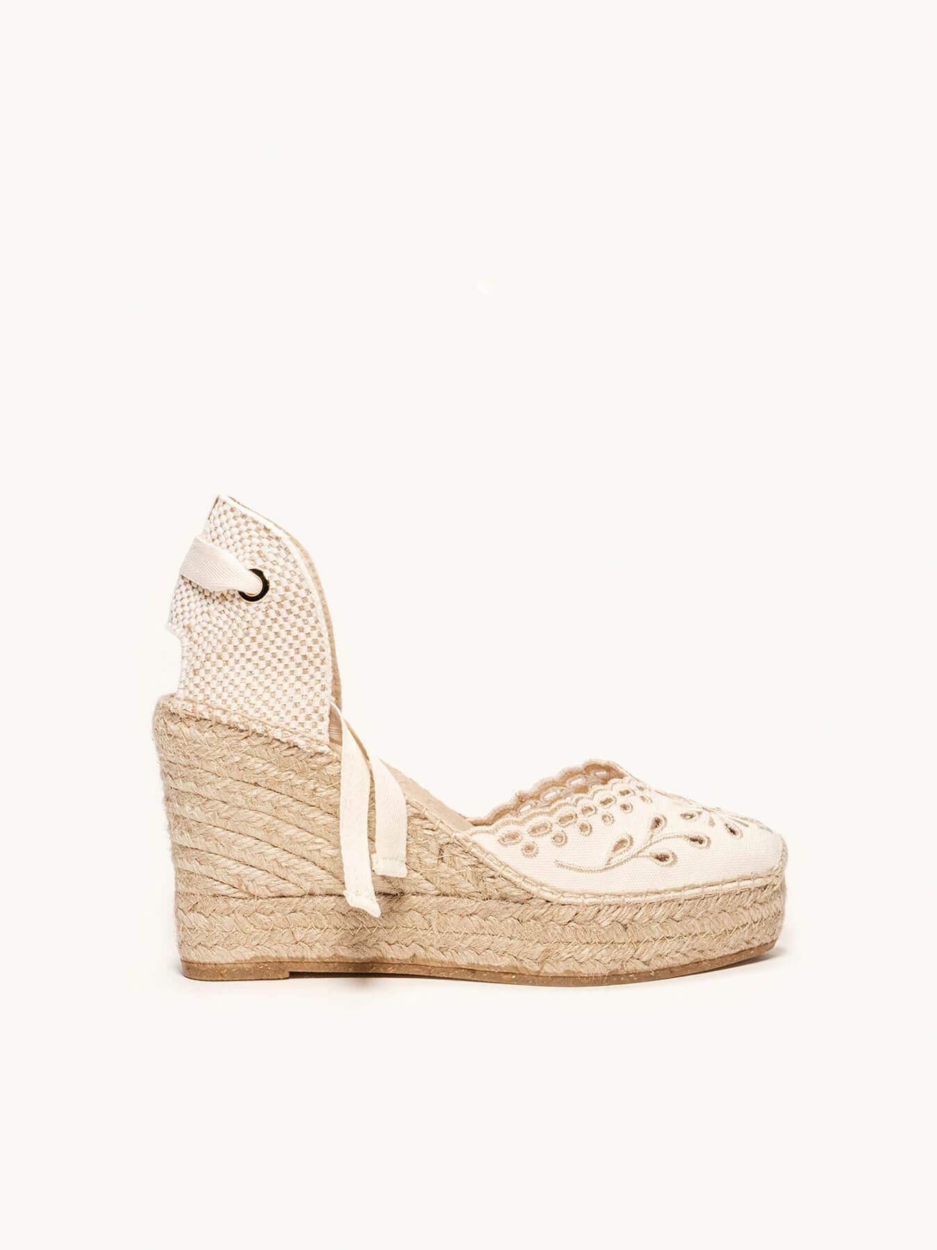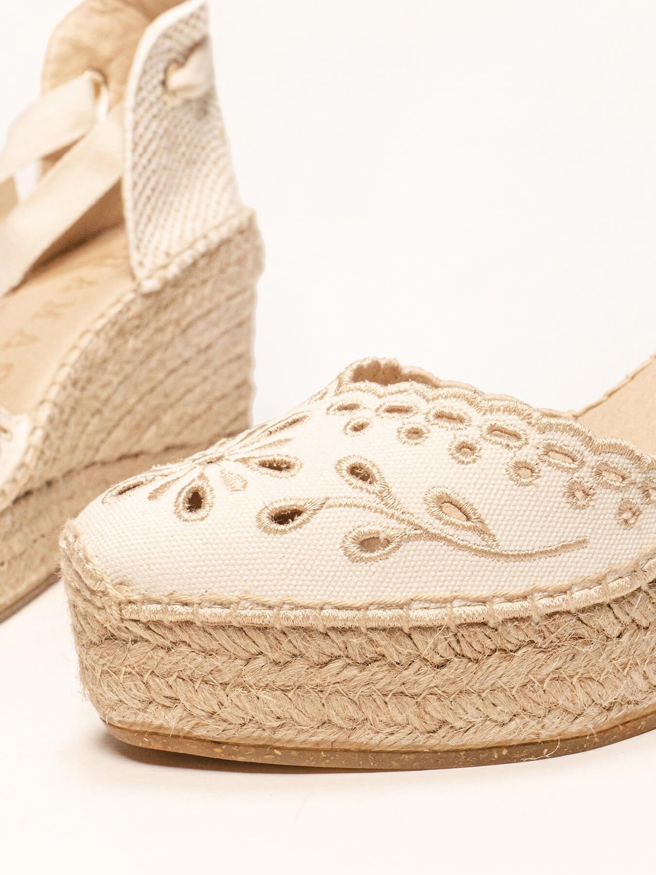 Sandália Anabela Alta Romero Lona Bordada Cru