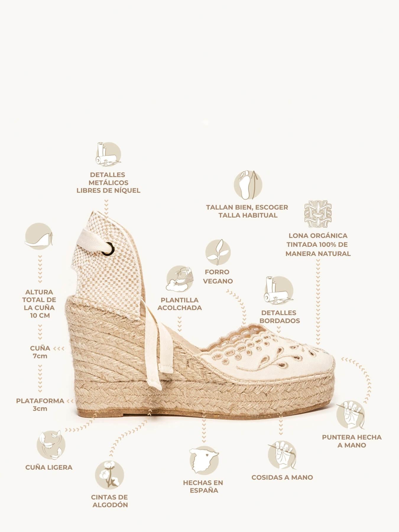 - Anabela de trança de juta natural com sola de borracha reciclada misturada com fibras naturais.