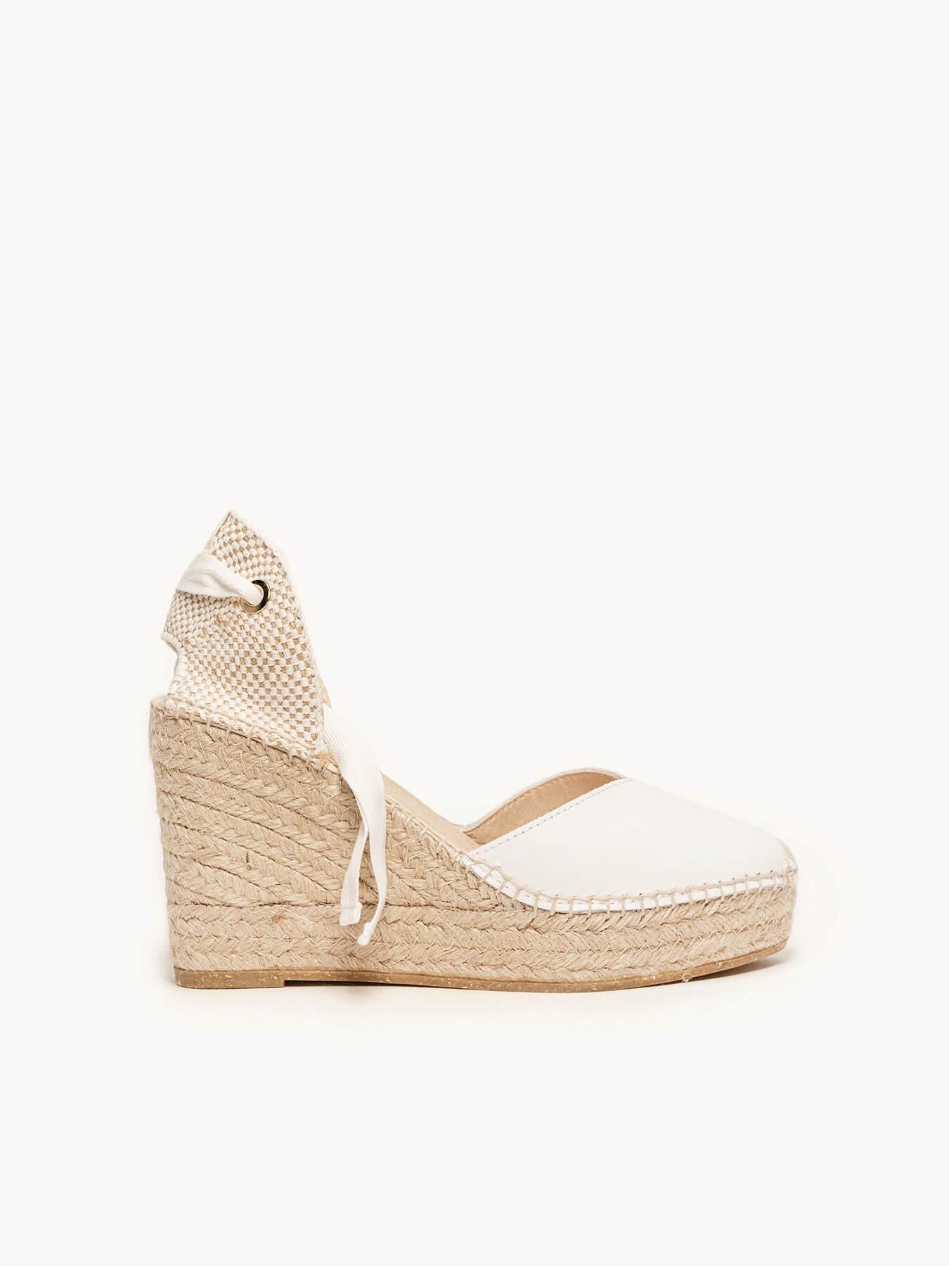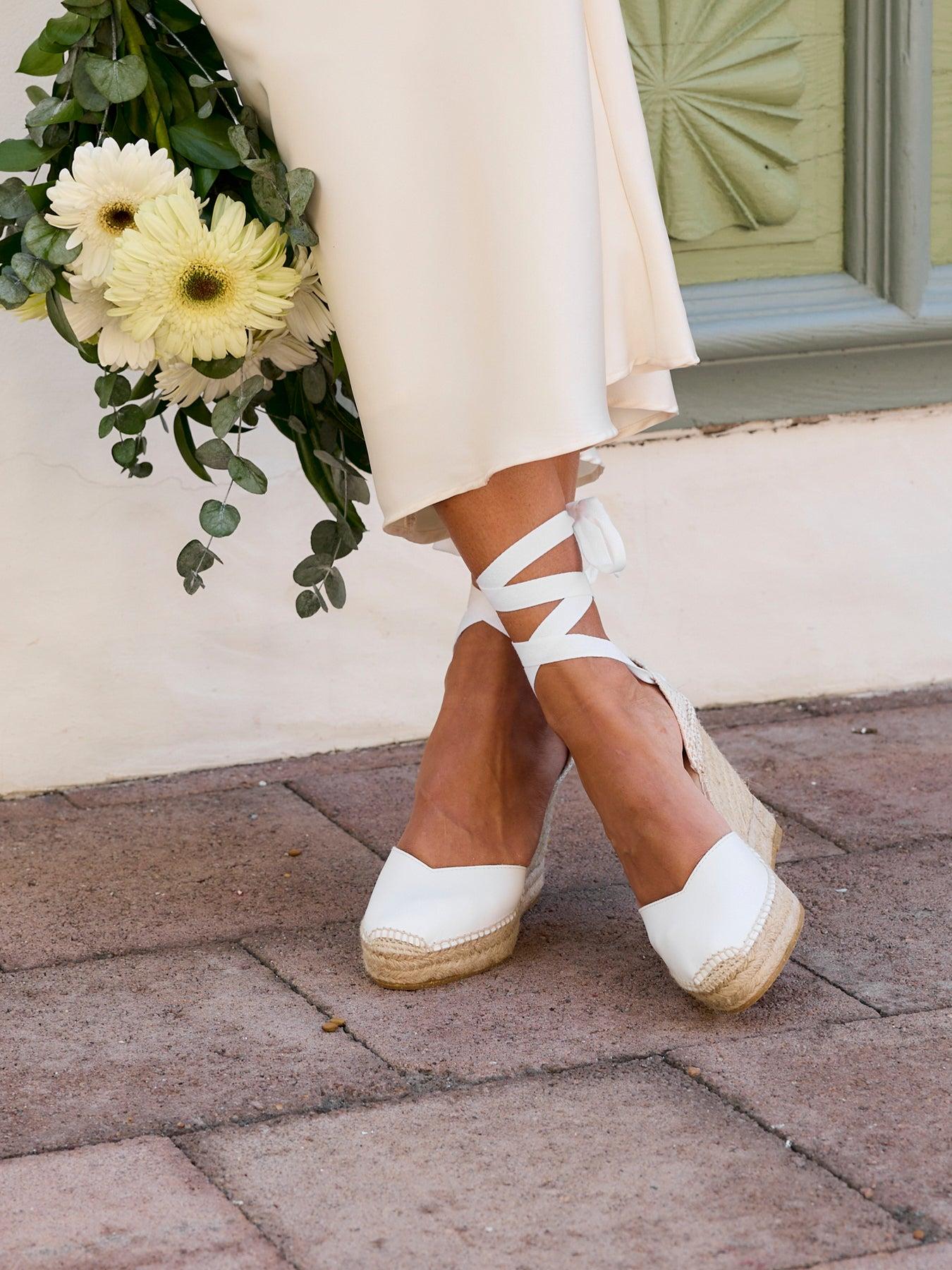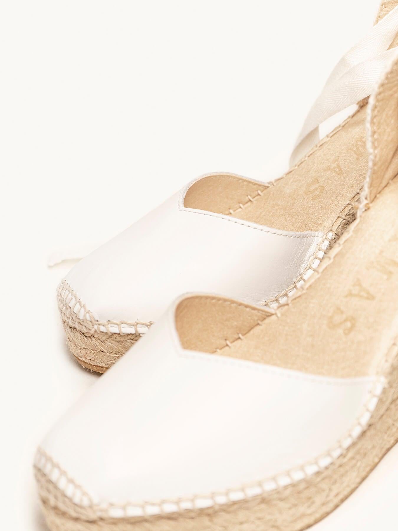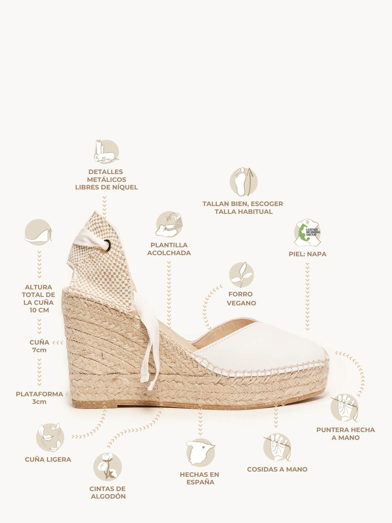 A sandália anabela alta Romero é o nosso modelo mais icônico. Uma sandália valenciana com decote coração e fitas que você poderá usar com seus looks especiais e também com os do dia a dia. Você poderá dar um toque especial porque as fitas podem ser trocadas.