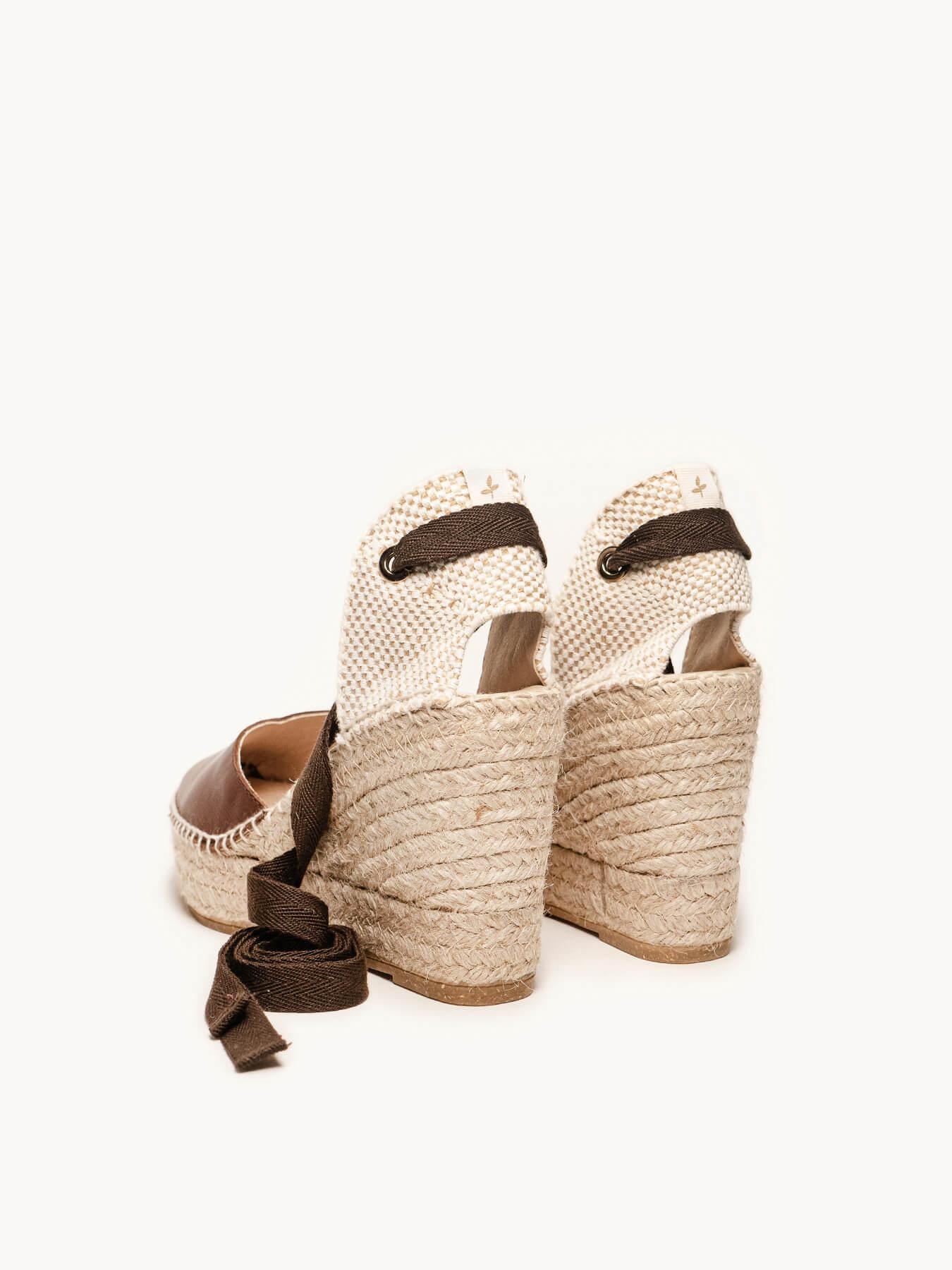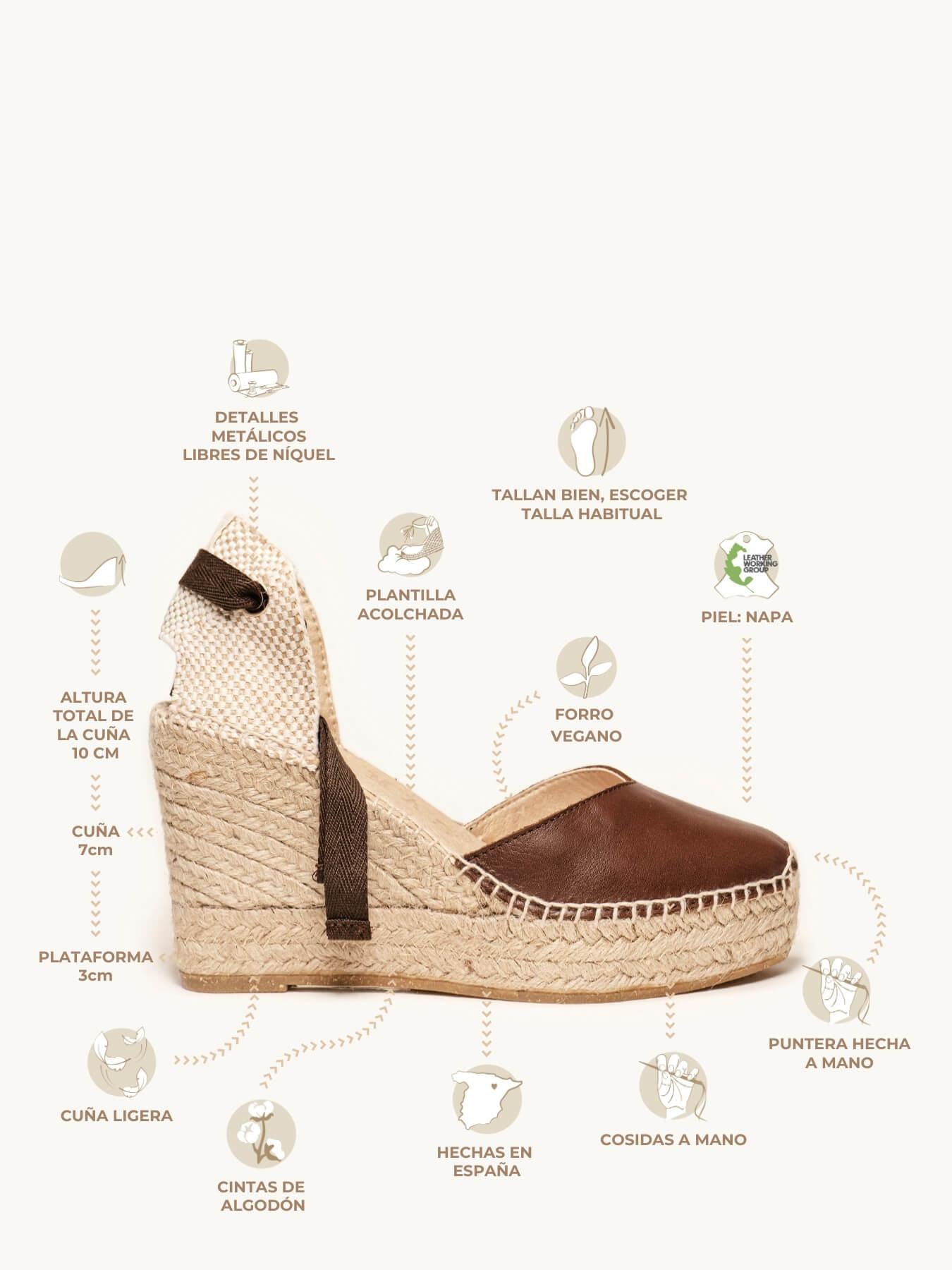 - Anabela de trança de juta natural com sola de borracha reciclada misturada com fibras naturais.