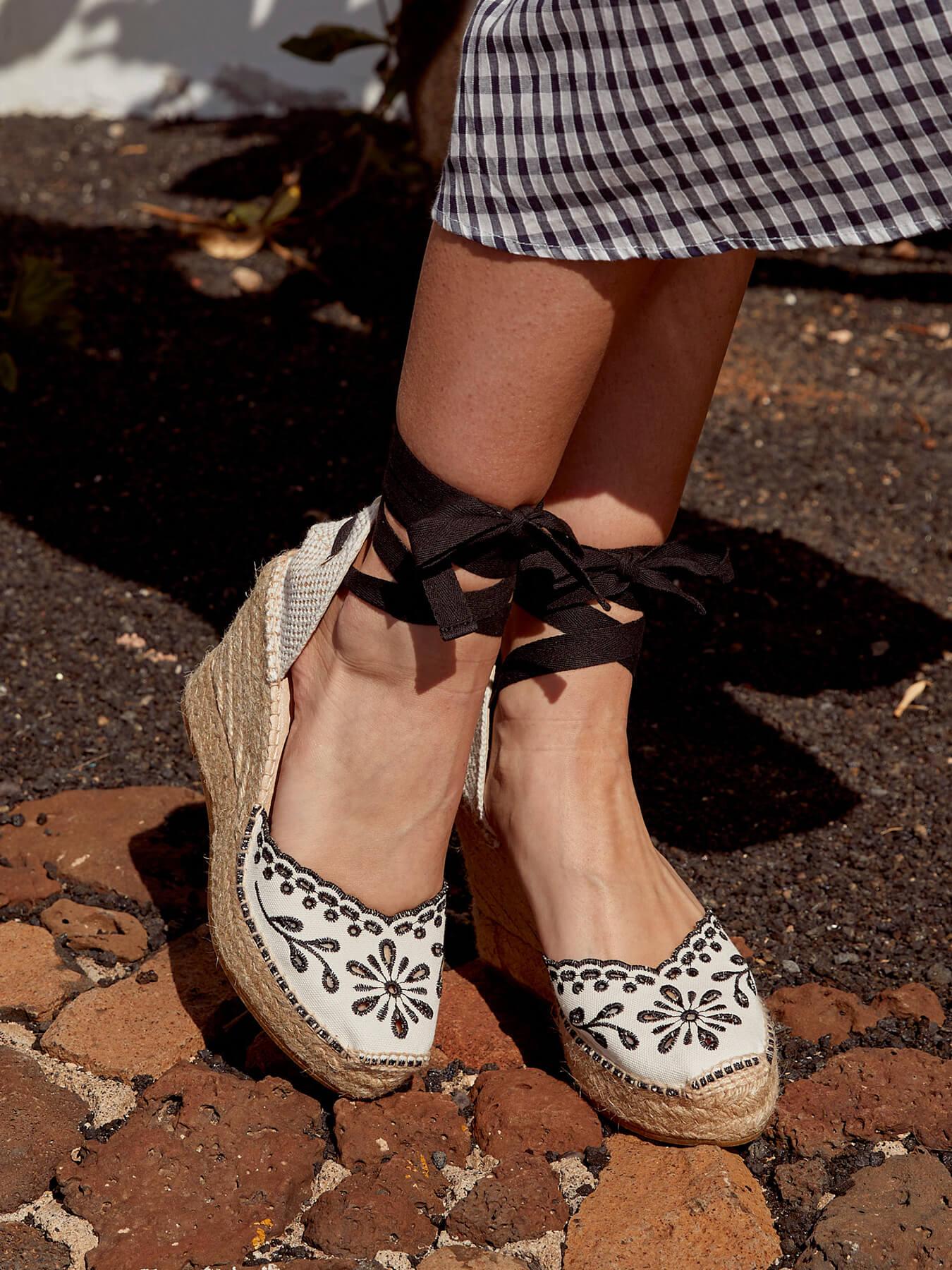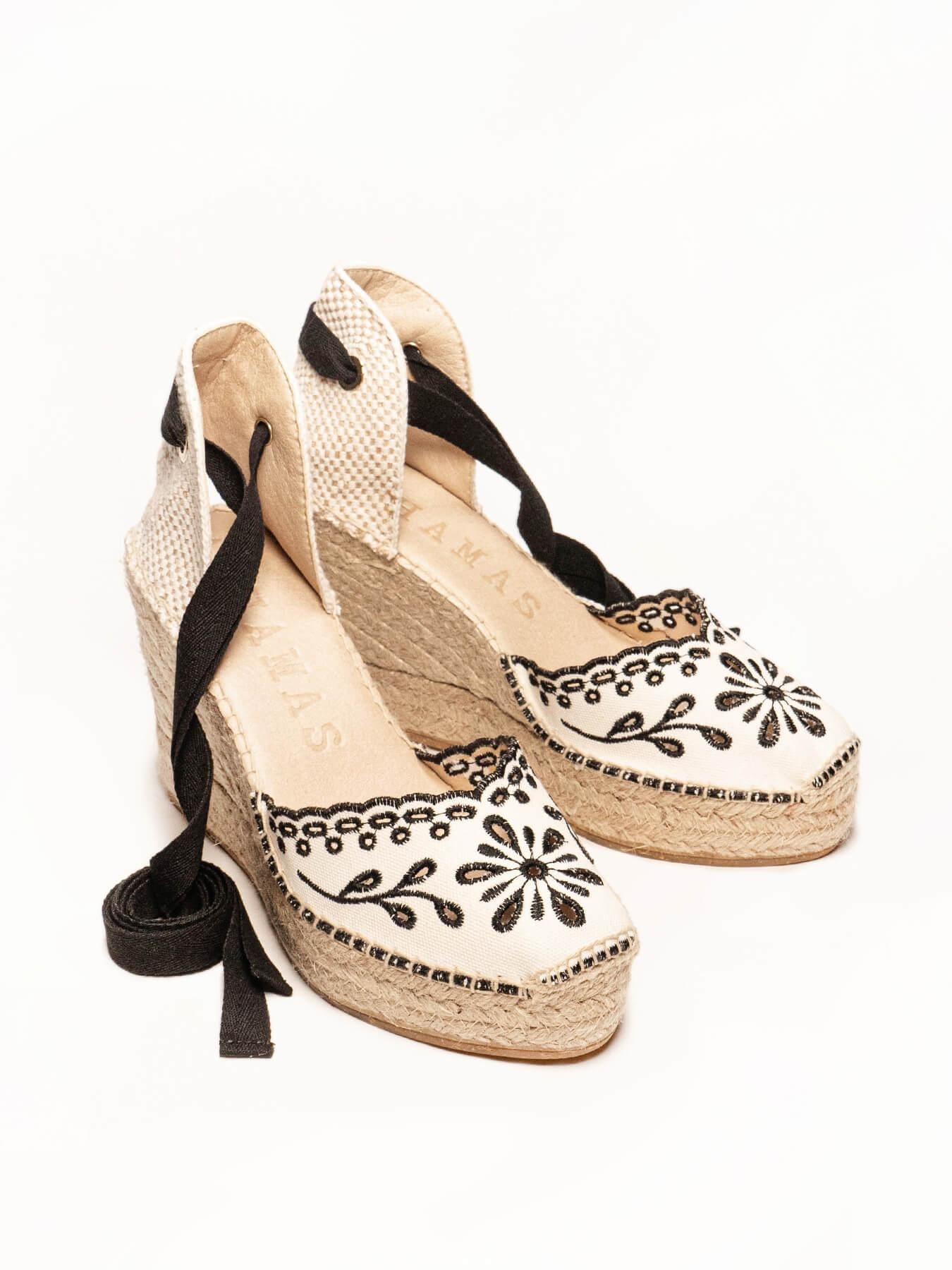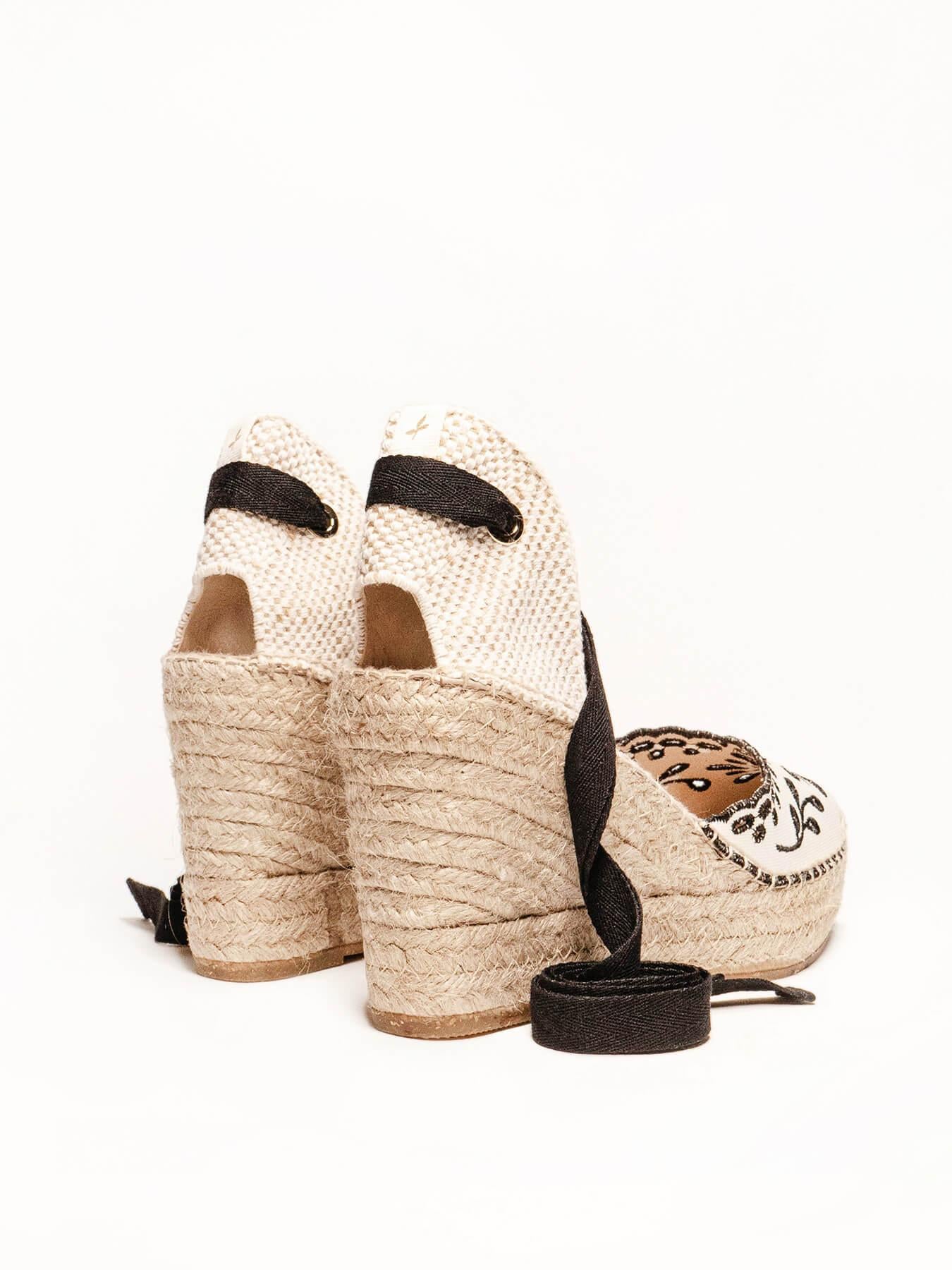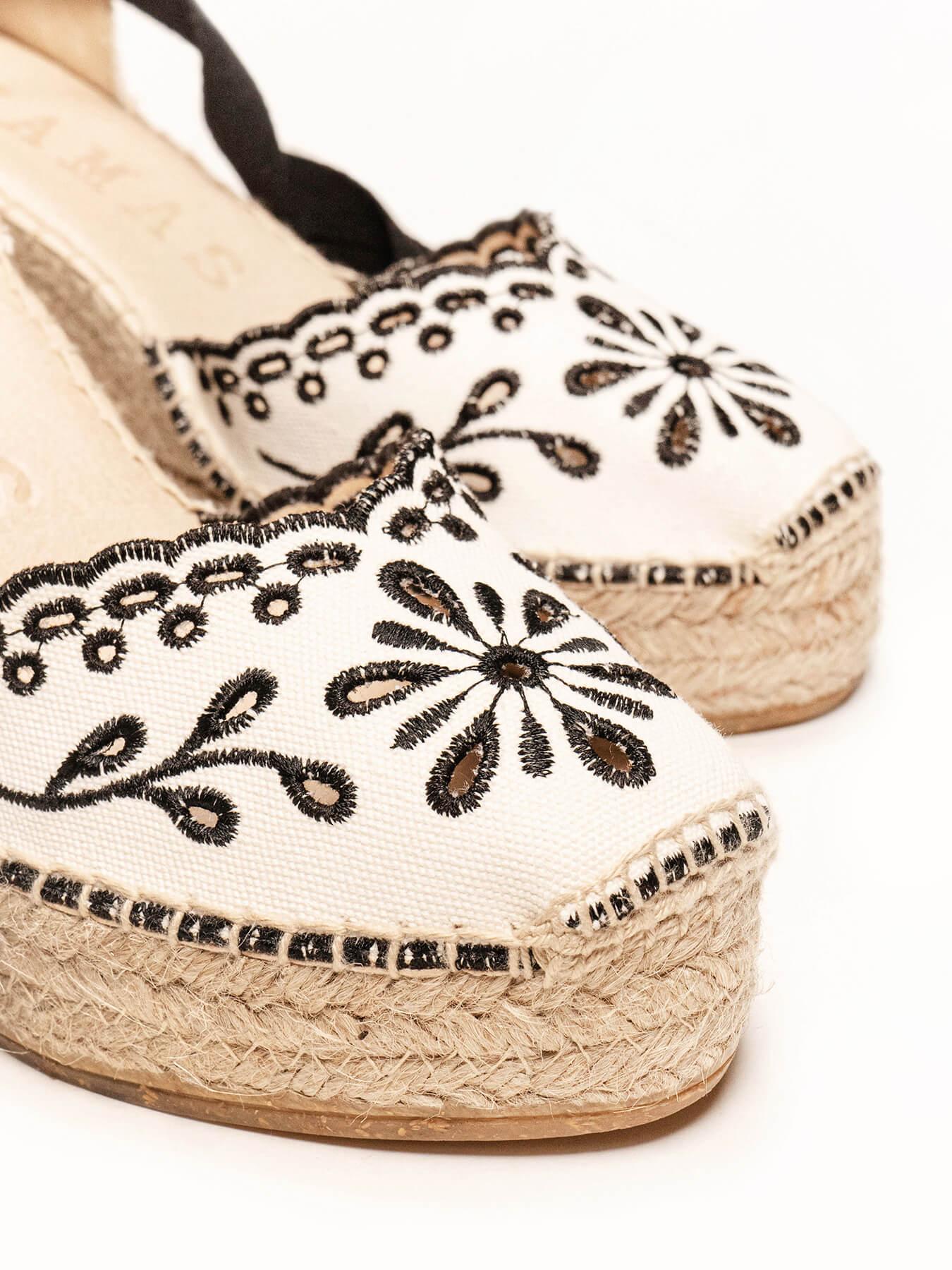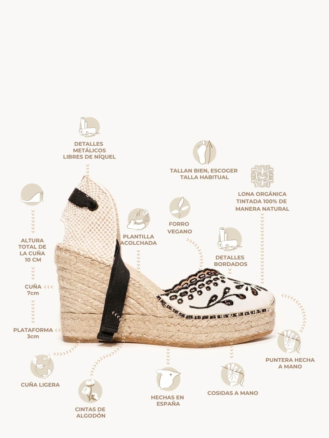 - O tecido bordado da sandália anabela Romero é de algodão orgânico tingido com corantes 100% naturais.