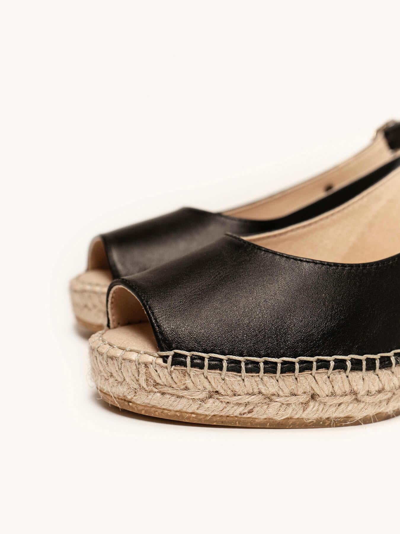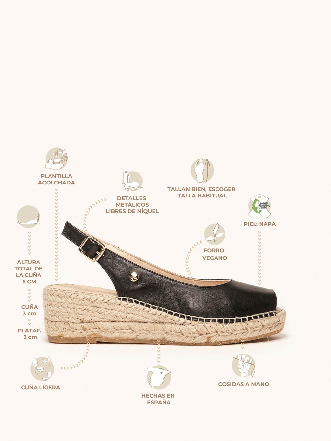 A Napa da sandália Clavel está certificada pelo Leather Working Group (uma organização que promove práticas ambientais sustentáveis). O forro e a palmilha são de microfibra respirável e antibacteriana. Anabela de trança de juta natural com sola de borracha reciclada misturada com fibras naturais. Elementos metálicos livres de níquel. Linha de algodão costurada à mão.