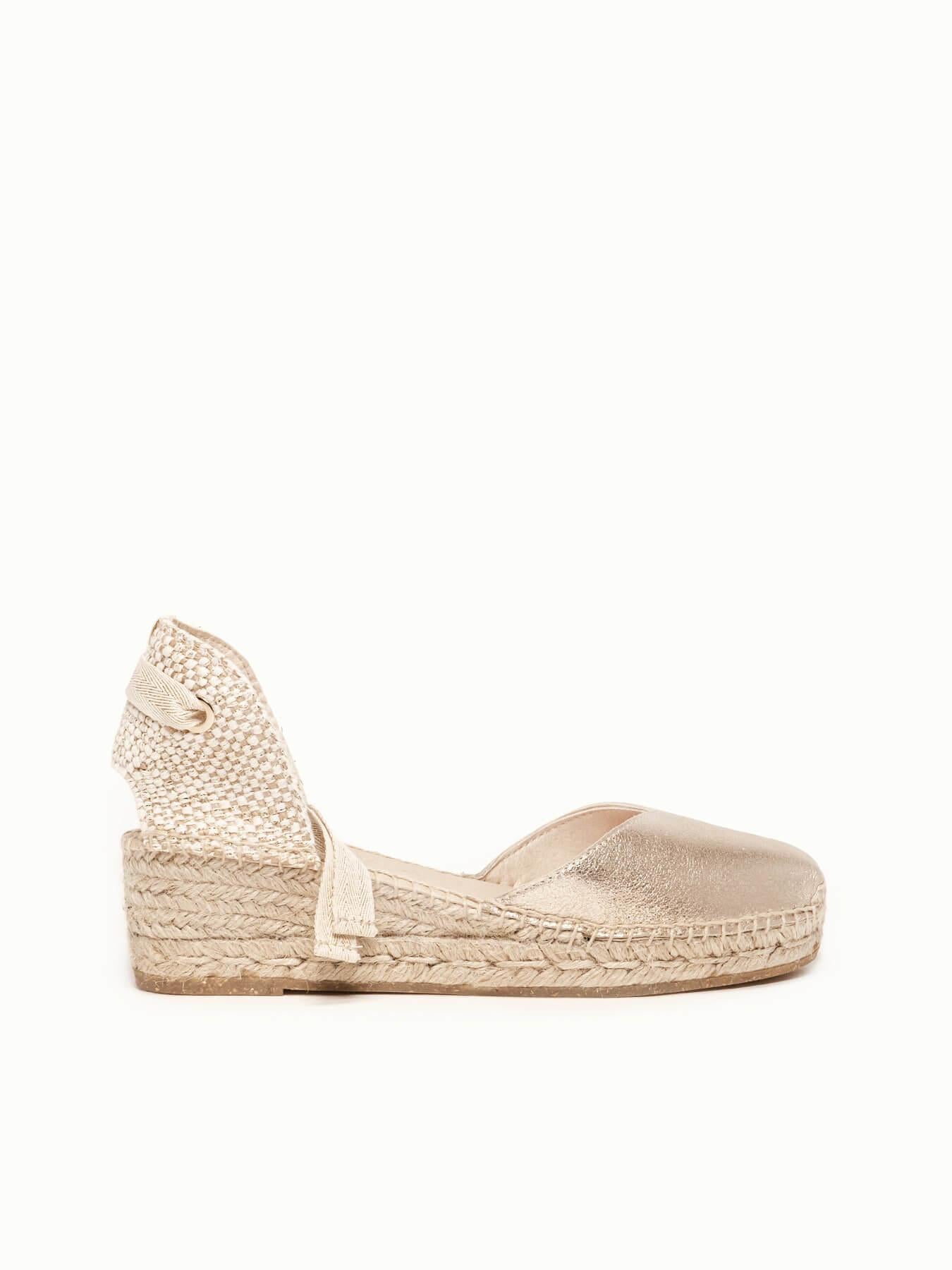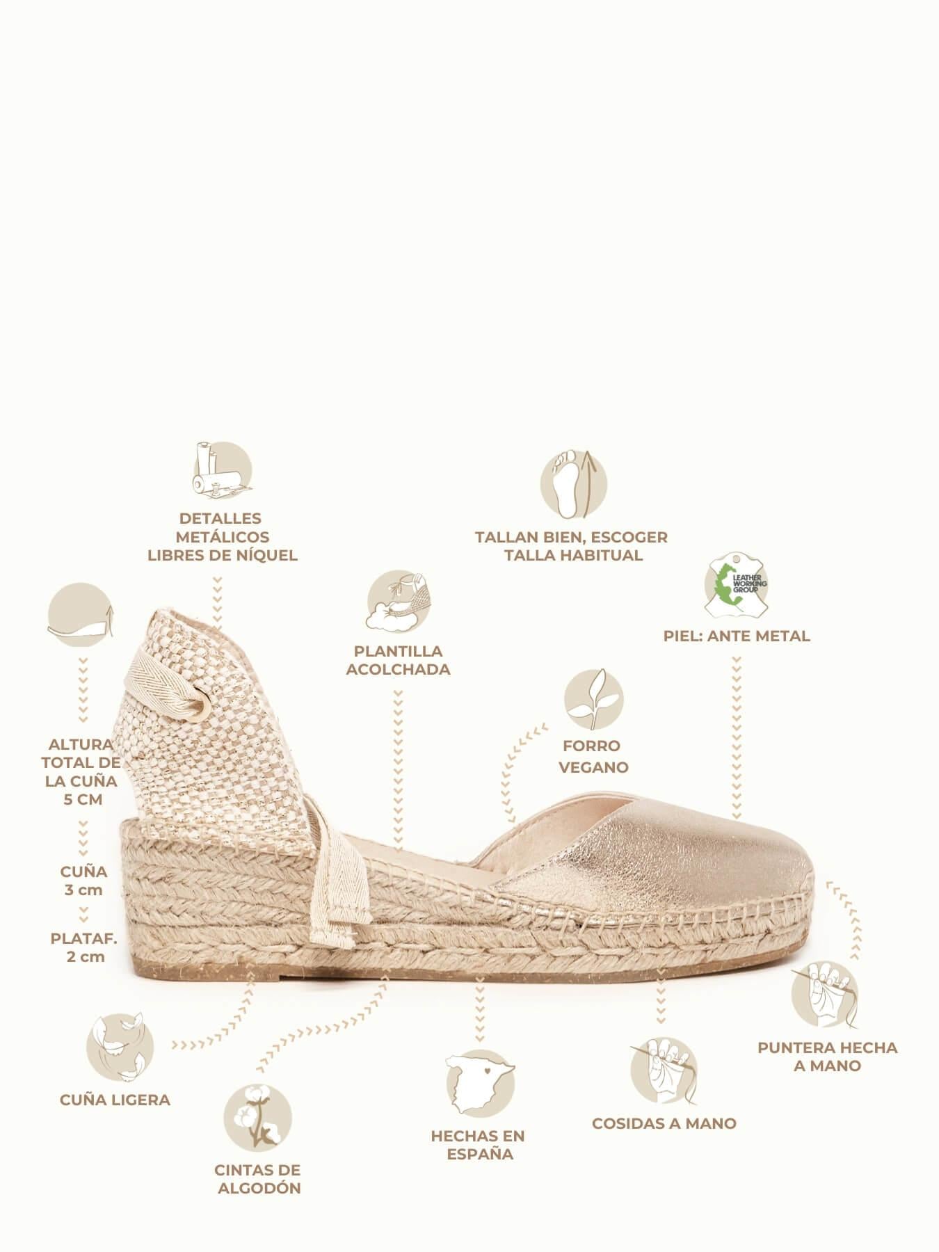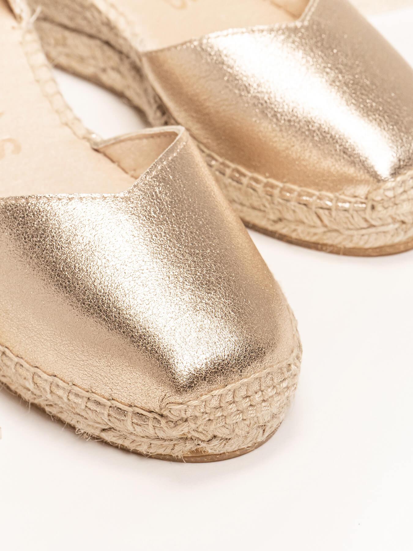 Sandália Anabela Baixa Romero Camurça Dourado Metalizado