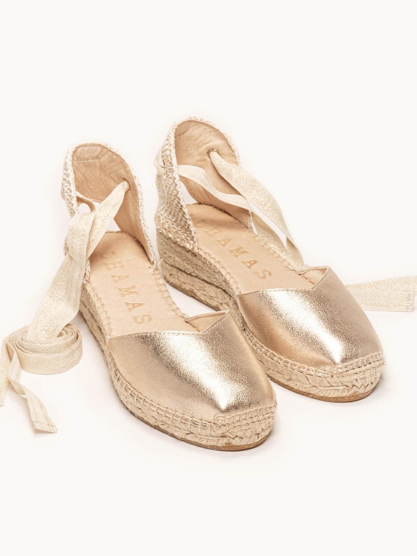 A sandália anabela baixa Romero é o nosso modelo mais icônico. Uma sandália valenciana com decote coração e fitas que você poderá usar com seus looks especiais e também com os do dia a dia. Você pode dar um toque especial porque as fitas podem ser trocadas.