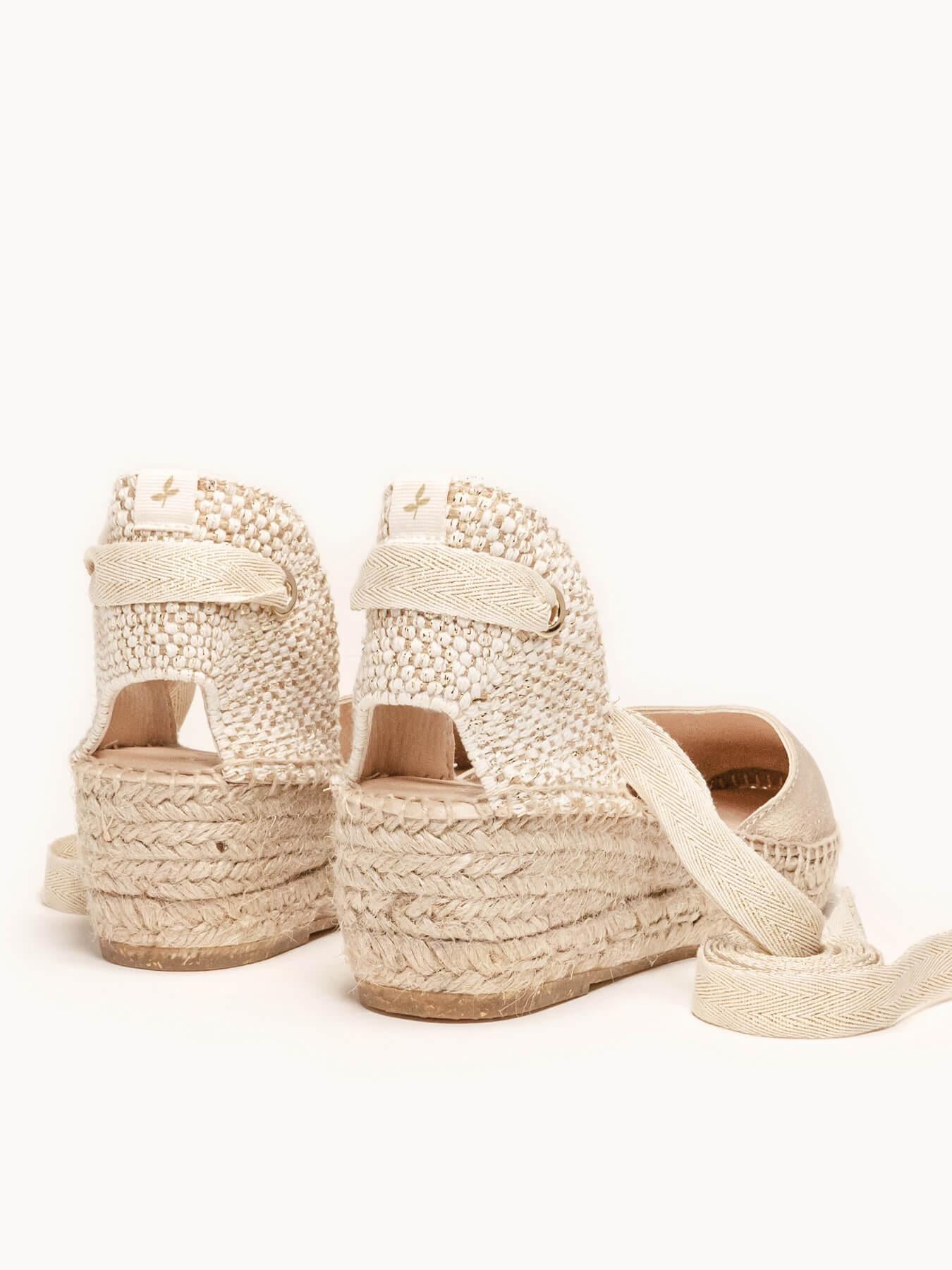 - Anabela trançada de juta natural com sola de borracha reciclada misturada com fibras naturais