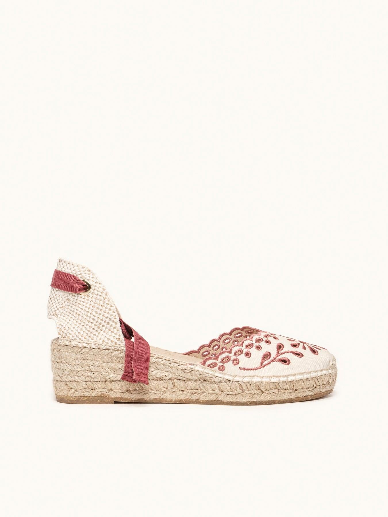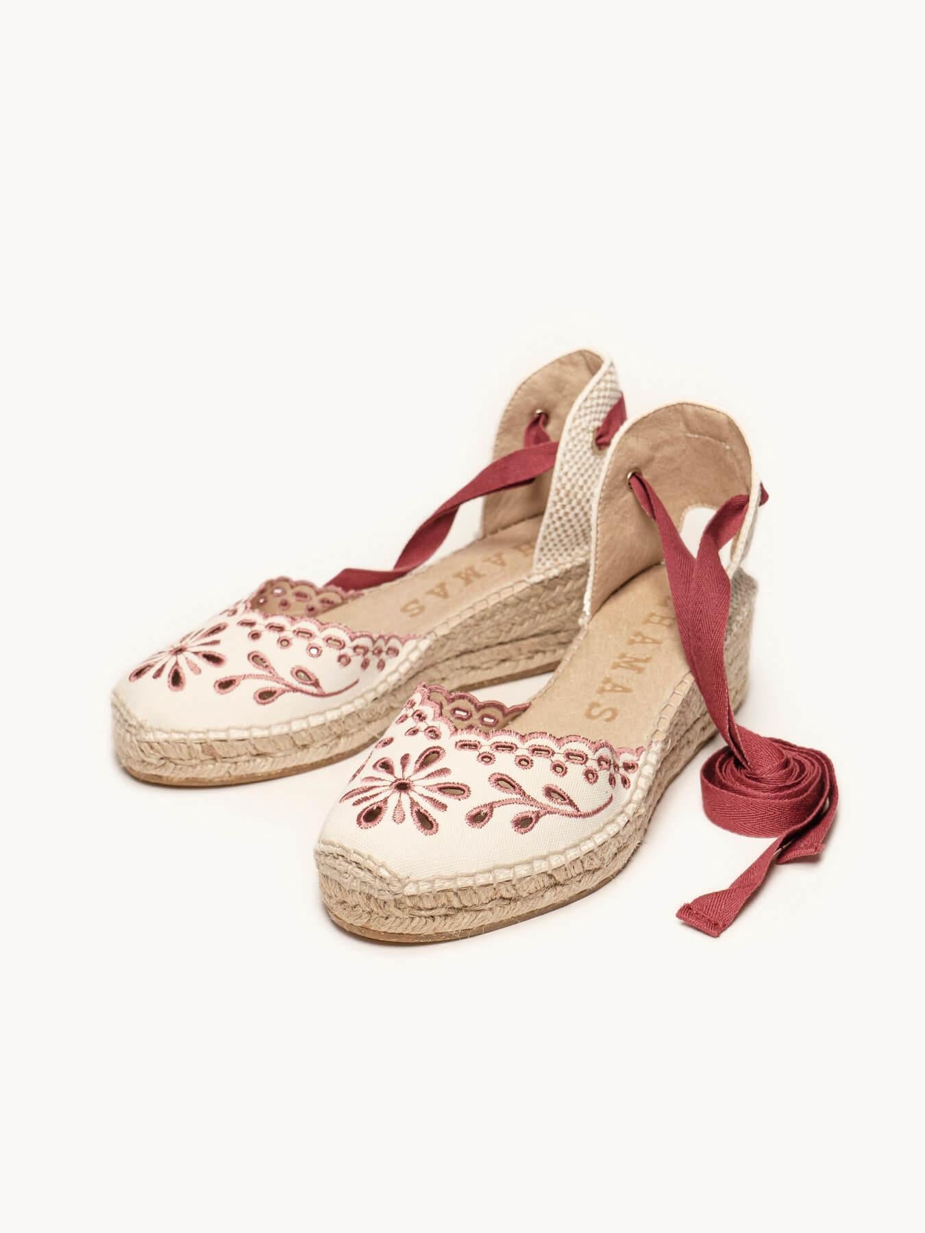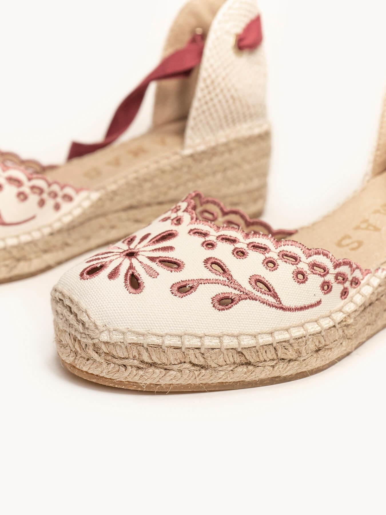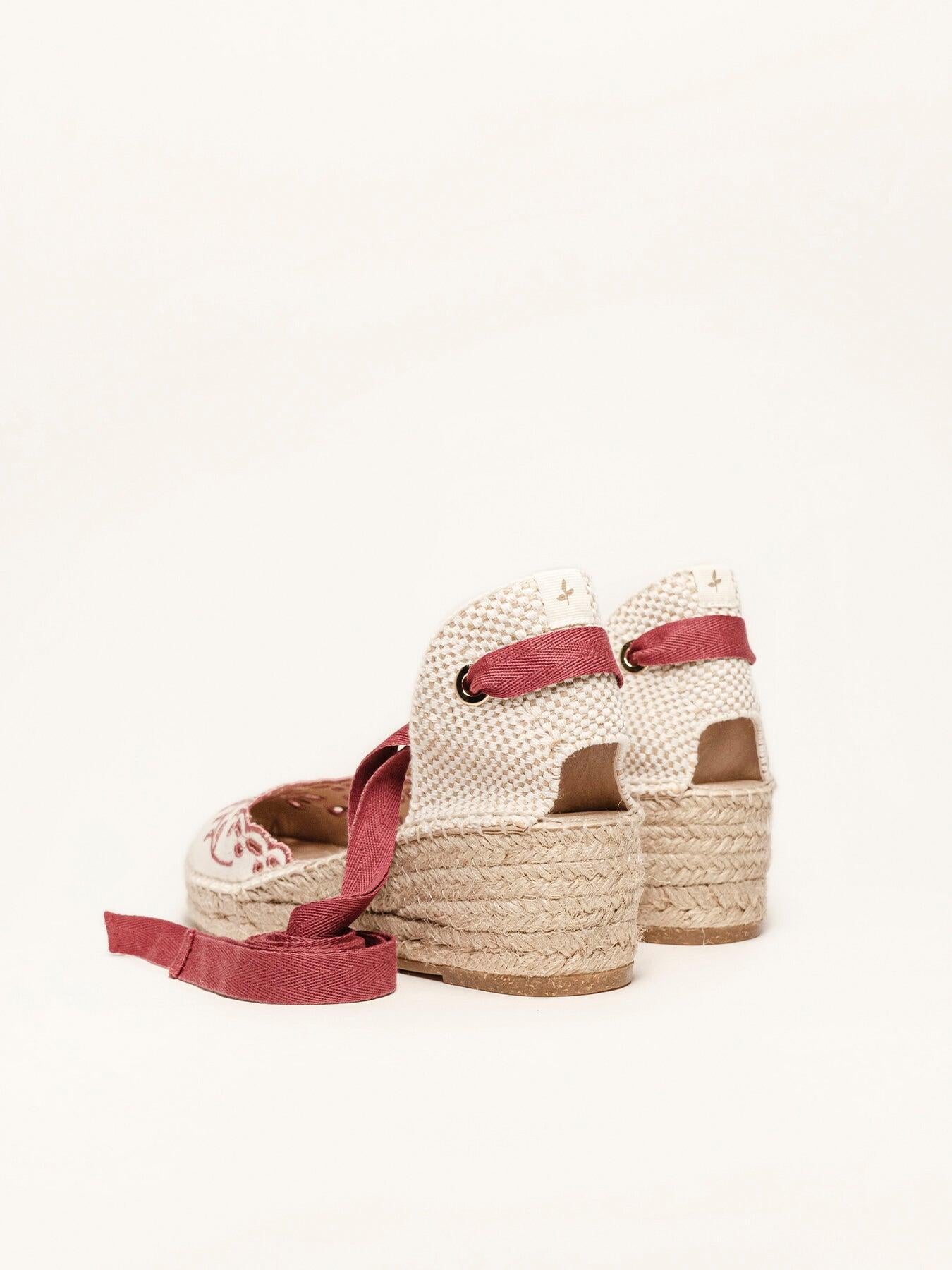 Sandália Anabela Baixa Romero Lona Bordada Grená