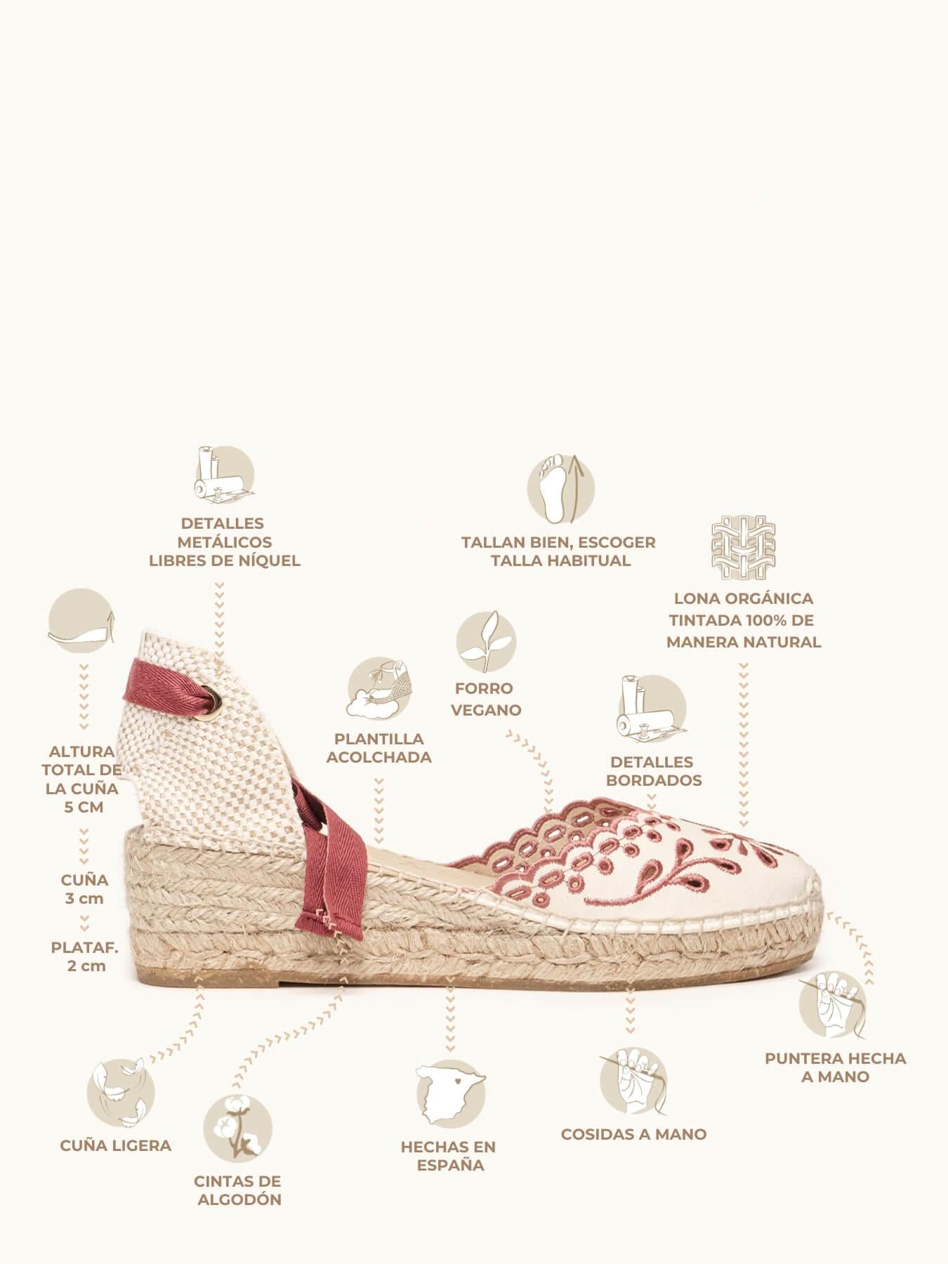 - Anabela de trança de juta natural com sola de borracha reciclada misturada com fibras naturais.