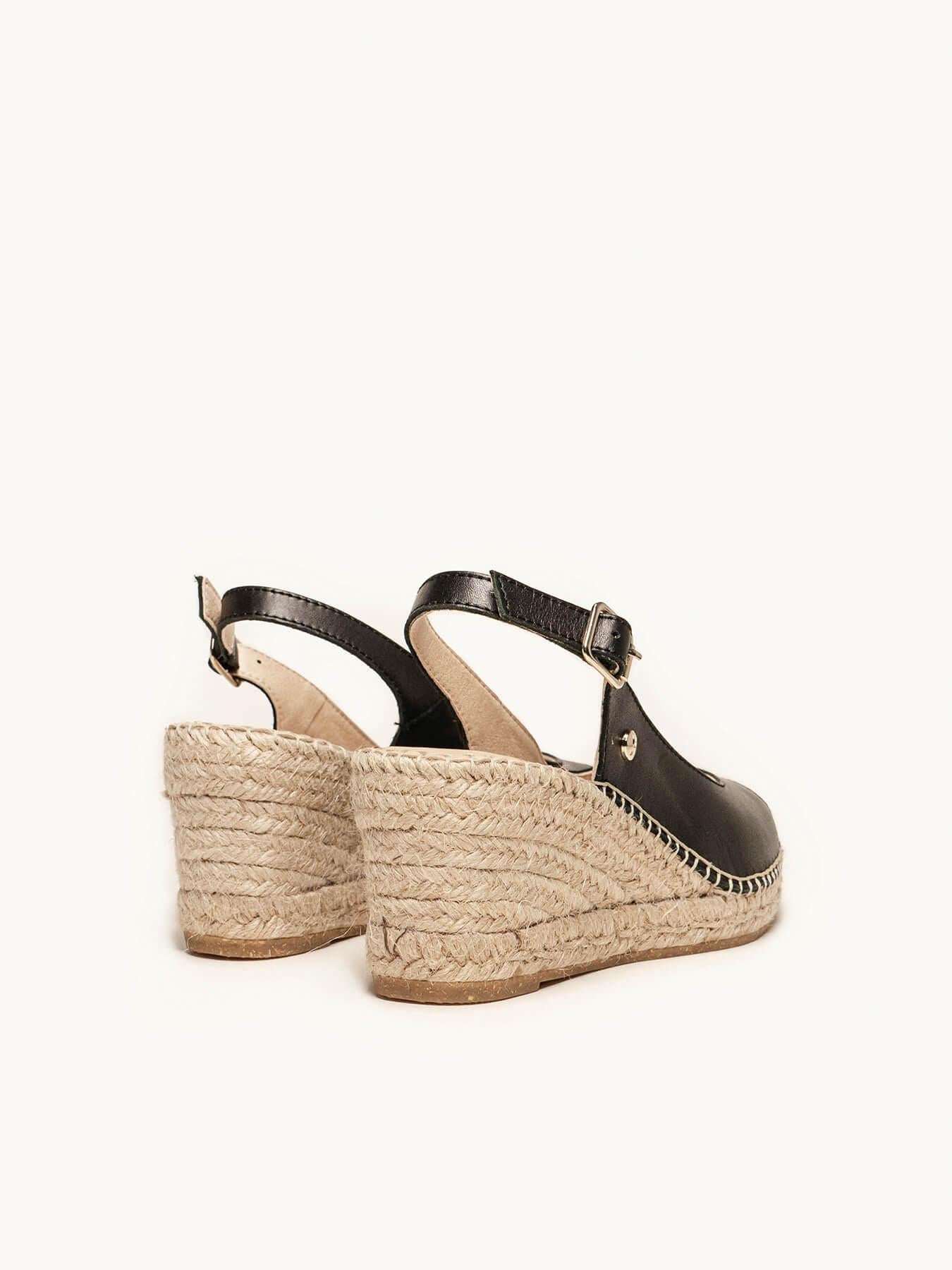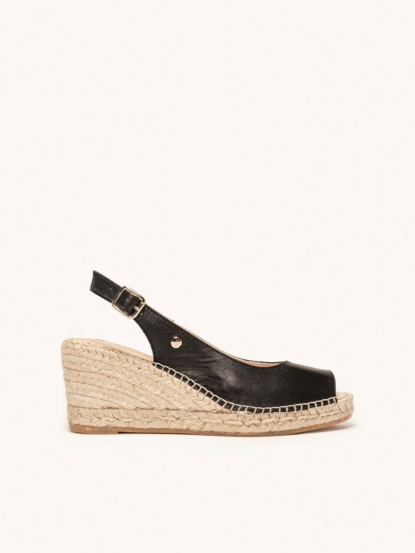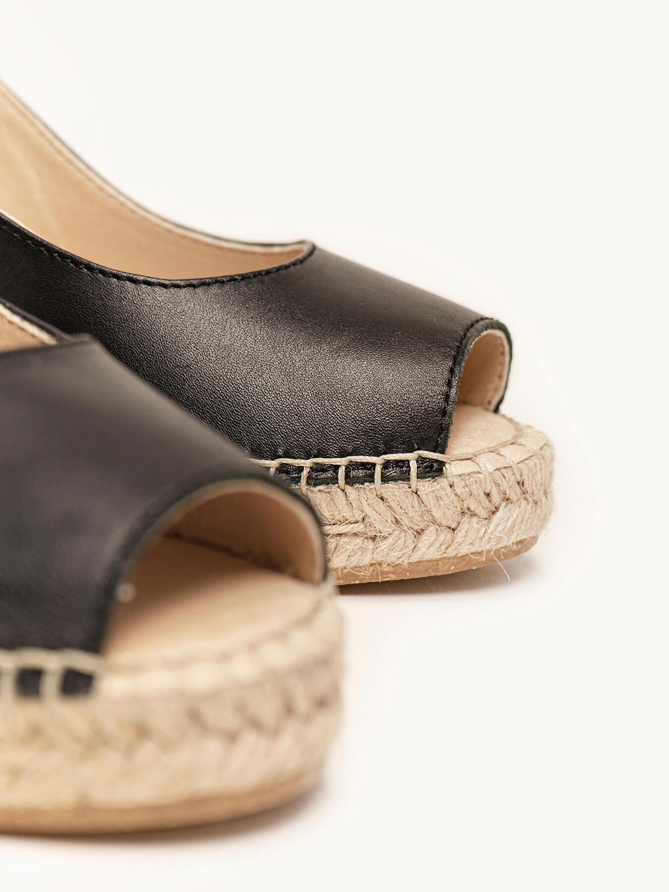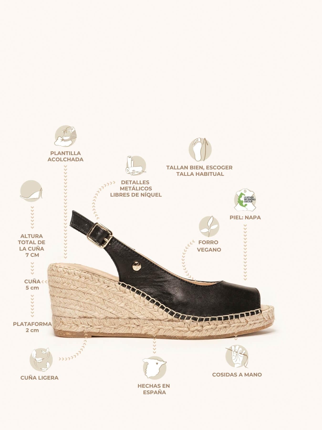 - A Napa da sandália Clavel está certificada pelo Leather Working Group (uma organização que promove práticas ambientais sustentáveis). O forro e a palmilha são de microfibra respirável e antibacteriana. Anabela de trança de juta natural com sola de borracha reciclada misturada com fibras naturais. Elementos metálicos livres de níquel. Linha de algodão costurada à mão.