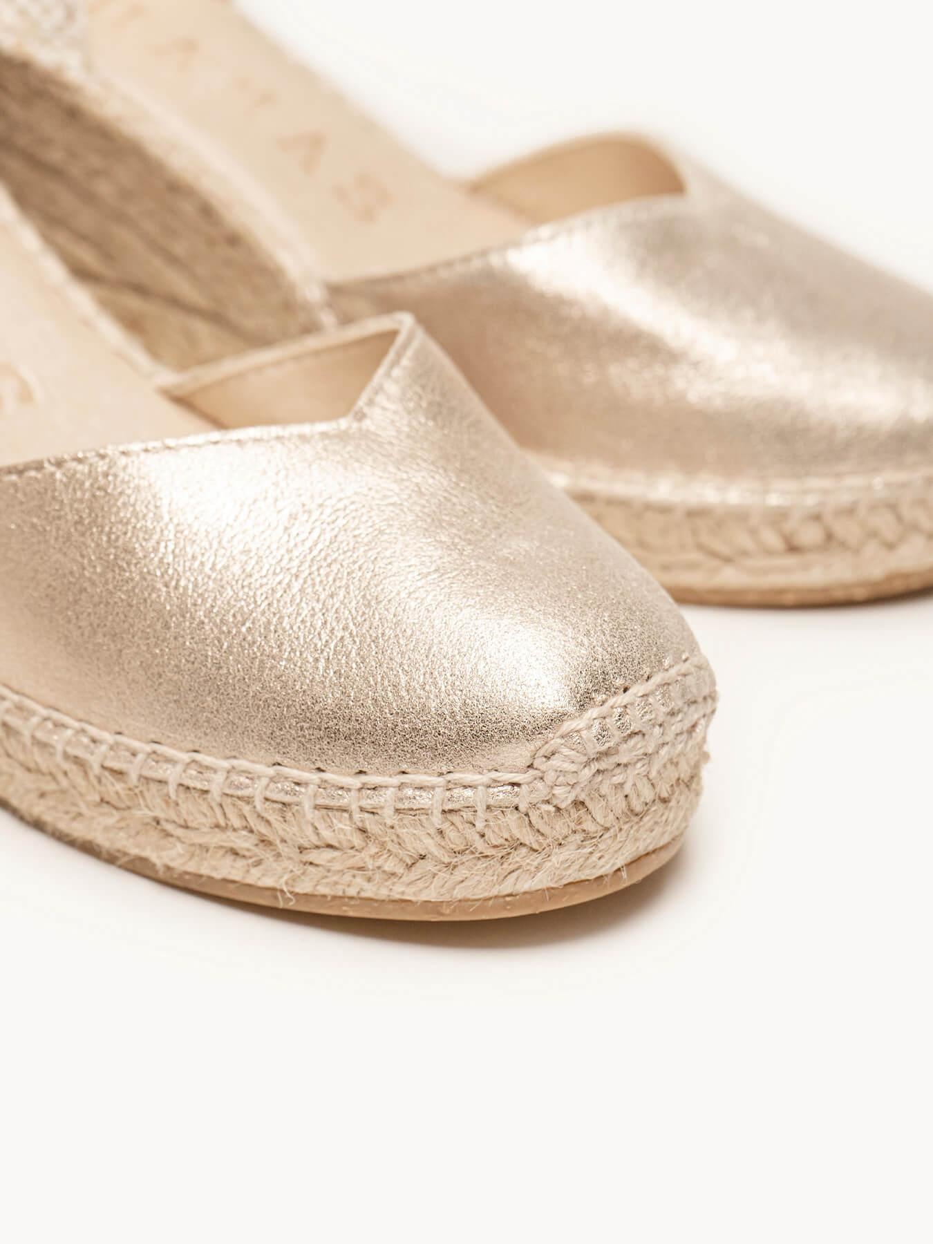 Sandália Anabela Média Jara Camurça Dourado Metalizado
