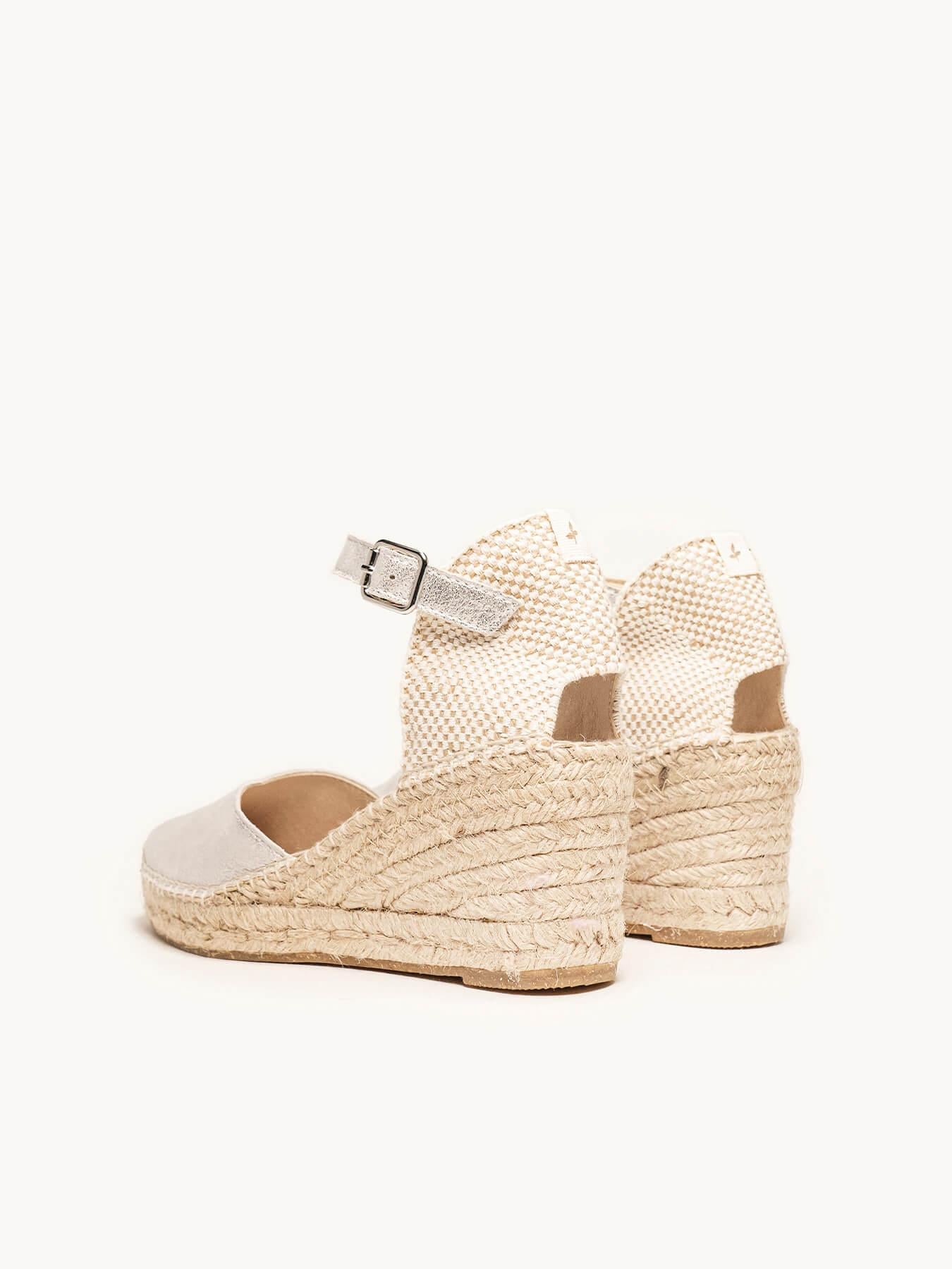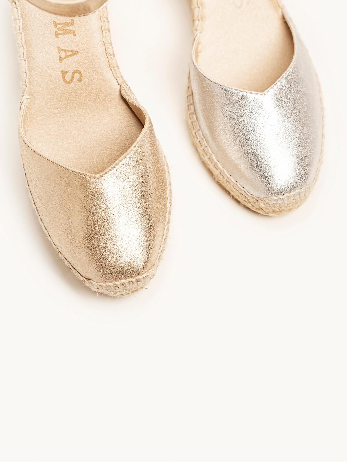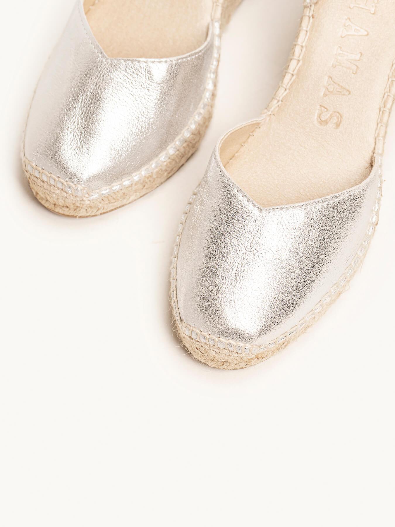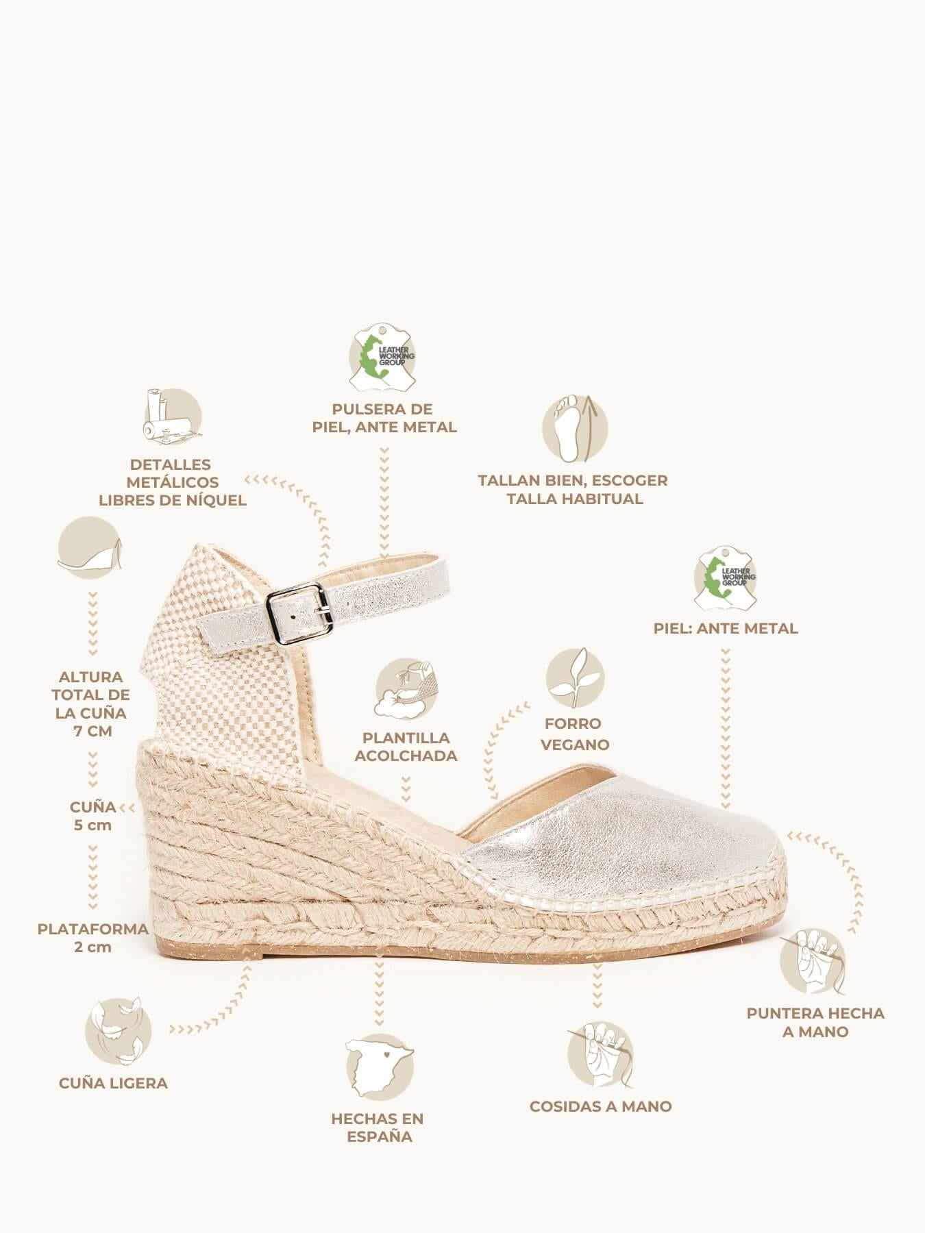 - A camurça metalizada da sandália anabela Jara está certificada pelo Leather Working Group (uma organização que promove práticas ambientais sustentáveis)