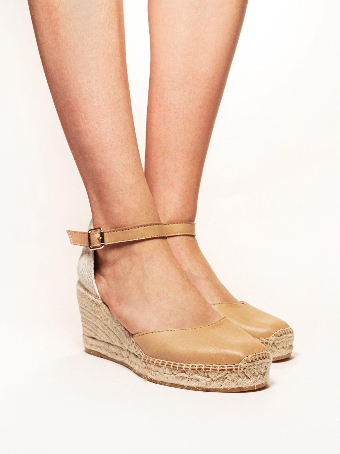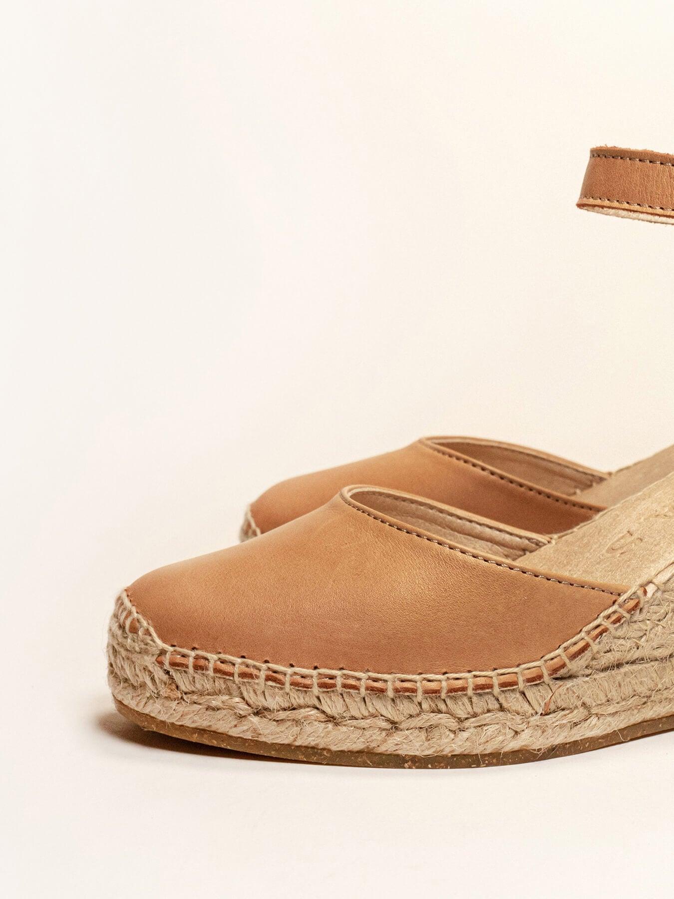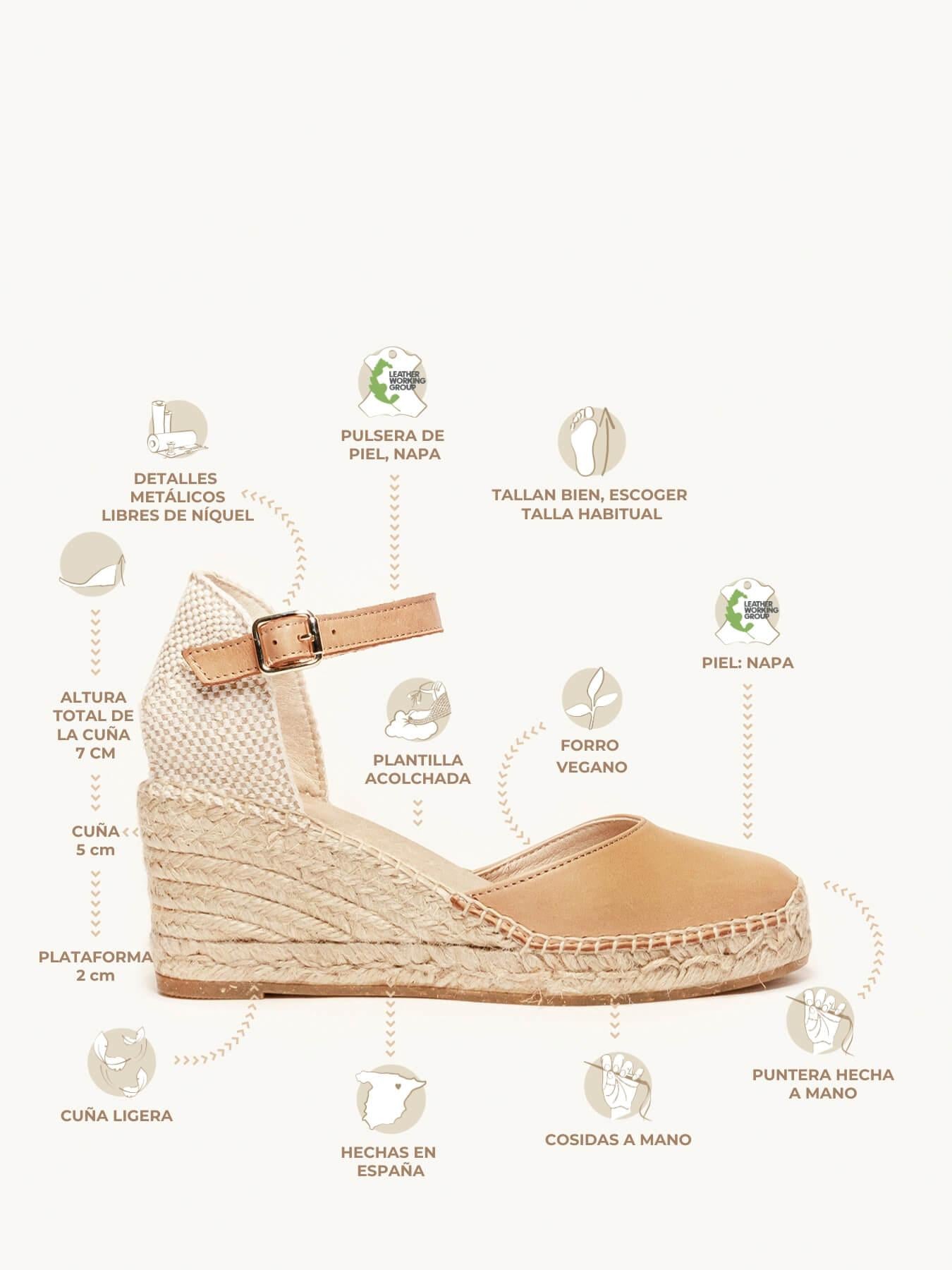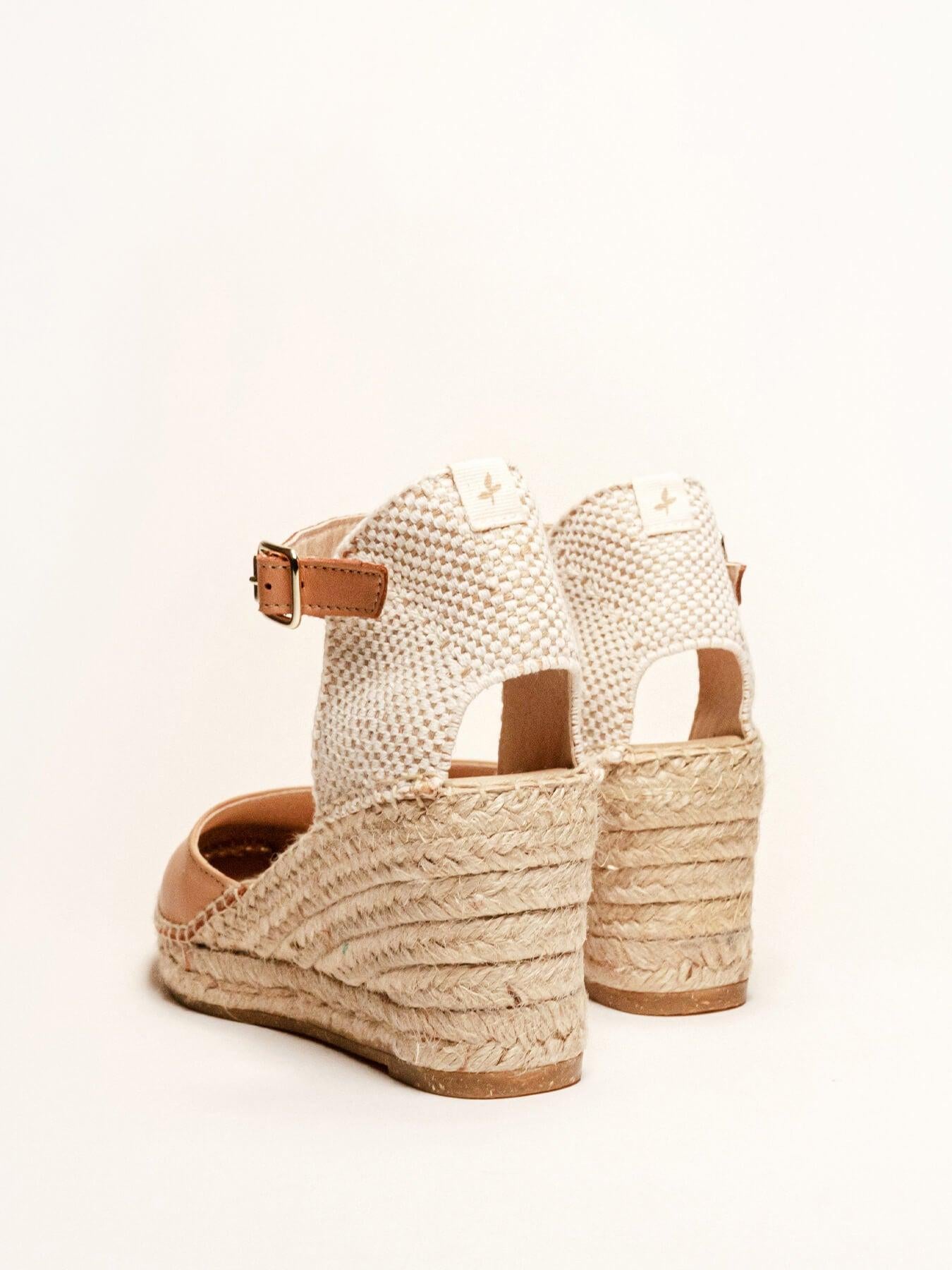 - Anabela trançada de juta natural com sola de borracha reciclada misturada com fibras naturais.