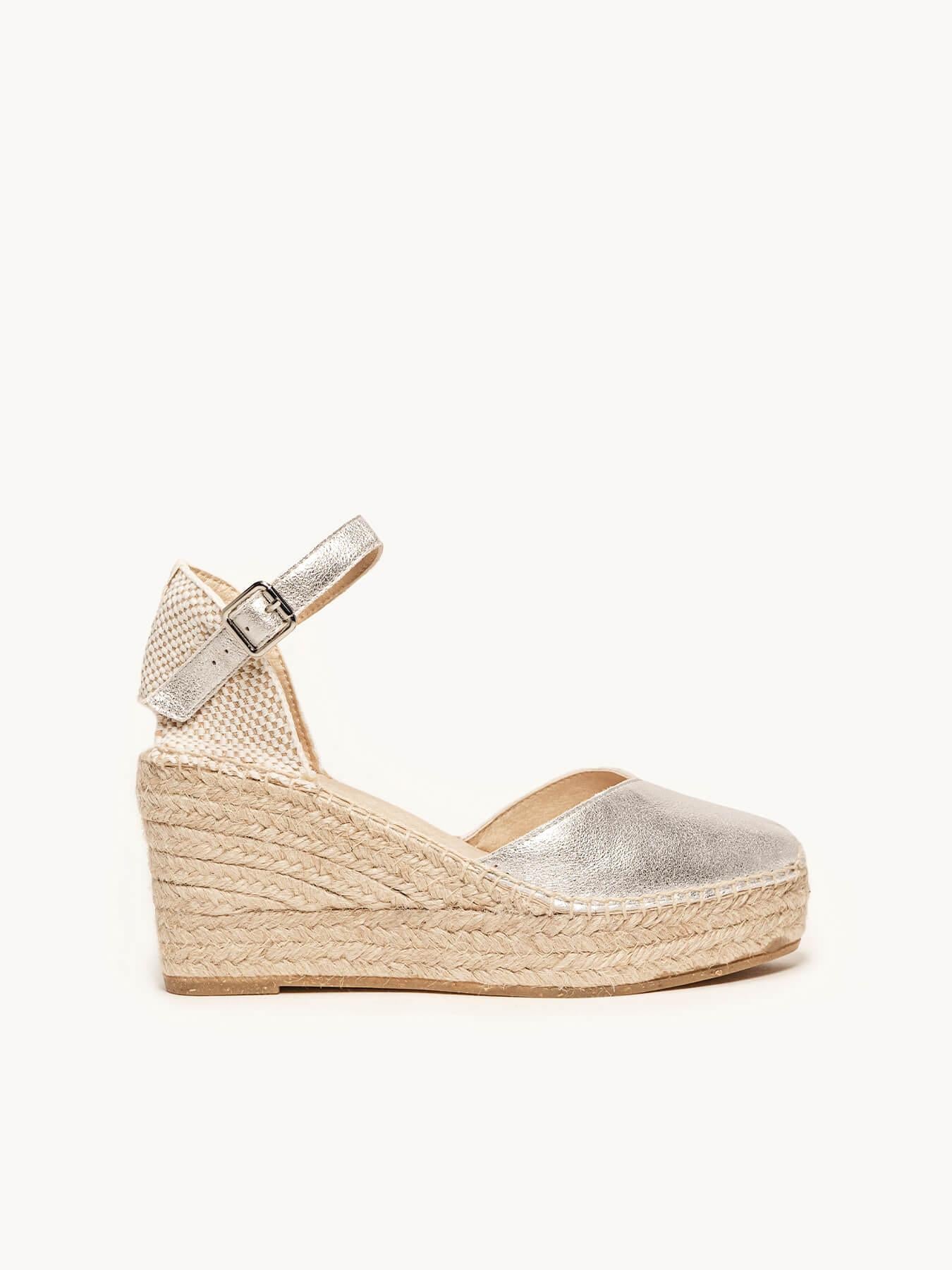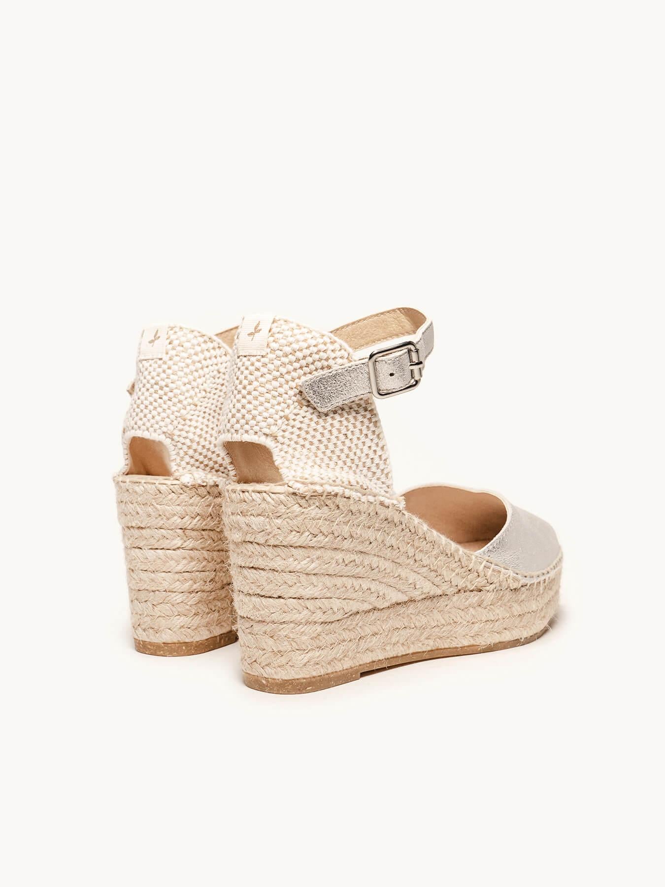 - Anabela trançada em juta natural com sola de borracha reciclada, misturada com fibras naturais.