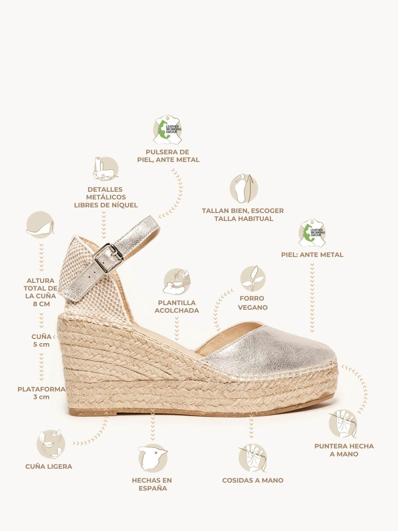 - A camurça metalizada da sandália Jara está certificada pelo Leather Working Group (uma organização que promove práticas ambientais sustentáveis)