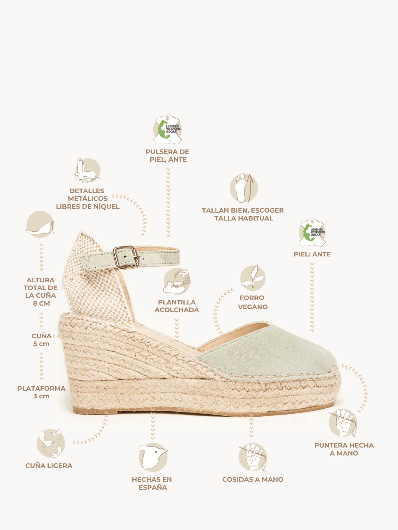 - A camurça da sandália Jara está certificada pelo Leather Working Group (uma organização que promove práticas ambientais sustentáveis)