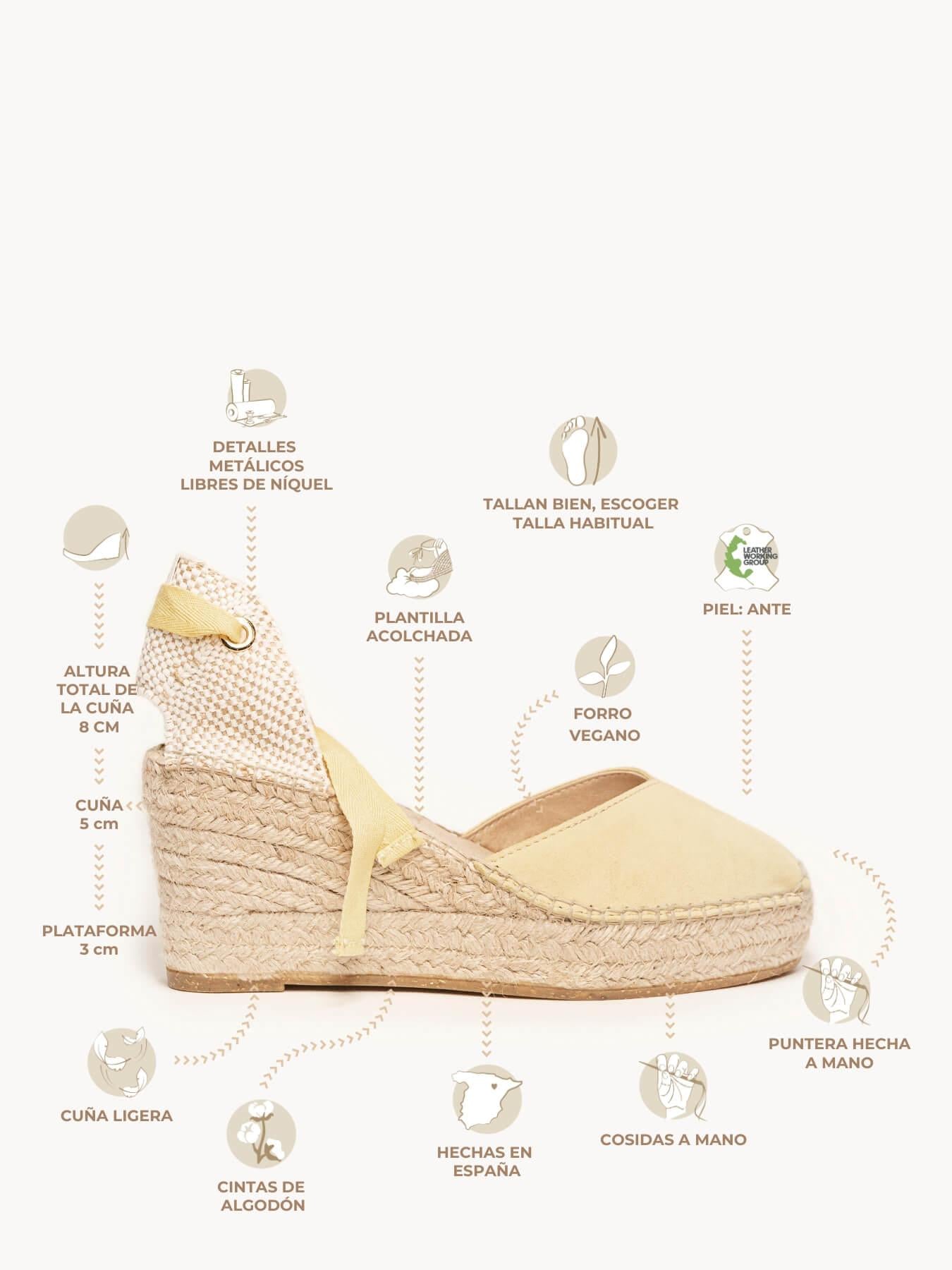 A sandália anabela média Plataforma Romero é o nosso modelo mais icônico. Uma sandália valenciana com decote coração e fitas que você poderá usar com seus looks especiais e também no dia a dia. Você poderá dar um toque especial porque as fitas podem ser trocadas.