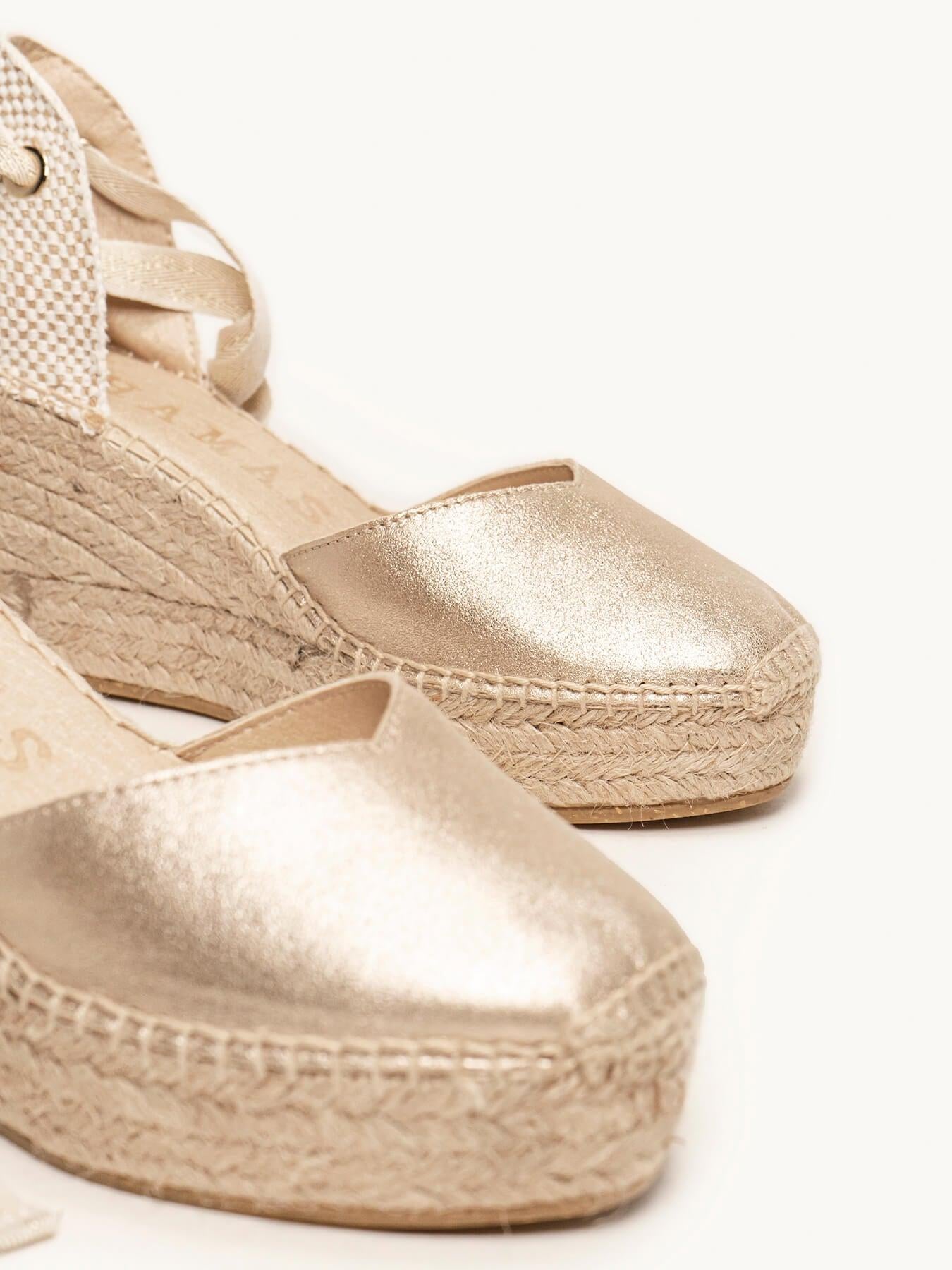 Sandália Anabela Média Plataforma Romero Camurça Dourado Metalizado