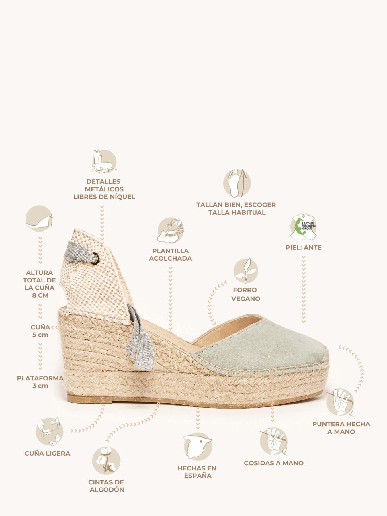 A sandália anabela Média anabela Romero é o nosso modelo mais icônico. Uma sandália valenciana com decote em coração e fitas que você poderá usar com seus looks especiais e também no dia a dia. Você poderá dar um toque especial porque as fitas podem ser trocadas.