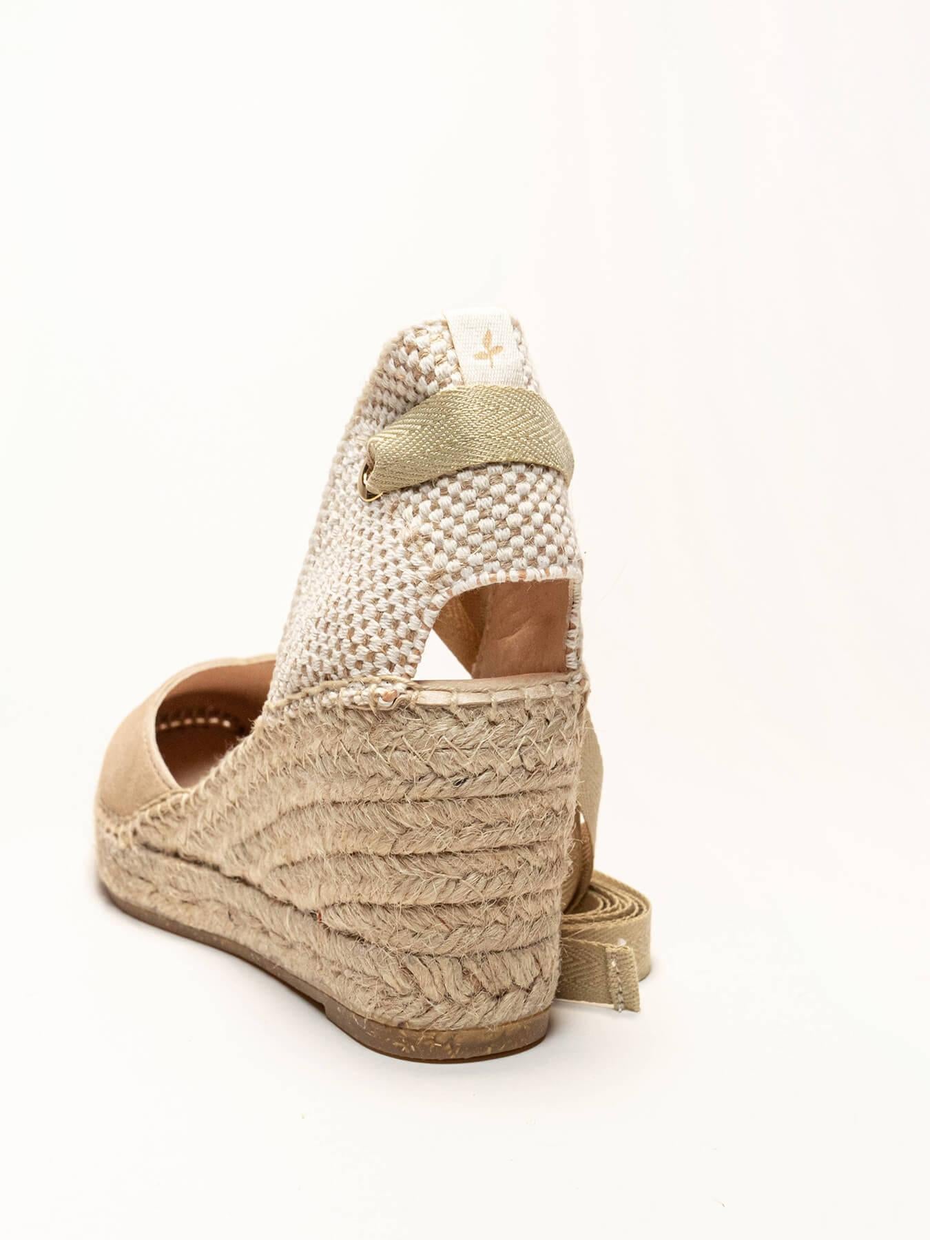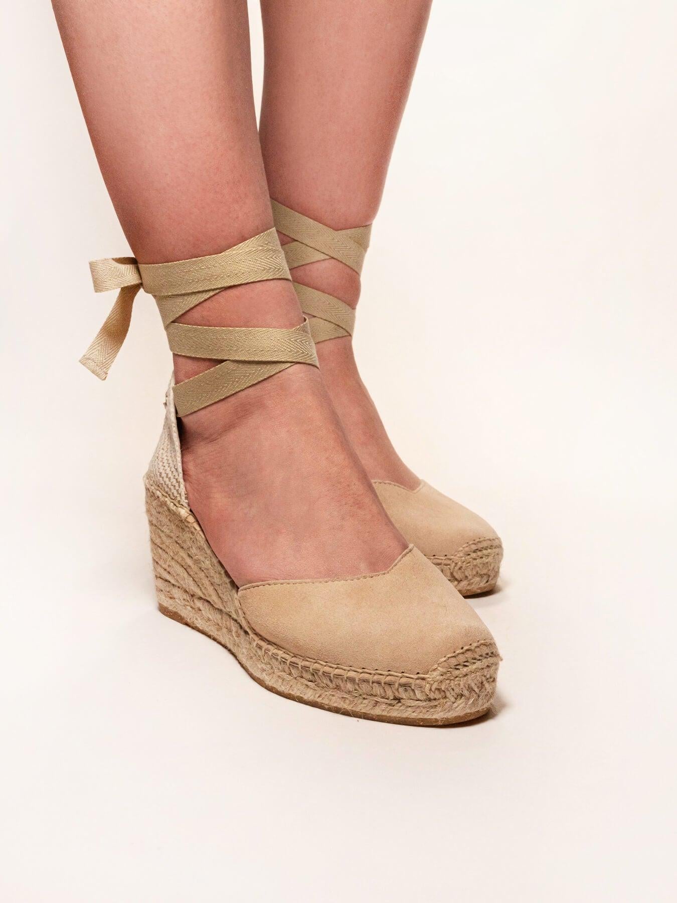 A sandália anabela média Romero é o nosso modelo mais icônico. Uma sandália valenciana com decote em coração e fitas que você poderá usar com seus looks especiais e também no dia a dia. Você pode dar um toque especial porque as fitas podem ser trocadas.