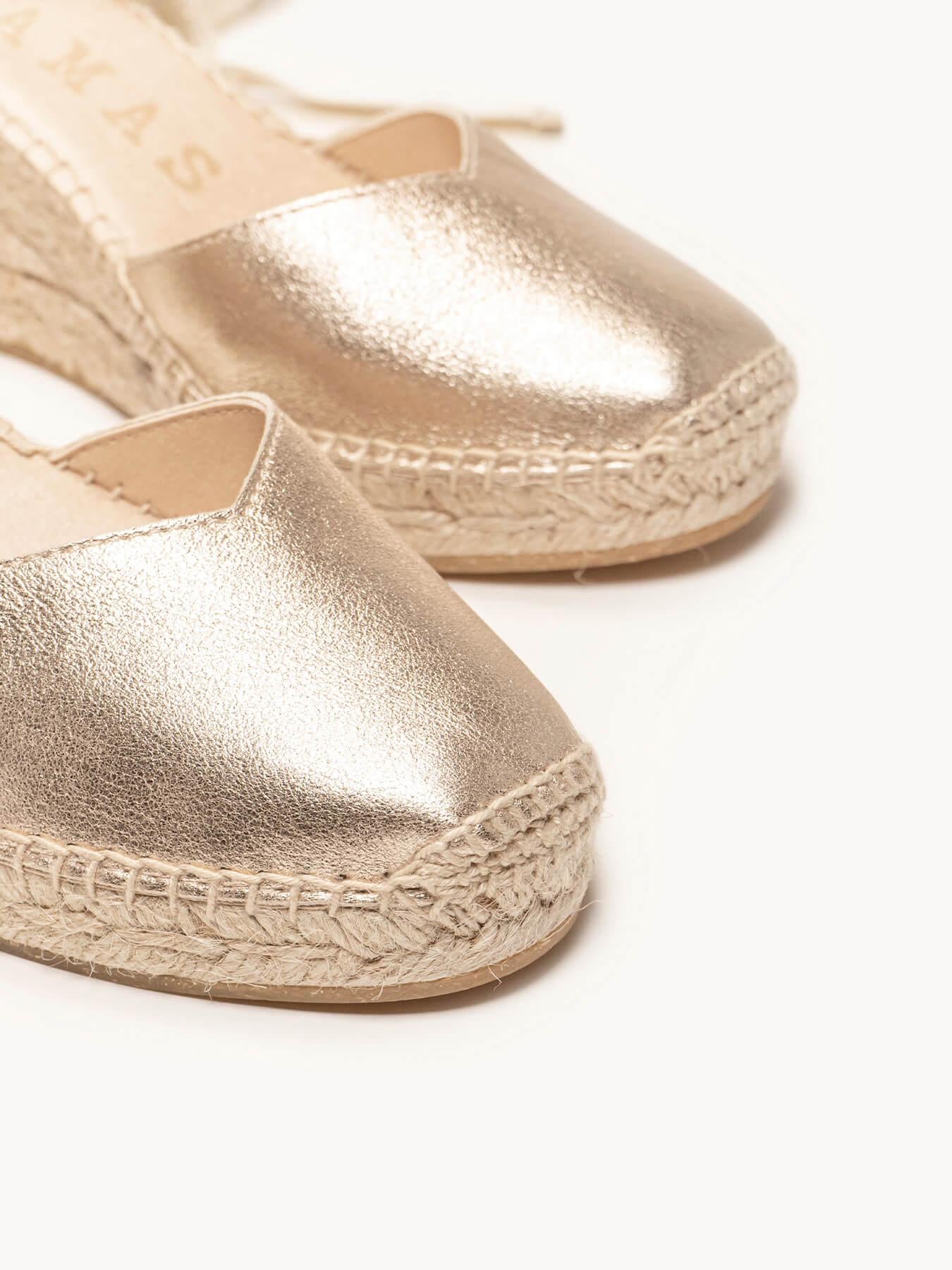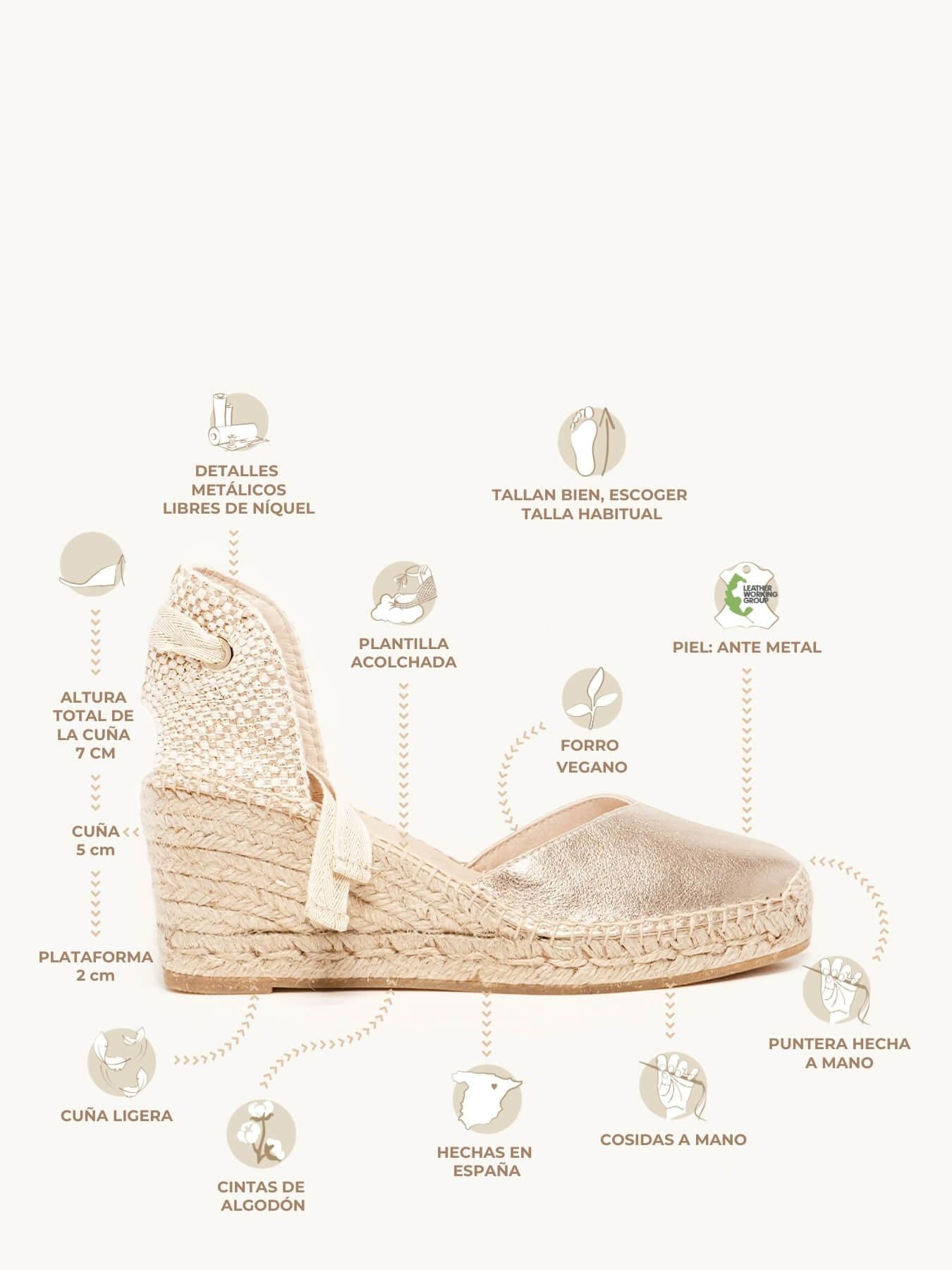 A camurça metalizada da sandália anabela Romero está certificada pelo Leather Working Group (uma organização que promove práticas ambientais sustentáveis)