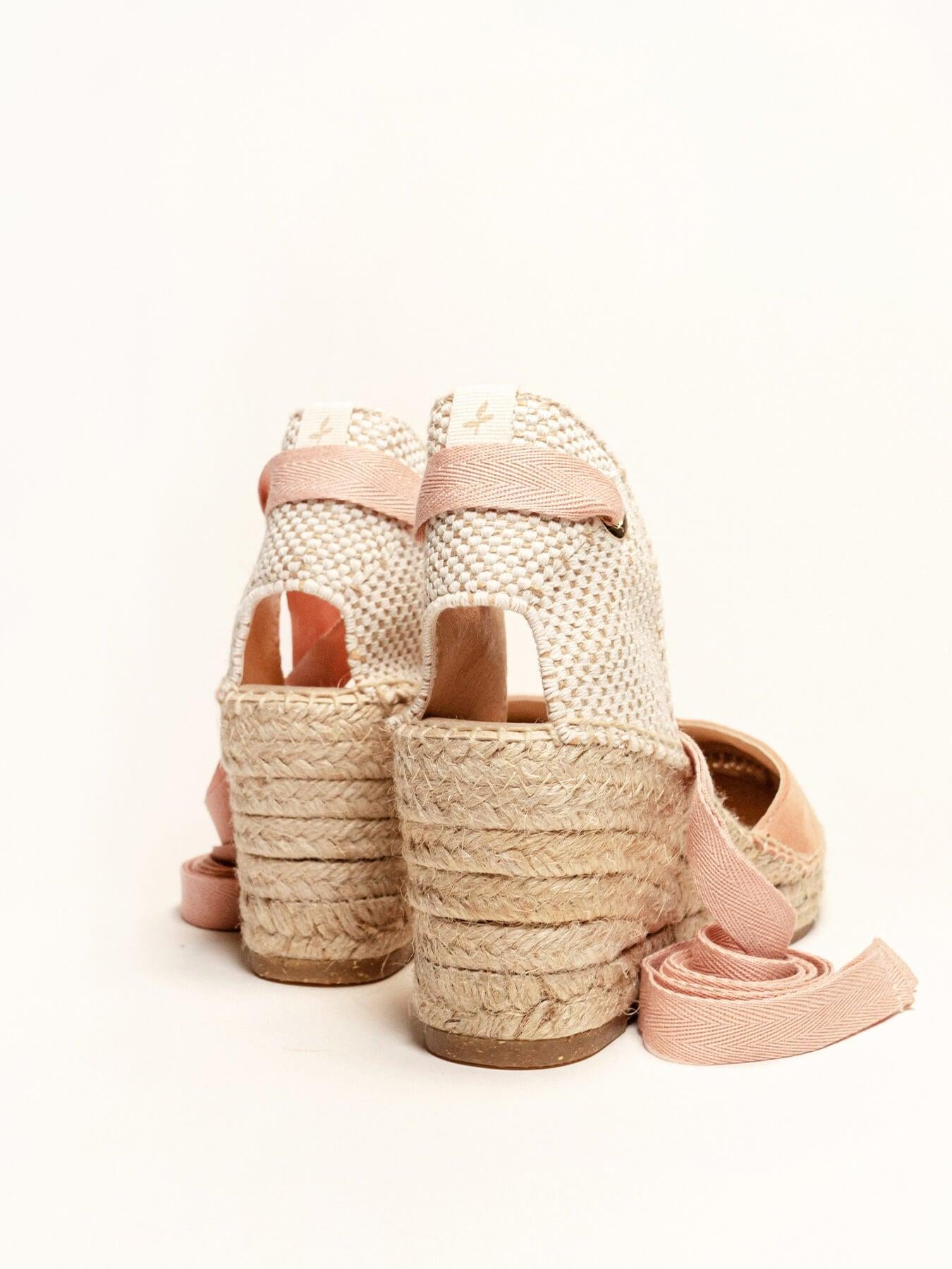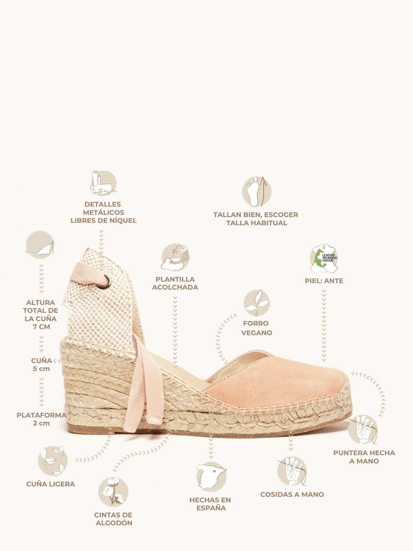 - Anabela de trança de juta natural com sola de borracha reciclada misturada com fibras naturais.